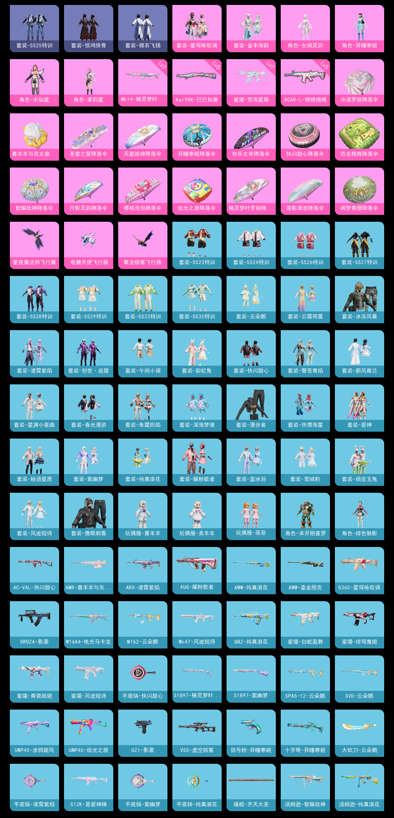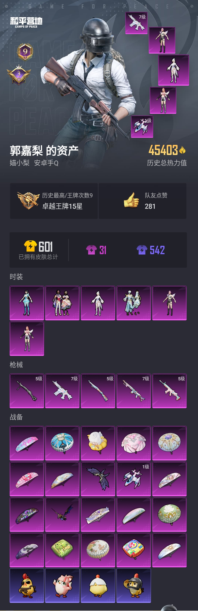【和平精英】【lyhp16832】6粉装5特效呛 女娲灵识 满级妹控 满级蜜獾 6粉装,5特效呛,0载具,历史最高段位:卓越王牌15星 王牌印记9次 热力值:45403,115套装,144呛械,221装备,103战备;套装:角色-茉莉星,角色-水仙星,套装-金丰海韵,角色-异瞳寒姬,角色-女娲灵识,套装-星穹咏叹调,套装-特训学院,套装-猎鹰,套装-青年教官,套装-橘黑制服,套装-红色运动,套装-黄色运动,套装-蓝色运动,套装-黄色伏地魔,套装-白色伏地魔,套装-黑色伏地魔,套装-竞技名士,套装-深蓝色名流,套装-酒红色名流,套装-湖蓝色名流,套装-黄色名流,套装-猛禽,套装-野性山猫,套装-长空猛禽,套装-漫步者,套装-海岛探路者,套装-旭日情侣,套装-灼焰舞者,套装-青春校园,套装-春日漫步,套装-燃烧卡路里,套装-鹰眼刺客,套装-冰冻风暴,套装-暗金炫舞,套装-魅力单车,套装-绮丽涂鸦,套装-竞技达人朋克,套装-野性战心,套装-都市魅力,套装-荣耀,套装-青涩时光,套装-缤纷果语,套装-龙魂突击队,套装-极速红龙,套装-破蛋小黄鸡,套装-鹤鸣,套装-霓虹街区,套装-爱神,套装-顽皮玉兔,套装-白糯汤圆,套装-战术大师,套装-耀粉歌者,套装-热情海星,套装-纯真浪花,套装-虎虎生威吉莉,套装-绯格组合,套装-ss23特训,套装-王牌教练,套装-柠萌假日,套装-ss24特训,套装-龟仙人,套装-ss25特训,套装-惊鸿侠骨,套装-锦衣飞扬,套装-云霞荷露,套装-深海梦境,套装-龙的传人,套装-冰河战士,套装-ss26特训,套装-快闪甜心,套装-春光漫游,套装-漫游都市,套装-空岛之星,套装-云魄琉璃,玩偶服-菲菲,套装-ss27特训,套装-恋语绒绒,套装-老实芭蕉,套装-ss28特训,角色-米开朗基罗,套装-新风雅兰,套装-海盐绵绵冰,套装-蝶变,套装-创世·追猎,套装-ss29特训,角色-绯色魅影,套装-异域银装,角色-光矢逐梦,套装-ss31特训,套装-紫幽梦,套装-ss33特训,套装-云朵鹅,套装-巳巳如意,套装-ss32特训,套装-彩虹兔,套装-蓝冰羽,套装-顶瓜瓜,套装-雪绒豹,套装-大橘大利,套装-星渊小夜曲,玩偶服-喜羊羊,玩偶服-美羊羊,套装-元气之梦,套装-ss34特训,套装-擎苍青焰,套装-朱霞炽焰,套装-游乐,套装-凌霄紫焰,套装-薄荷星砂,套装-ss35特训,套装-午间小调,套装-秘语星愿,套装-风迹短诗,套装-粉黛兰香,套装-萌鸡速递;呛皮:akm-涂鸦街区,akm-彩虹符号,akm-龙的传人,akm-霓彩脉冲,ac-val-乌木金纹,ac-val-快闪甜心,mk47-风迹短诗,aug-耀粉歌者,aug-天降萌叽,aug-异域银装,aug-紫晶流影,m762-天降萌叽,m762-云朵鹅,7级蜜獾-荧海星豚,蜜獾-白蛇盈舞,蜜獾-绯穹魔姬,蜜獾-青瓷战姬,蜜獾-风迹短诗,蜜獾-乌木金纹,q-纯真浪花,q-绒兔团圆,groza-影袭,groza-海盐豹豹,m416-糯团青竹,m416-错位像素,arx-凌霄紫焰,famas-霓彩脉冲,famas-乌木金纹,5级scar-l-锦绣绵绵,scar-l-红色方程式,scar-l-夜灯,scar-l-彩虹符号,scar-l-星途旅人,scar-l-海盐豹豹,g36c-星穹咏叹调,m16a4-冰河战士,m16a4-电光马卡龙,amr-鸡智如我,amr-喜羊羊与灰太狼,amr-乌木金纹,awm-鎏金朋克,awm-纯真浪花,5级kar98k-巳巳如意,kar98k-行星泡泡,莫辛纳甘-乌木金纹,莫辛纳甘-风迹短诗,m200-惊鸿侠骨,m200-乌木金纹,win94-乌木金纹,m24-影袭,m24-樱桃泡泡,svd-云朵鹅,svd-霓彩脉冲,vss-香桃花海,vss-虚空骇客,7级mk14-精灵梦叶罗丽,mk14-冰河战士,mk14-紫幽梦,mk14-薄荷星砂,mk14-紫晶流影,slr-霓彩脉冲,qbu-未来领航者,mk20-h-莲影清波,mk20-h-快闪甜心,mk20-h-星途旅人,mk20-h-乌木金纹,m417-惊鸿侠骨,m417-玩趣呆呆,mini14-香桃花海,mini14-绯穹魔姬,mk12-风迹短诗,p90-快闪甜心,p90-玩趣呆呆,p90-巳巳如意,p90-乌木金纹,mp5k-未来领航者,mp5k-乌木金纹,uzi-影袭,uzi-冰河战士,uzi-啾咪啾咪,uzi-炫彩糖果,汤姆逊-天降萌叽,汤姆逊-纯真浪花,汤姆逊-智耀战神,ump45-夜灯,ump45-生命誓言,ump45-炫光之旅,ump45-海盐豹豹,ump45-涂鸦旋风,aks-74u-鸡智如我,aks-74u-乌木金纹,js9-凌霄紫焰,vect-彩虹符号,s12k-夜灯,s12k-是爱神辣,s12k-霓彩脉冲,dbs-彩虹符号,dbs-风迹短诗,dbs-乌木金纹,s1897-精灵梦叶罗丽,s1897-紫幽梦,spas-12-云朵鹅,aa12-g-纯真浪花,s686-巳巳如意,mg3-惊鸿侠骨,mg3-智耀战神,pkm-蜜语绒猫,pkm-啾咪啾咪,pkm-紫幽梦,5级dp-28-豹影疾电,m249-彩虹符号,m249-糯团青竹,mg-36-凌霄紫焰,p92-紫幽梦,p92-凌霄紫焰,信号呛-异瞳寒姬,r45-幻彩电音,电击呛-喜羊羊与灰太狼,r1895-六号树人,沙墨之鹦-快闪甜心,沙墨之鹦-云朵鹅,p1911-创世·救赎,撬棍-齐天大圣,撬棍-炽纹蛇影,平底锅-惊鸿侠骨,平底锅-快闪甜心,平底锅-空岛之星,平底锅-绝色倾城,平底锅-纯真浪花,平底锅-紫幽梦,平底锅-属我最6,平底锅-凌霄紫焰,大砍刀-云朵鹅,爆炸猎弓-惊鸿侠骨,爆炸猎弓-喜羊羊与灰太狼,盐雾蛋-鸢尾晶梦,盐雾蛋-冰氧夏日,十子怒-异瞳寒姬,十子怒-异域银装,破片手留单-呆爆全场,破片手留单-星途旅人,破片手留单-拽到爆炸,破片手留单-巳巳如意,铝热弹-炫彩糖果;降落伞:星夜魔法师飞行翼,繁龙极客飞行器,电糖天使飞行器,空岛之星尾迹,异域银装飞行器,破刃行动尾迹,鸡智如我飞行器; 详情看图