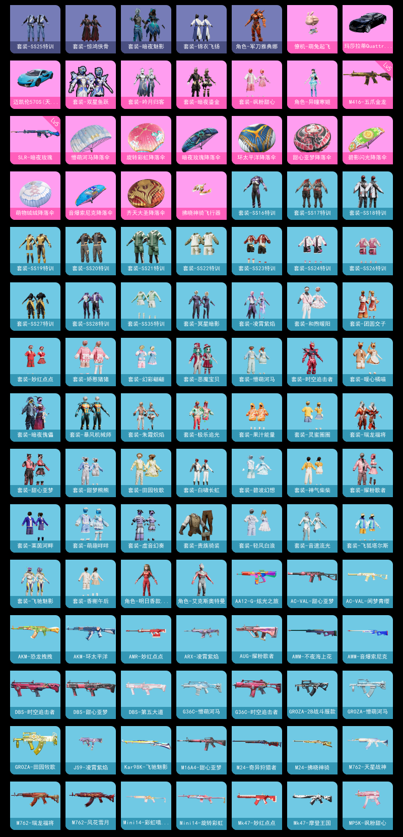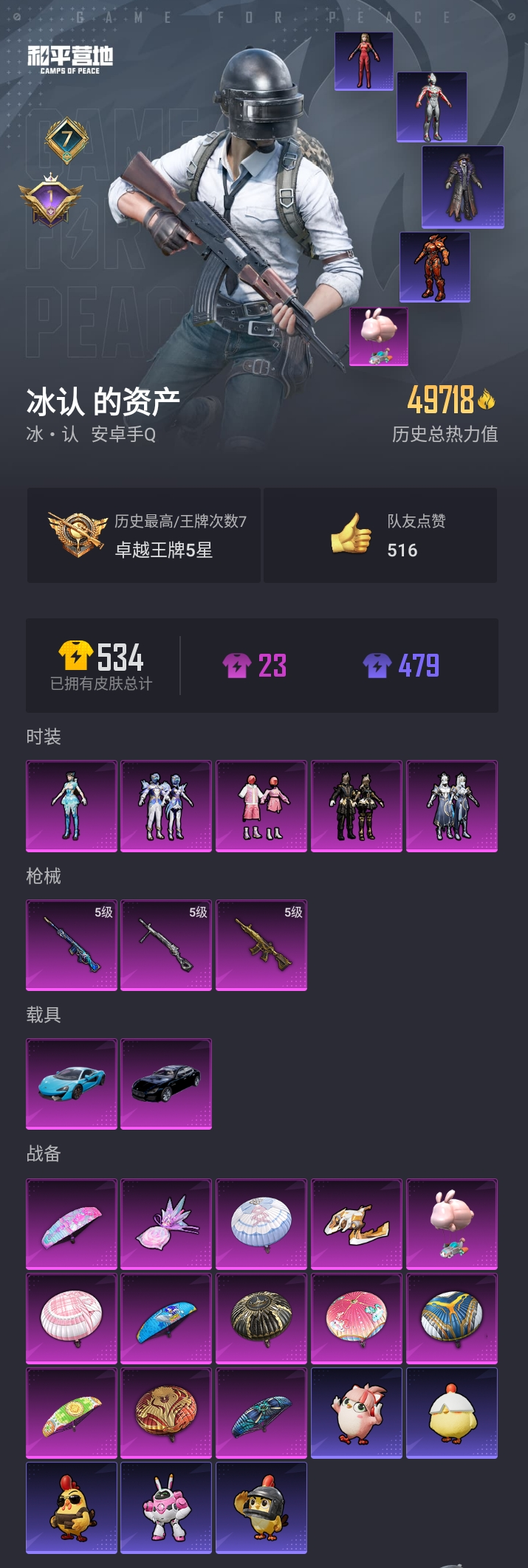 【和平精英】【lyhp16852】5粉装3特效呛3载具含1僚机 5级金龙m4 蓝玛莎 5粉装,3特效呛,2载具,历史最高段位:卓越王牌5星 王牌印记7次 热力值:49718,114套装,147呛械,160装备,90战备;套装:套装-双星鱼跃,套装-吟月归客,套装-暗夜鎏金,套装-飒粉甜心,角色-异瞳寒姬,套装-红色运动,套装-黑色伏地魔,套装-骑行爱好者,套装-竞技名士,套装-猛禽,套装-长空猛禽,套装-黎明保卫者,套装-蓝色守护者,套装-特战装甲,套装-贵族骑装,套装-战地督导,套装-甜蜜告白,套装-龙腾端午,套装-滨海假日,套装-怒火燎原,套装-魅力单车,套装-绮丽涂鸦,套装-坚韧舞者,套装-都市漫游者,套装-破晓战魂,套装-都市魅力,套装-荣耀,套装-沙漠兵团,套装-极地朋克,套装-幻世战舞者,套装-甜蜜熊情侣,套装-缤纷果语,套装-风暴特警,套装-冰川特警,套装-麻辣教官,套装-梦魇先生,套装-恶魔宝贝,套装-破蛋小黄鸡,套装-鹤鸣,套装-萌黄之夏,套装-夏日音浪,套装-探宝勇士,套装-牛气满满,套装-牛气冲天,套装-ss18特训,套装-耀粉歌者,套装-飞行日记,角色-艾克斯奥特曼,角色-明日香款战斗服,套装-ss16特训,套装-暴风机械师,套装-时空追击者,套装-暗夜魅影,套装-暗夜傀儡,套装-ss17特训,套装-瑞龙福将,套装-团圆交子,套装-极乐追光,套装-福星高照,套装-虎虎生威吉莉,角色-军刀雅典娜,套装-空投萌叽,套装-ss19特训,套装-飞驰魅影,套装-音速流光,套装-ss20特训,套装-甜心亚梦,套装-虚音幻奏,套装-ss21特训,套装-萌趣咩咩,套装-娇憨猪猪,套装-暖心橘喵,套装-玉兔迎春,套装-ss22特训,套装-和煦暖阳,套装-田园牧歌,套装-轻风白浪,套装-白啸长虹,套装-碧波幻想,套装-光之冒险,套装-绯格组合,套装-ss23特训,套装-飞狐塔尔斯,套装-莱茵河畔,套装-香榭午后,套装-甜梦熊熊,套装-神气柴柴,套装-懵萌河马,套装-灵蜜圈圈,套装-妙红点点,套装-幻彩翩翩,套装-王牌教练,套装-柠萌假日,套装-青玉碎影,套装-ss24特训,套装-冥星暗影,套装-龟仙人,套装-涂山之恋,套装-ss25特训,套装-惊鸿侠骨,套装-锦衣飞扬,套装-果汁能量,套装-龙的传人,套装-ss26特训,套装-ss27特训,套装-ss28特训,角色-无面战甲,套装-ss32特训,套装-炫彩糖果,套装-ss34特训,套装-朱霞炽焰,套装-凌霄紫焰,套装-薄荷星砂,套装-ss35特训;呛皮:aug-耀粉歌者,aug-天降萌叽,aug-冰晶雪宝,g36c-时空追击者,g36c-懵萌河马,g36c-乌木金纹,akm-生命誓言,akm-涂鸦街区,akm-彩虹符号,akm-虎虎生威,akm-恐龙拽拽,akm-环太平洋,akm-龙的传人,groza-彩虹符号,groza-田园牧歌,groza-懵萌河马,groza-2b战斗服款,groza-无面战甲,mk47-乌木金纹,mk47-妙红点点,mk47-摩登王国,5级m416-五爪金龙,m416-夜灯,m416-蓝色火焰,m416-红色方程式,m416-糯团青竹,m762-瑞龙福将,m762-风花雪月,m762-彩虹符号,m762-天降萌叽,m762-天星战神,ac-val-甜心亚梦,ac-val-乌木金纹,ac-val-天降萌叽,ac-val-闲梦青缨,m16a4-甜心亚梦,m16a4-幻世战舞者,scar-l-炫彩节奏,scar-l-暗夜玫瑰,scar-l-玉兔迎春,arx-凌霄紫焰,蜜獾-娇憨猪猪,蜜獾-垂柳戏鸭,蜜獾-天降萌叽,q-彩虹符号,q-洛神天依,q-未来歌姬,莫辛纳甘-乌木金纹,莫辛纳甘-懵萌河马,kar98k-彩虹符号,kar98k-飞驰魅影,kar98k-乌木金纹,win94-瑞龙福将,win94-乌木金纹,awm-不夜海上花,awm-音爆索尼克,m24-奇异狩猎者,m24-拂晓神骑,m24-乌木金纹,amr-妙红点点,m200-惊鸿侠骨,5级slr-暗夜玫瑰,slr-娇憨猪猪,slr-彩虹符号,mini14-旋转彩虹,mini14-彩虹嘻嘻猴,mini14-涂山之恋,sks-炫彩节奏,sks-时空追击者,sks-未来歌姬,m417-惊鸿侠骨,mk14-乌木金纹,vss-田园牧歌,mp5k-飒粉甜心,mp5k-乌木金纹,vect-生命誓言,vect-暗夜玫瑰,vect-田园牧歌,vect-音爆索尼克,ump45-蓝色火焰,ump45-时空追击者,ump45-仲夏莫吉托,ump45-涂山之恋,js9-凌霄紫焰,uzi-炫彩节奏,uzi-娇憨猪猪,uzi-天降萌叽,uzi-炫彩糖果,p90-飞驰魅影,p90-玩趣呆呆,p90-乌木金纹,汤姆逊-炫彩节奏,汤姆逊-暗夜鎏金,野牛-乌木金纹,aks-74u-乌木金纹,s12k-瑞龙福将,s12k-娇憨猪猪,s12k-垂柳戏鸭,s12k-幻世战舞者,s12k-音爆索尼克,s12k-玩趣呆呆,s686-生命誓言,s686-深海曼妙,s686-彩虹符号,dbs-时空追击者,dbs-甜心亚梦,dbs-第五大道,dbs-彩虹符号,dbs-乌木金纹,s1897-炫彩节奏,s1897-飞驰魅影,s1897-乌木金纹,aa12-g-炫光之旅,spas-12-田园牧歌,m249-彩虹符号,m249-妙红点点,m249-无面战甲,m249-乌木金纹,5级dp-28-豹影疾电,dp-28-甜心亚梦,dp-28-旋转彩虹,mg3-瑞龙福将,mg3-幻世战舞者,mg3-乌木金纹,mg3-妙红点点,mg3-第五大道,mg3-惊鸿侠骨,pkm-懵萌河马,mg-36-凌霄紫焰,p92-凌霄紫焰,沙墨之鹦-旋转彩虹,p1911-无面战甲,撬棍-齐天大圣,撬棍-幻世战舞者,平底锅-时空追击者,平底锅-瑞龙福将,平底锅-飞驰魅影,平底锅-甜心亚梦,平底锅-娇憨猪猪,平底锅-田园牧歌,平底锅-光之冒险,平底锅-妙红点点,平底锅-懵萌河马,平底锅-惊鸿侠骨,平底锅-凌霄紫焰,铝热弹-炫彩糖果,爆炸猎弓-惊鸿侠骨;载具:迈凯伦570s天际蓝,玛莎拉蒂quattropte夜幕蓝;降落伞:拂晓神骑飞行器,炫彩糖果飞行器,火焰蝠人飞行服,光之冒险尾迹;滑翔尾迹:僚机-萌兔起飞; 详情看图