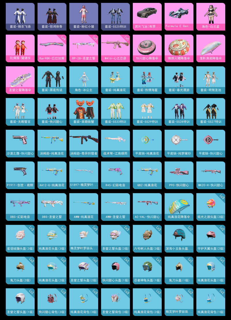 【和平精英】【lyhp16831】2粉装3特效呛2载具 猪猪侠 5级恋语m4 宾利 2粉装,3特效呛,2载具,历史最高段位:超级王牌7星 王牌印记2次 热力值:20183,37套装,65呛械,67装备,27战备;套装:角色-白兰星,玩偶服-猪猪侠,套装-蓝色运动,套装-竞技名士,套装-长空猛禽,套装-魅力单车,套装-呆萌铁蟹,套装-缤纷果语,套装-龙魂突击队,套装-梦魇先生,套装-黑夜传说,套装-粉红小猪,套装-鹤鸣,套装-霓虹街区,套装-战术大师,套装-热情海星,套装-纯真浪花,套装-ss25特训,套装-惊鸿侠骨,套装-锦衣飞扬,套装-龙的传人,套装-快闪甜心,套装-春光漫游,套装-空岛之星,套装-无暇誓言,套装-明鸳圣池,套装-ss27特训,套装-ss28特训,角色-冰公主,套装-海盐绵绵冰,套装-ss29特训,角色-无面战甲,角色-许七安,套装-ss31特训,套装-ss33特训,套装-顶瓜瓜,套装-ss34特训;呛皮:groza-无面战甲,ac-val-快闪甜心,scar-l-海盐豹豹,q-彩虹符号,q-纯真浪花,5级m416-心之恋语,m416-红色方程式,m416-糯团青竹,aug-天降萌叽,aug-异域银装,akm-龙的传人,famas-乌木金纹,蜜獾-天降萌叽,m16a4-冰河战士,awm-圣堂之誓,awm-纯真浪花,4级kar98k-巳巳如意,amr-乌木金纹,m200-惊鸿侠骨,m200-乌木金纹,m417-惊鸿侠骨,m417-玩趣呆呆,mk14-冰河战士,mk14-薄荷星砂,mk20-h-快闪甜心,mk20-h-乌木金纹,aks-74u-鸡智如我,aks-74u-乌木金纹,mp5k-乌木金纹,汤姆逊-奇异狩猎者,汤姆逊-纯真浪花,p90-快闪甜心,p90-巳巳如意,p90-乌木金纹,ump45-蓝色火焰,uzi-天降萌叽,uzi-冰河战士,uzi-啾咪啾咪,dbs-圣堂之誓,dbs-幻彩电音,dbs-乌木金纹,s686-生命誓言,s686-巳巳如意,s1897-精灵梦叶罗丽,aa12-g-纯真浪花,mg3-幻世战舞者,mg3-惊鸿侠骨,m249-彩虹符号,m249-糯团青竹,m249-无面战甲,5级dp-28-圣堂之誓,沙墨之鹦-快闪甜心,p1911-创世·救赎,p1911-无面战甲,r45-幻彩电音,平底锅-纯梦嫁纱,平底锅-惊鸿侠骨,平底锅-快闪甜心,平底锅-空岛之星,平底锅-纯真浪花,战术弩-江南烟雨,破片手留单-巳巳如意,盐雾蛋-冰氧夏日,十子怒-异域银装,爆炸猎弓-惊鸿侠骨;载具:fmula e gen2巅峰兰,宾利飞驰布罗德盖棕双色; 详情看图