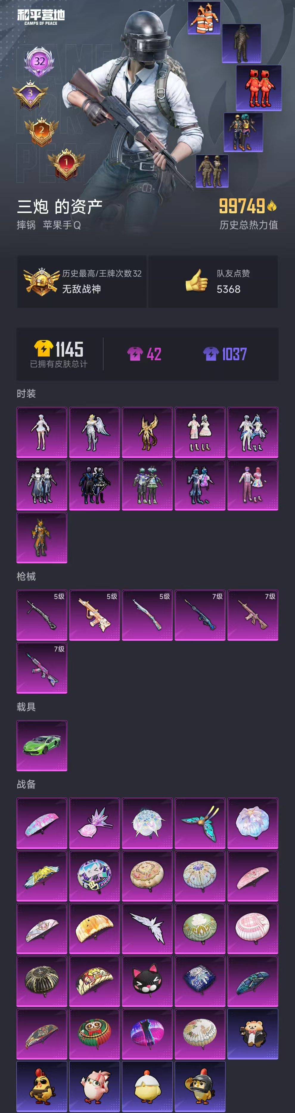【和平精英】【lyhp16891】【紫标王牌32印记无敌战神框/双字id 摔锅/ 高热力值】11粉装 6特效呛 1载具 暗夜玫瑰 小番茄 暗夜之虎 小丑鱼 东方飞龙 满级心之恋语m4 满级炫紫旋律ak 兰博基尼 11粉装,6特效呛,1载具,历史最高段位:无敌战神 王牌印记32次 热力值:99749,248套装,295呛械,366装备,205战备;套装:套装-天使彩虹糖,套装-土曜战麒,套装-深海曼妙,套装-静灵氛围,套装-暗夜玫瑰,套装-吟月归客,套装-未来歌姬,套装-蜜语绒猫,角色-凤凰座 一辉,角色-天鹅座 冰河,角色-荧海星豚,套装-特训学院,套装-猎鹰,套装-青年教官,套装-橘黑制服,套装-红色运动,套装-黄色运动,套装-蓝色运动,套装-黄色伏地魔,套装-白色伏地魔,套装-黑色伏地魔,套装-帅气教官,套装-竞技名士,套装-深蓝色名流,套装-酒红色名流,套装-湖蓝色名流,套装-黄色名流,套装-猛禽,套装-长空猛禽,套装-竞技勇士朋克,套装-雪鹰学院,套装-蓝色守护者,套装-海岛探路者,套装-六六大吉,套装-冷焰舞者,套装-灼焰舞者,套装-刚毅裁决者,套装-特战装甲,套装-缤纷假日,套装-战地督导,套装-特殊使命,套装-甜蜜告白,套装-迎春赐吉,套装-滨海假日,套装-完美偶像,套装-人气偶像,套装-幻影武者,套装-街头潮人,套装-红潮炫舞,套装-蓝彩潮人,套装-千禧之恋,套装-神秘领域,套装-怒火燎原,套装-魅力单车,套装-绮丽涂鸦,套装-耀眼新星,套装-狂战萌兔,套装-雪山征服者,套装-坚韧舞者,套装-竞技达人朋克,套装-夜莺强袭者,套装-野性战心,套装-野性战魂,套装-破晓战魂,套装-都市魅力,套装-风行保卫者,套装-热血青春,套装-潮流炫酷,套装-沙漠兵团,套装-丛林猎人,套装-雪山精英,套装-传奇侦探,套装-幻世战舞者,套装-奇趣章鱼,套装-向日葵先生,套装-暗影哥特,套装-迅捷狂鲨,套装-呆萌铁蟹,套装-深海小丑鱼,套装-青涩时光,套装-缤纷果语,套装-滨海厨神,套装-龙魂突击队,套装-特种空勤,套装-和平特警,套装-风暴特警,套装-冰川特警,套装-雷霆特警,套装-灿烂千阳,套装-元素星魂,套装-极速红龙,套装-格斗先锋,套装-旷野奇兵,套装-麻辣教官,套装-ss3特训,套装-暗夜之虎,套装-小丑鱼,套装-东方飞龙,套装-初雨海棠,套装-ss4特训,套装-梦魇先生,套装-万圣娃娃,套装-黑夜传说,套装-破蛋小黄鸡,套装-疯狂小兔子,套装-幻世猎手,套装-阳光火鸡,套装-ss5特训,套装-圣诞大吉,套装-熔岩使者,套装-凛冬战士,套装-爱崽白熊,套装-裁决冥王,套装-红酒骑士,套装-浪漫波比,套装-维京奇缘,套装-金鼠迎春,套装-北国孤狼,套装-ss6特训,套装-拳皇97八神庵,套装-炽焰拳师,套装-格斗专家,套装-奇迹天团,套装-仓鼠灰灰,套装-淡雅花蕊,套装-玲珑飞花,套装-跃动心情,套装-ss7特训,套装-黑色刀锋,套装-核芯基因,套装-精神漫游,套装-霓虹街区,套装-ss10特训,套装-ss8特训,套装-众神之王,套装-爱神,套装-智慧之神,套装-神秘黑猫,套装-pel躁动竞梦者,套装-摇滚狂鲨,套装-夏日音浪,套装-ss9特训,套装-风华少年志,套装-白月香洋装,套装-薄荷蓝莓,套装-探宝勇士,套装-牛气满满,套装-白糯汤圆,套装-ss11特训,套装-怪笑疯兔,套装-诡面顽熊,套装-青春冒险家,套装-潮流游乐家,套装-原初圣火,套装-逆风勇士,套装-娴静芝兰,套装-萌趣颜团子,套装-特种颜团子,套装-战术大师,套装-ss12特训,套装-牛气冲天,套装-ss18特训,套装-镭射皇者,套装-银白舞王,套装-耀粉歌者,套装-治愈之星,套装-科技之星,套装-飞行日记,套装-ss13特训,套装-冰爽海盐,套装-ss14特训,套装-ss15特训,套装-ss16特训,套装-暗夜傀儡,套装-ss17特训,套装-瑞龙福将,套装-团圆交子,套装-冰爽风暴,套装-极乐追光,套装-福星高照,套装-异彩先驱,套装-霓虹极客,套装-ss19特训,套装-ss20特训,套装-ss21特训,套装-萌趣咩咩,套装-娇憨猪猪,套装-红熊茄茄,套装-玉兔迎春,套装-ss22特训,套装-田园牧歌,套装-轻风白浪,套装-绯格组合,套装-ss23特训,套装-香榭午后,套装-王牌教练,套装-柠萌假日,套装-ss24特训,套装-龟仙人,套装-ss25特训,套装-惊鸿侠骨,套装-锦衣飞扬,套装-龙的传人,套装-ss26特训,套装-无暇誓言,套装-云魄琉璃,套装-ss27特训,套装-恋语绒绒,套装-老实芭蕉,套装-ss28特训,套装-奶油梦幻熊,角色-情公主,套装-街头风暴,套装-海盐绵绵冰,套装-ss29特训,角色-绯色魅影,套装-异域银装,角色-许七安,角色-俏兔智灵,角色-怀庆长公主,套装-ss31特训,套装-鱼渊荷华,套装-燕燕于飞,套装-智谋强哥,套装-ss33特训,角色-猎影月神,套装-云朵鹅,套装-巳巳如意,套装-ss32特训,套装-彩虹兔,套装-雪绒豹,套装-大橘大利,套装-霓虹热舞,套装-蜜露汐语,套装-炫彩糖果,套装-蓝海鲸歌,套装-元气之梦,套装-ss34特训,套装-擎苍青焰,套装-朱霞炽焰,套装-游乐,套装-凌霄紫焰,套装-ss35特训,套装-午间小调,套装-秘语星愿,套装-风迹短诗,套装-粉黛兰香,套装-萌鸡速递;呛皮:m762-诡娃娃,m762-甜心宝贝,m762-拳皇97,m762-潮萌小黄鸭,m762-乘风破浪,m762-牛气冲天,m762-镭射皇者,m762-瑞龙福将,m762-橘柚倾心,m762-天降萌叽,m762-云朵鹅,m762-乌木金纹,7级m416-心之恋语,m416-夜灯,m416-蓝色火焰,m416-红色方程式,m416-黄金狮王,m416-仓鼠灰灰,m416-神秘黑猫,m416-糯团青竹,m416-乌木金纹,groza-影袭,groza-雷霆特警,groza-春暖花开,groza-黑色刀锋,groza-治愈之星,groza-彩虹符号,groza-异彩先驱,groza-恐龙拽拽,groza-田园牧歌,groza-奶油梦幻熊,groza-荧海星豚,groza-乌木金纹,m16a4-蓝色火焰,m16a4-红色方程式,m16a4-凝