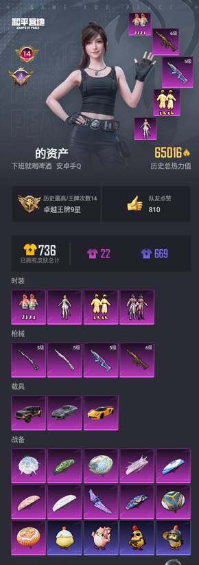 [14130690]安卓【小号/14王牌印记/4粉装-4特效呛-3载具-1粉色飞行器】 手q65016热力值-14王牌印记-158套装-212呛皮 【热门品类】:套装-奇异狩猎者,套装-龟仙人,套装-粉红小猪 【粉色载具】:兰博基尼estoque(银翼灰),路特斯evija(星际黄),乔治巴顿战车(鎏金黑) 【粉色套装】:粉装-银红美神,粉装-炫光之旅,粉装-暖暖奶龙,角色-圣堂之誓 【粉色呛皮等级】:akm-梦之光华五级,m416-五爪金龙六级,kar98k-巳巳如意五级,dp-28-豹影疾电五级 【粉色呛皮】:akm-梦之光华,m416-五爪金龙,kar98k-巳巳如意,dp-28-豹影疾电 【粉色飞行器】:梦幻火箭飞行器 【粉色降落伞】:橘柚倾心降落伞,环太平洋降落伞,星际浪客降落伞,纯梦嫁纱降落伞,飒粉甜心降落伞,未来歌姬降落伞,江南烟雨降落伞,金丰海韵降落伞,忍者神龟降落伞,无垠阁降落伞 【稀有套装】:套装-龟仙人,套装-巳巳如意,套装-雏菊兔兔,套装-萝兰蝴蝶,套装-糖糖葫芦,套装-青团波波,角色-临安公主,角色-怀庆长公主,套装-燕燕于飞,套装-鱼渊荷华 【稀有呛皮】:akm-夜灯,akm-奇异狩猎者,akm-生命誓言,akm-破晓战魂,akm-虎虎生威,akm-龙的传人,m16a4-甜心亚梦,scar-l-夜灯,scar-l-炫彩节奏,scar-l-玉兔迎春,scar-l-王牌四分卫,scar-l-红色方程式,m416-暗星紫秘,m416-糯团青竹,m416-红色方程式,groza-彩虹符号,groza-懵萌河马,groza-田园牧歌,aug-天降萌叽,aug-甜蜜菠萝,aug-耀粉歌者,aug-青春冒险家,q-彩虹符号,q-未来歌姬,q-洛神天依,m762-天星战神,m762-天降萌叽,m762-奇异狩猎者,m762-彩虹符号,m762-瑞龙福将,mk47-妙红点点,mk47-洛神天依,mk47-青春冒险家,g36c-懵萌河马,ac-val-天降萌叽,ac-val-快闪甜心,ac-val-甜心亚梦,蜜獾-天降萌叽,蜜獾-娇憨猪猪,uzi-啾咪啾咪,uzi-天降萌叽,uzi-娇憨猪猪,uzi-影袭,uzi-炫彩节奏,ump45-夜灯,ump45-涂山之恋,ump45-生命誓言,ump45-蓝色火焰,vect-焰鹰斗篷,vect-