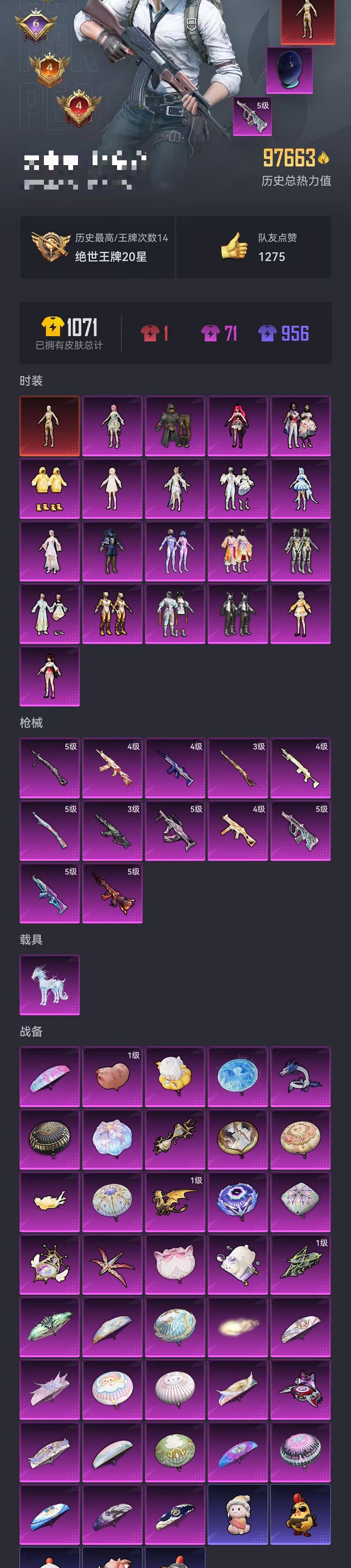 【3级图卡盟(赛季结束自动升4级) 暗夜之虎 20粉装12特效呛1载具可秒换绑】 安卓q区-97663热力值-14印记-196套装-269呛皮 【1红装】 沙丘之主-图卡盟3级【1载具】 冰绡玉鳞【2稀有】 mark.06 暗夜之虎【20粉装】 梦幻火箭 角色-美琪 傲傲奶龙 小可学妹 数码大师 花间之火 拂晓神骑 绚金战神 莲影清波 寒光使者 星之信仰 白勺歌姬 呆萌星弥 智能音符 极限特