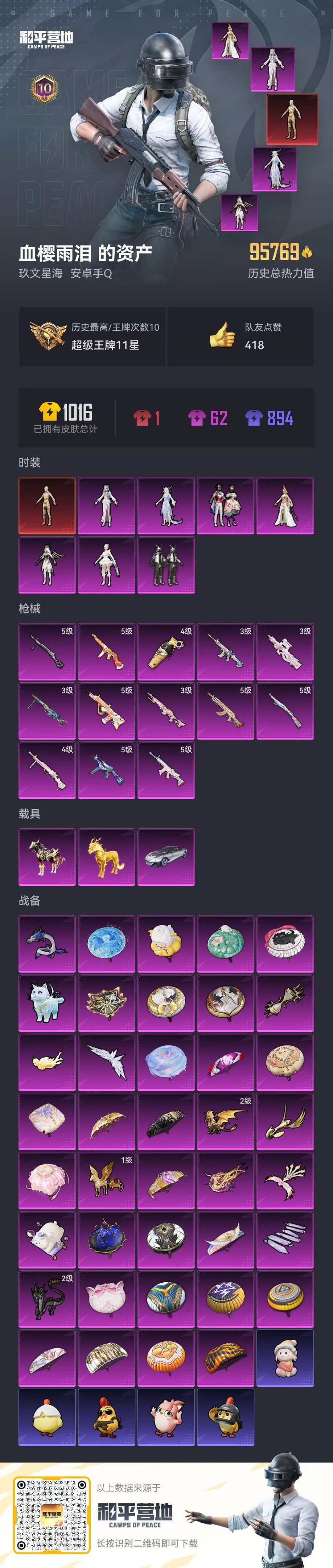 【4级图卡盟7粉装13特效呛3载具可秒换绑】 安卓q区-95769热力值-10印记-162套装-264呛皮 【1红装】 沙丘之主-图卡盟4级【3载具】 星河领航磐石银 黑曜夜骑 护世瑞兽【3稀有】 mark.06 awm-黄金龙骨 akm-百万伏特【7粉装】 数码大师 星穹咏叹调 角色-幻海仙踪 角色-冷漠罗丽 角色-千金淑猫 角色-信仰神谕 角色-萨利娅【13特效呛】 scar-l-锦
