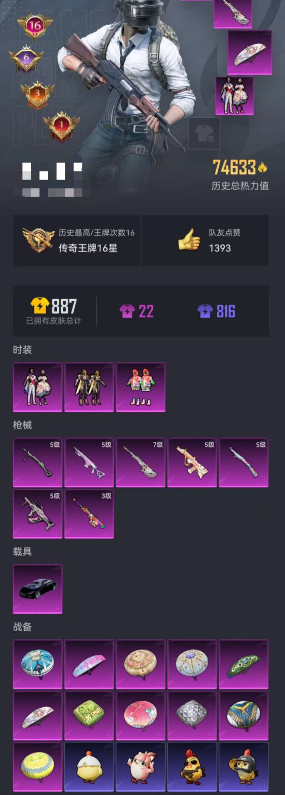 【3粉装7特效呛1载具可秒换绑】 安卓q区-74633热力值-16印记-165套装-264呛皮 【1载具】 玛莎拉蒂q蓝色【1稀有】 awm-黄金龙骨【3粉装】 炫光之旅 创世·救赎 星穹咏叹调【7特效呛】 amr-炫光之旅3级 amr-智耀战神7级 mk14-甜梦熊击5级 groza-镜光银凌5级 kar98k-巳巳如意5级 dp-28-豹影疾电5级 aug-暖羊咩咩