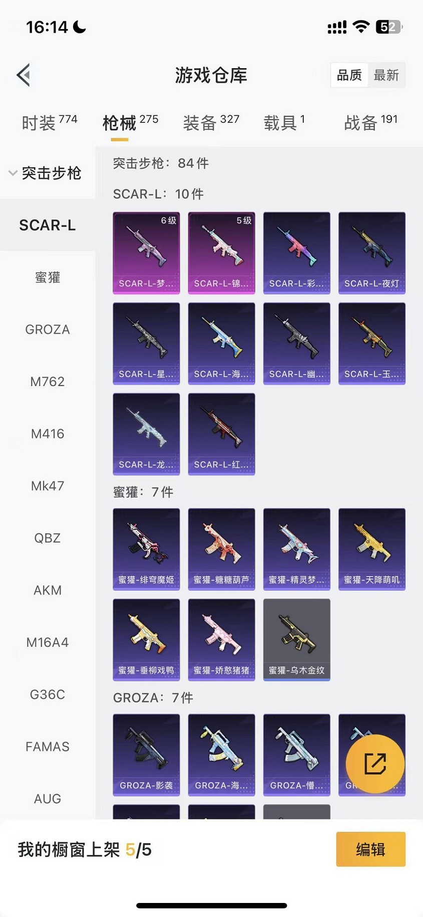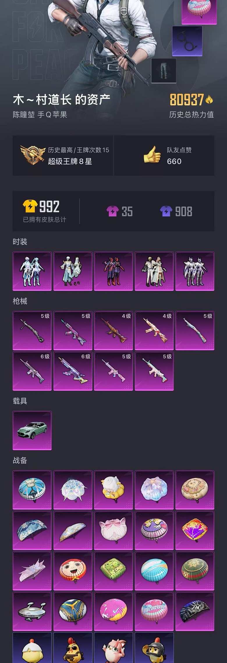可二次【5粉装9特效呛1载具可秒换绑】 苹果q区-80937热力值-15印记-198套装-275呛皮 【1载具】 玛莎拉蒂g绿色【5粉装】 星之彼岸 筑梦精灵 紫电风暴 金丰海韵 幻彩电音【9特效呛】 scar-l-梦幻火箭6级 scar-l-锦绣绵绵5级 akm-炫紫旋律5级 m416-风花雪月4级 m416-电玩时刻5级 m762-电糖天使6级 aks-74u-星穹咏