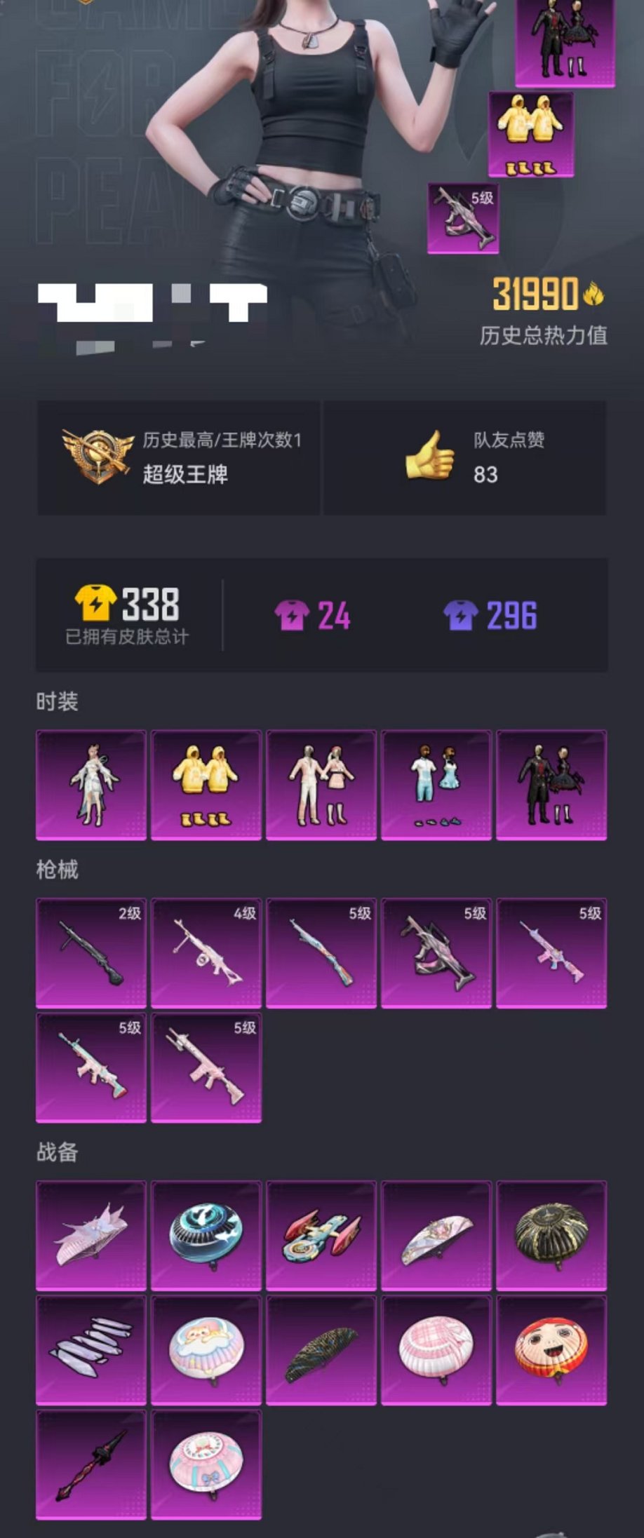 【女号5粉装7特效呛可秒换绑】 安卓q区-31990热力值-1印记-73套装-80呛皮 【5粉装】 傲傲奶龙 第五大道 仲夏莫吉托 夜幕颂歌 角色-月影灵韵【7特效呛】 scar-l-锦绣绵绵5级 m417-第五大道5级 m416-电玩时刻5级 pkm-江南烟雨4级 groza-镜光银凌5级 kar98k-巳巳如意5级 dp-28-豹影疾电2级【10热门】 长空猛禽