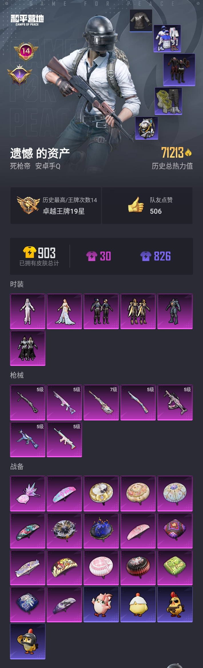 【和平精英】【lyhp16936】14高印记 6粉装7特效呛 创世 复仇流浪者 暗影哥特 浪漫天命 狂沙舞者 猫包 多把满级呛皮 6粉装,7特效呛,0载具,历史最高段位:卓越王牌19星 王牌印记14次 热力值:71213,181套装,262呛械,294装备,137战备;套装:套装-骨龙祭渊,角色-复仇流浪者,套装-创世·救赎,套装-英伦信使,角色-智耀战神,角色-冷漠罗丽,套装-特训学院,套装-猎鹰,套装-青年教官,套装-橘黑制服,套装-红色运动,套装-黄色运动,套装-蓝色运动,套装-黄色伏地魔,套装-白色伏地魔,套装-黑色伏地魔,套装-骑行爱好者,套装-竞技名士,套装-深蓝色名流,套装-酒红色名流,套装-湖蓝色名流,套装-黄色名流,套装-猛禽,套装-长空猛禽,套装-漫步者,套装-蓝色守护者,套装-海岛探路者,套装-旭日情侣,套装-冷焰舞者,套装-灼焰舞者,套装-浪漫天命,套装-特战装甲,套装-战地督导,套装-甜蜜告白,套装-春日漫步,套装-沙漠毒蛇,套装-鹰眼刺客,套装-冰冻风暴,套装-完美偶像,套装-人气偶像,套装-幻影武者,套装-街头潮人,套装-蓝彩潮人,套装-魅力单车,套装-绮丽涂鸦,套装-耀眼新星,套装-雪山征服者,套装-竞技达人朋克,套装-野性战心,套装-狂沙舞者,套装-萌熊伴侣,套装-破晓战魂,套装-幻世保卫者,套装-都市魅力,套装-极地朋克,套装-幻世战舞者,套装-奇异狩猎者,套装-蓝调潮人,套装-暗影哥特,套装-夏日倾情,套装-青涩时光,套装-缤纷果语,套装-龙魂突击队,套装-冰川特警,套装-元素星魂,套装-极速红龙,套装-格斗先锋,套装-海上生明月,套装-麻辣教官,套装-梦魇先生,套装-破蛋小黄鸡,套装-精神漫游,套装-鹤鸣,套装-霓虹街区,套装-夏日音浪,套装-探宝勇士,套装-白糯汤圆,套装-萌趣颜团子,套装-特种颜团子,套装-战术大师,套装-牛气冲天,套装-ss18特训,套装-耀粉歌者,套装-飞行日记,套装-曼妙人鱼,套装-热情海星,套装-纯真浪花,套装-天籁歌者,套装-ss16特训,套装-暴风机械师,套装-时空追击者,套装-ss17特训,套装-智慧隐士,套装-瑞龙福将,套装-团圆交子,套装-福星高照,套装-虎虎生威吉莉,角色-军刀雅典娜,套装-ss19特训,套装-极速竞梦,套装-飞驰魅影,套装-音速流光,套装-tt战队服,套装-炫蓝之夏,套装-ss20特训,套装-甜心亚梦,套装-虚音幻奏,套装-ss21特训,套装-萌趣咩咩,套装-娇憨猪猪,套装-玉兔迎春,套装-ss22特训,套装-田园牧歌,套装-轻风白浪,套装-光之冒险,套装-ss23特训,套装-龙舌兰冰茶,套装-神气柴柴,套装-懵萌河马,套装-妙红点点,套装-幻彩翩翩,套装-王牌教练,套装-柠萌假日,套装-ss24特训,套装-龟仙人,套装-ss25特训,套装-惊鸿侠骨,套装-锦衣飞扬,套装-龙的传人,套装-ss26特训,套装-快闪甜心,套装-春光漫游,套装-漫游都市,套装-空岛之星,套装-ss27特训,套装-恋语绒绒,套装-ss28特训,角色-蝶吟花词,套装-街头风暴,套装-海盐绵绵冰,套装-蝶变,套装-ss29特训,套装-雏菊兔兔,套装-萝兰蝴蝶,角色-绯色魅影,套装-异域银装,角色-俏兔智灵,套装-ss30特训,套装-青团波波,角色-光矢逐梦,套装-糖糖葫芦,套装-小鸟芋圆,套装-ss31特训,套装-鱼渊荷华,套装-燕燕于飞,套装-智谋强哥,角色-瑰梦爱神,套装-紫幽梦,套装-粉恋花,套装-ss33特训,套装-云朵鹅,套装-巳巳如意,套装-ss32特训,套装-彩虹兔,套装-蓝冰羽,套装-顶瓜瓜,套装-雪绒豹,套装-大橘大利,套装-极速光影,套装-星渊小夜曲,套装-炫彩糖果,套装-星影赞美诗,套装-元气之梦,套装-ss34特训,套装-朱霞炽焰,套装-凌霄紫焰,套装-薄荷星砂,套装-ss35特训,套装-午间小调,套装-风迹短诗,套装-萌鸡速递;呛皮:5级scar-l-锦绣绵绵,scar-l-红色方程式,scar-l-夜灯,scar-l-碧影闪光,scar-l-银碳小老虎,scar-l-玉兔迎春,scar-l-星途旅人,scar-l-海盐豹豹,蜜獾-娇憨猪猪,蜜獾-天降萌叽,蜜獾-糖糖葫芦,蜜獾-绯穹魔姬,蜜獾-鸡智如我,蜜獾-风迹短诗,蜜獾-绿洲时空,蜜獾-乌木金纹,mk47-乌木金纹,mk47-妙红点点,mk47-风迹短诗,akm-灼热熔岩,akm-影袭,akm-奇异狩猎者,akm-百万伏特,akm-破晓战魂,akm-涂鸦街区,akm-萌趣颜团子,akm-虎虎生威,akm-王牌投手,akm-龙的传人,akm-极光猎影,akm-霓彩脉冲,akm-绿洲时空,m762-绯红前夜,m762-快乐主宰,m762-奇异狩猎者,m762-甜心宝贝,m762-瑞龙福将,m762-天降萌叽,m762-雏菊兔兔,m762-云朵鹅,m416-蓝色火焰,m416-红色方程式,m416-动感兔斯基,m416-糯团青竹,m416-极冰使者,5级groza-镜光银凌,groza-影袭,groza-黑色刀锋,groza-田园牧歌,groza-懵萌河马,groza-海盐豹豹,m16a4-蓝色火焰,m16a4-甜心亚梦,m16a4-幻世战舞者,m16a4-冰河战士,m16a4-千金淑猫,arx-凌霄紫焰,aug-甜蜜菠萝,aug-幻影战神,aug-耀粉歌者,aug-天降萌叽,aug-异域银装,aug-紫晶流影,q-彩虹符号,q-飞驰魅影,q-纯真浪花,g36c-时空追击者,g36c-暗夜玫瑰,g36c-懵萌河马,g36c-星穹咏叹调,g36c-乌木金纹,famas-霓彩脉冲,famas-乌木金纹,ac-val-甜心亚梦,ac-val-乌木金纹,ac-val-快闪甜心,svd-云朵鹅,svd-霓彩脉冲,5级kar98k-巳巳如意,kar98k-影袭,kar98k-飞驰魅影,kar98k-星穹咏叹调,kar98k-乌木金纹,m200-惊鸿侠骨,m200-六号稻草人,m200-乌木金纹,win94-瑞龙福将,win94-乌木金纹,莫辛纳甘-炙焰牛王,莫辛纳甘-乌木金纹,莫辛纳甘-懵萌河马,莫辛纳甘-风迹短诗,7级amr-智耀战神,amr-妙红点点,amr-鸡智如我,amr-时光之誓,amr-乌木金纹,awm-天降萌叽,awm-圣堂之誓,awm-纯真浪花,m24-影袭,m24-奇异狩猎者,m24-炫彩节奏,m24-青空秋雨,m24-乌木金纹,vss-碧影闪光,vss-田园牧歌,vss-彩虹符号,vss-香桃花海,m417-惊鸿侠骨,5级mk14-甜梦熊击,mk14-乌