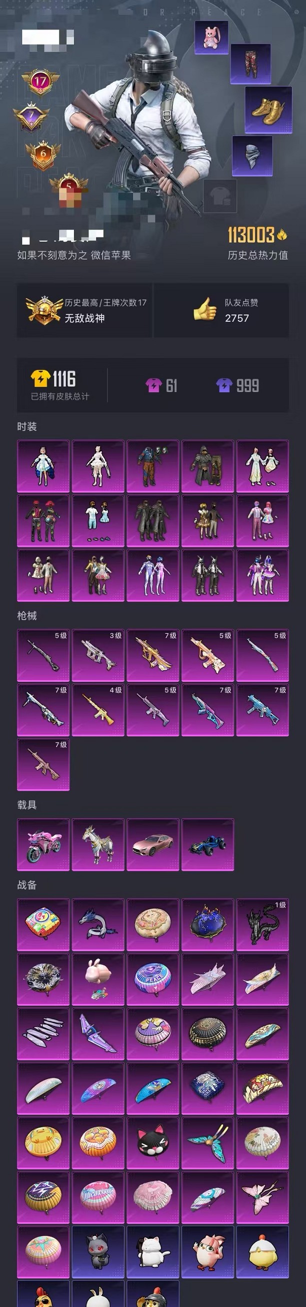【男神号小丑都市赤蝎金鞋15粉装11特效呛4载具】 苹果v区-113003热力值-17印记-历史最高段位:无敌战神-216套装-285呛皮 【5载具】 玛莎拉蒂粉色 合金龙骨蓝色 双人摩托梦幻火箭 僚机-萌兔起飞 照夜玉狮子【4稀有】 奇异狩猎者 赤蝎幽灵 派对舞王 akm-百万伏特【15粉装】 梦幻火箭 宝贝奶油派 甜心巧克力 洛天依 怪诞乔克 天使彩虹糖 数码大师 极致幻想 莲影清波 蝶舞迷