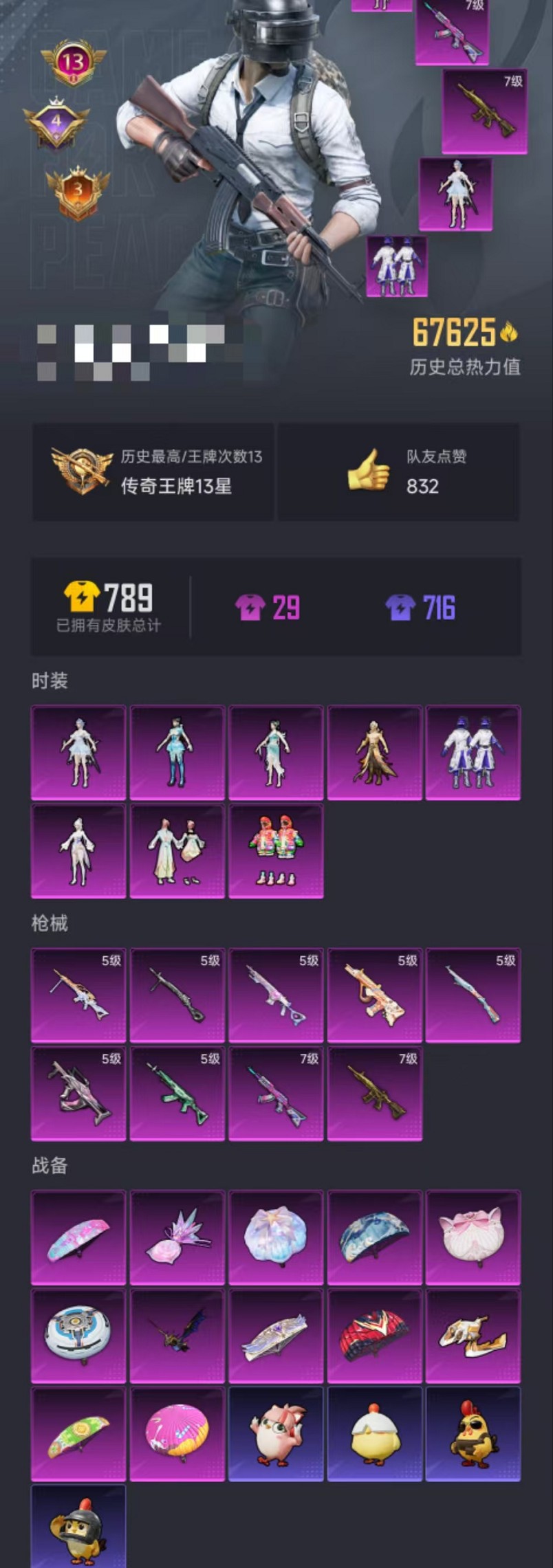 【双字id 满级五爪8粉装9特效呛 可秒换绑】 安卓q区-67625热力值-13印记-156套装-236呛皮 【8粉装】 新星烈龙(小白龙) 炫光之旅 莲影清波 角色-灵玺 角色-罗征 角色-冰魄 角色-女娲灵识 角色-异瞳寒姬【9特效呛】 m416-五爪金龙7级 akm-炫紫旋律7级 m762-青锋波束5级 mk14-甜梦熊击5级 groza-镜光银凌5级 kar98k-巳