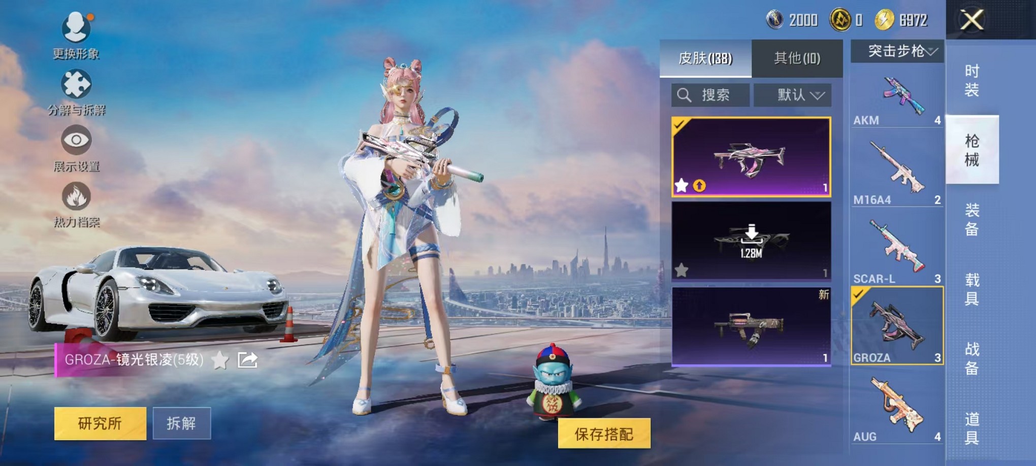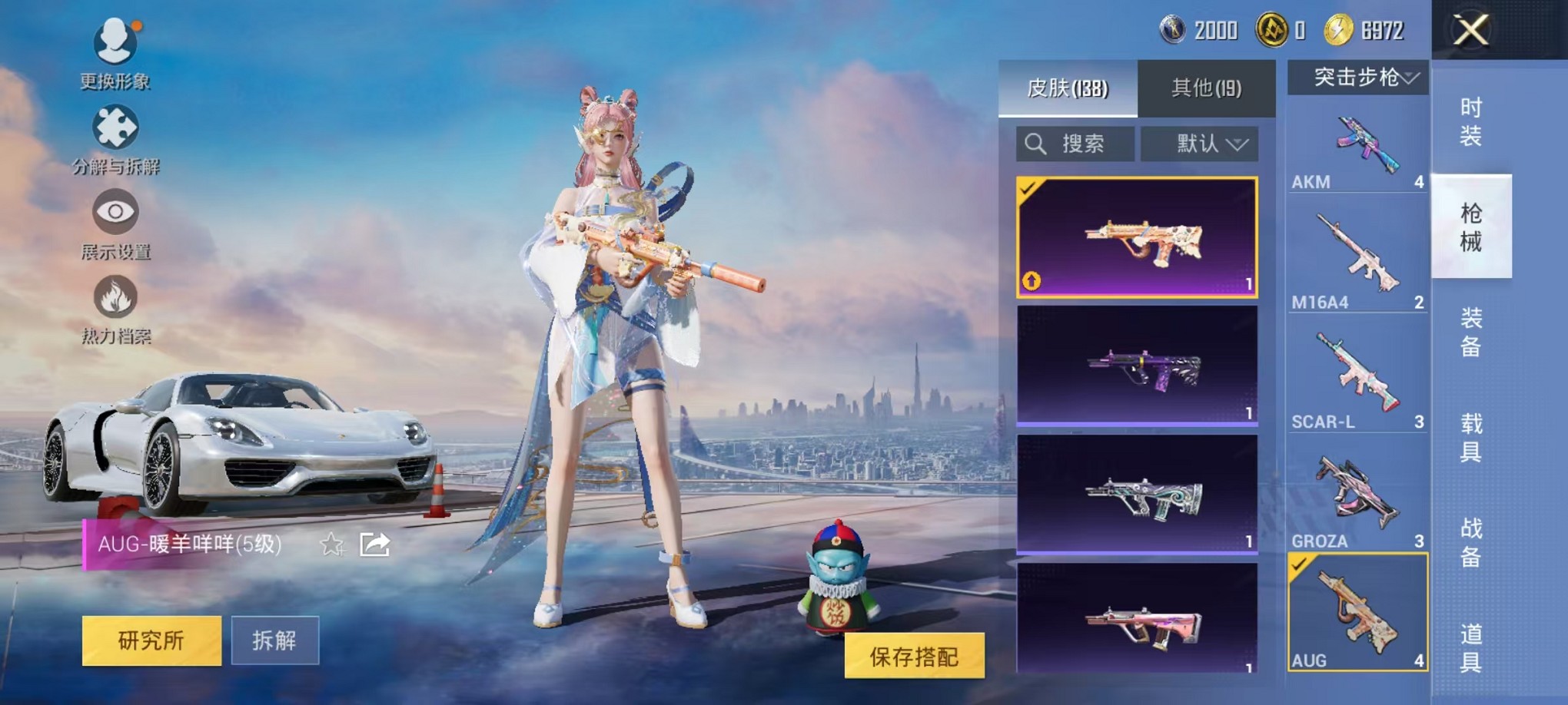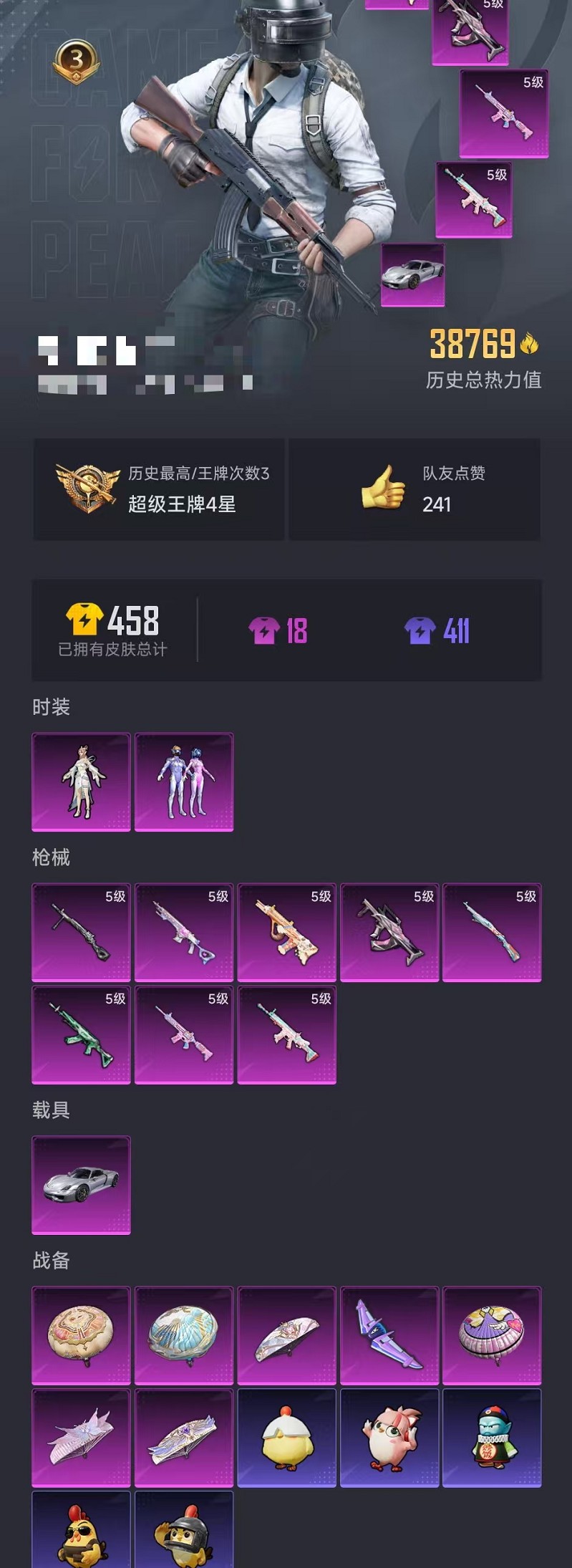 【2粉装8特效呛1载具 可秒换绑】 安卓q区-38769热力值-3印记-91套装-136呛皮 【1载具】 保时捷918 sper液态银【1稀有】 奇异狩猎者【2粉装】 梦幻火箭 角色-月影灵韵【8特效呛】 scar-l-锦绣绵绵5级 m416-电玩时刻5级 m762-青锋波束5级 mk14-甜梦熊击5级 groza-镜光银凌5级 kar98k-巳巳如意5级 dp-