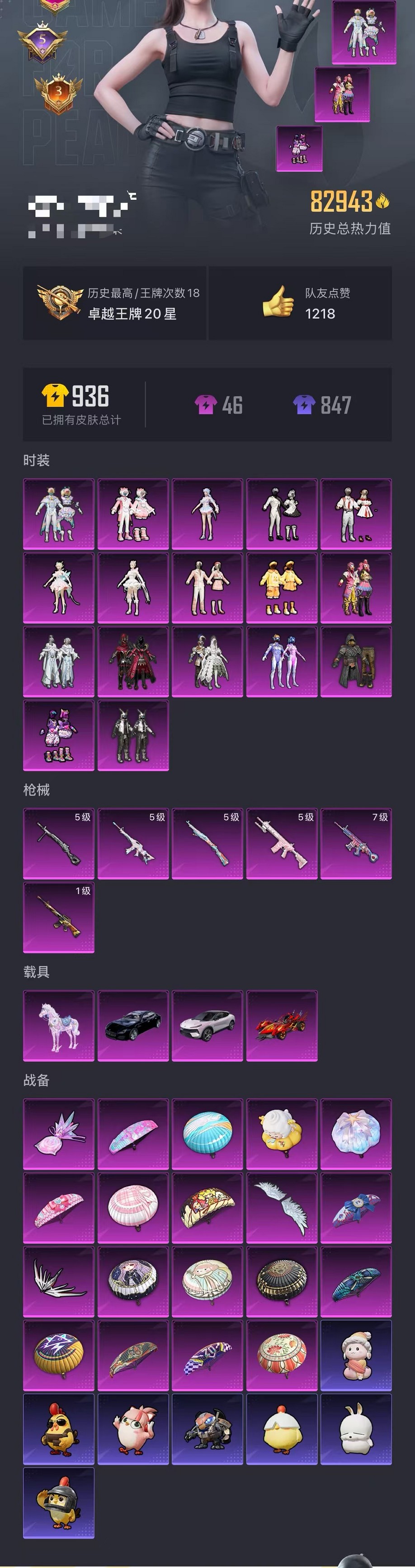 【女号梦幻猪脸金鞋17粉装6特效呛4载具】 苹果v区-82943热力值-18印记-202套装-247呛皮 【4载具】 玛莎拉蒂q蓝色 焰龙咆哮 路特斯el花绽灰 晶梦灵驹【5稀有】 8号机 奇异狩猎者 派对舞王 akm-百万伏特 scar-l-粉色回忆【17粉装】 缤纷油彩(猪脸妹) 梦幻火箭 冰霜白皇 第五大道 数码大师 憨憨奶龙 彩虹鹿灵 冰川红玫 蓝莓炮弹 炙焰红王 相思残雪 甜梦小狐 极