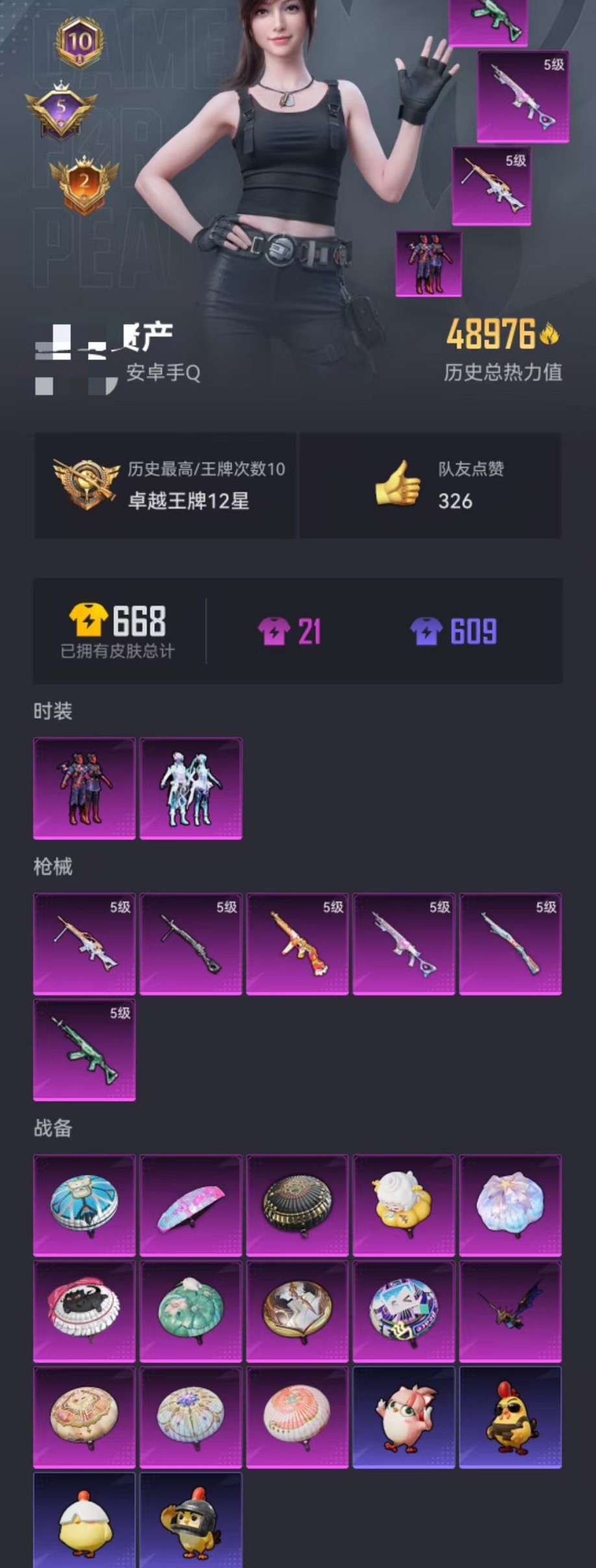 可二次【2粉装6特效呛 可秒换绑】 安卓q区-48976热力值-10印记-119套装-181呛皮 【2粉装】 星之彼岸 幻彩电音【6特效呛】 m762-青锋波束5级 mk14-甜梦熊击5级 汤姆逊-热量炸弹5级 kar98k-巳巳如意5级 dp-28-豹影疾电5级 mg-36-沧焰双生5级【18热门】 m416-蓝色火焰 groza-彩虹符号 长空猛禽 霓虹街区 浪漫天命