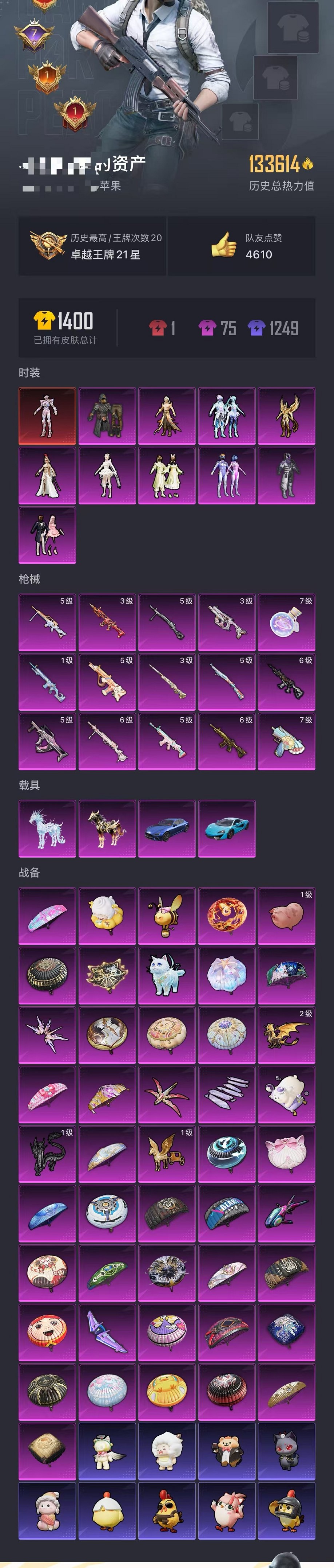可二次【4级帕修斯 梦幻都市赤蝎金鞋10粉装15特效呛4载具 可秒换绑】 苹果q区-133614热力值-20印记-262套装-371呛皮 【1红装】 最终圣卫者-帕修斯4级【4载具】 玛莎拉蒂蓝色 迈凯伦570s天际蓝 黑曜夜骑 冰绡玉鳞【3稀有】 奇异狩猎者 赤蝎幽灵 派对舞王【10粉装】 梦幻火箭 蜜桃特工 闲梦青缨 幻影战神 极限特训 角色-凤凰座 一辉 幻彩电音 角色-罗征 角色