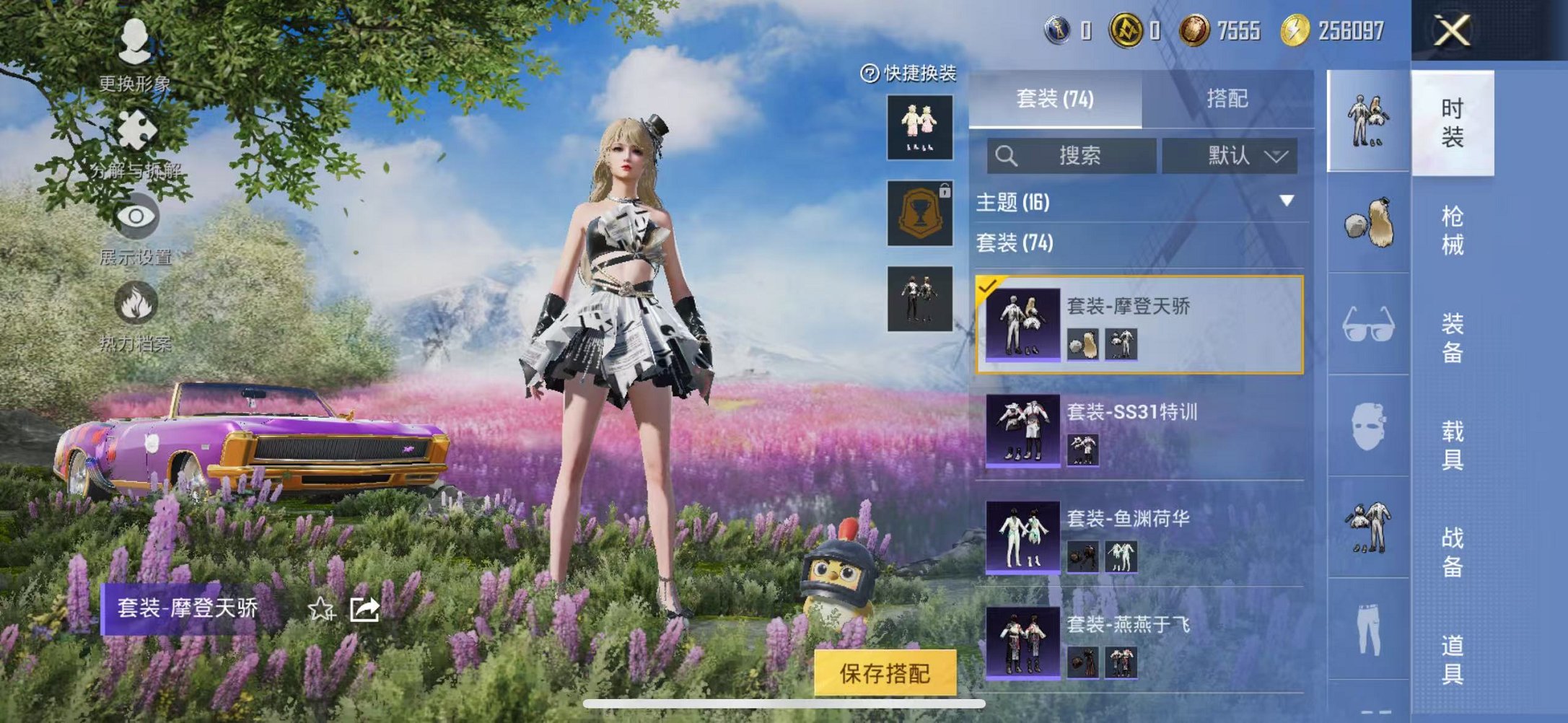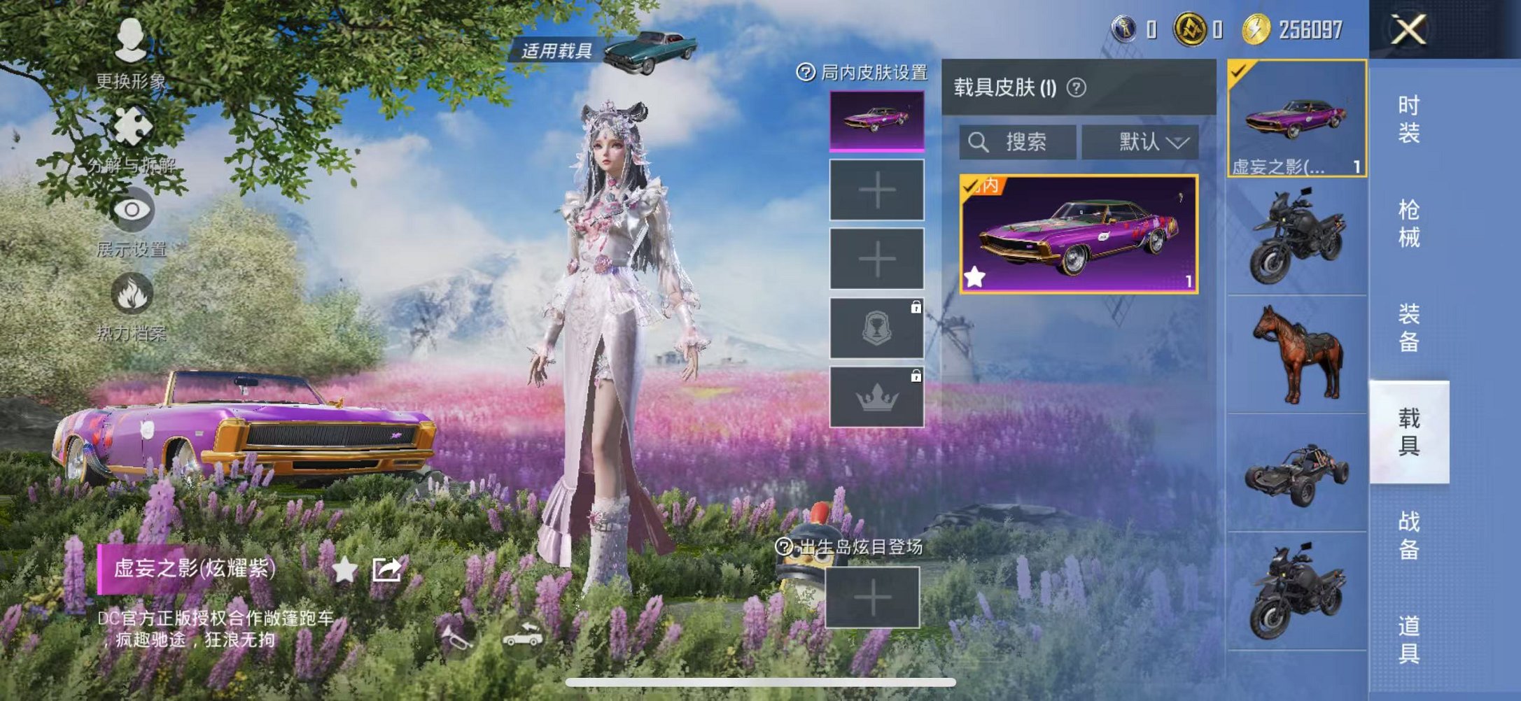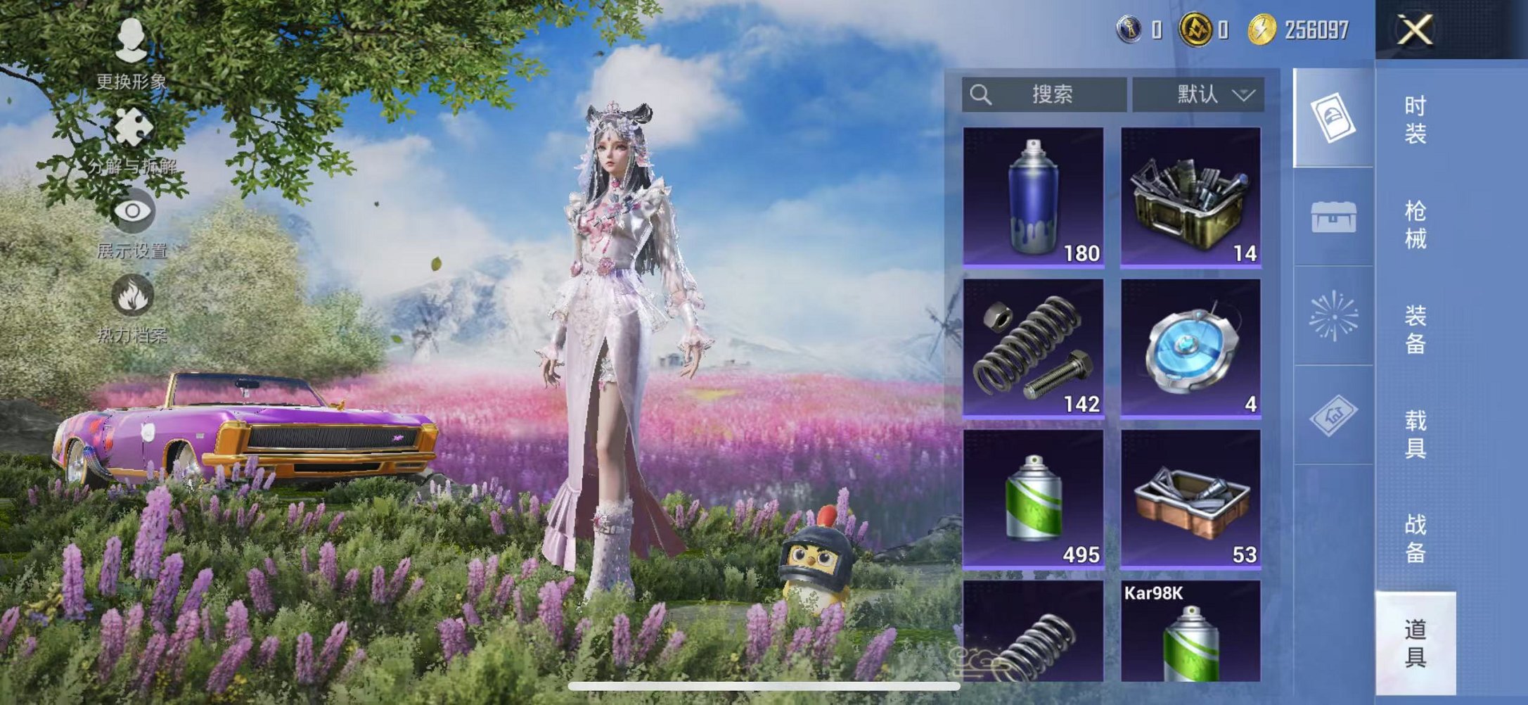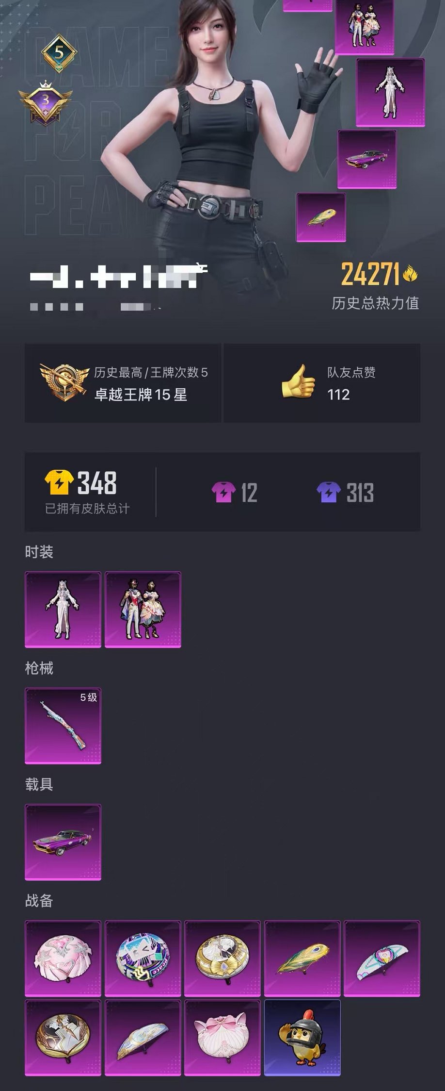 【2粉装1特效呛1载具可秒换绑】 苹果q区-24271热力值-5印记-74套装-91呛皮 【1载具】 虚妄之影炫耀紫【2粉装】 星穹咏叹调 角色-冷漠罗丽【1特效呛】 kar98k-巳巳如意5级【7热门】 长空猛禽 破蛋小黄鸡 白色伏地魔 m762-天降萌叽 ump45-蓝色火焰 dbs-彩虹符号 mg3-幻世战舞者【1飞行器】 粉色滑翔尾迹 营地id:985847008