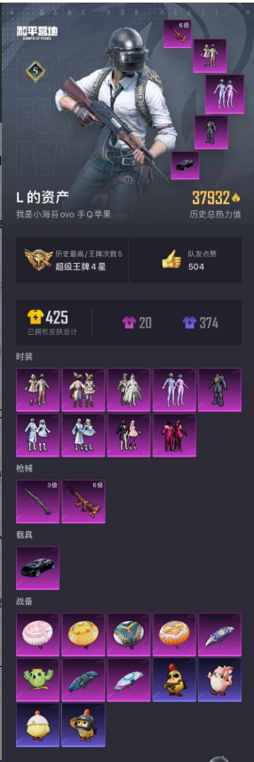 [14145362]苹果【小号/梦幻火箭/小丑鱼/百万伏特背包/9粉装-2特效呛-1载具-1粉色飞行器】 手q38251热力值-5王牌印记-108套装-123呛皮 【热门品类】:粉装-梦幻火箭,粉装-童趣迷兔,套装-小丑鱼,套装-龟仙人,套装-浪漫波比 【粉色载具】:玛莎拉蒂quattropte(夜幕蓝) 【粉色套装】:粉装-宝贝奶油派,粉装-梦幻火箭,粉装-冰霜白皇,粉装-童趣迷兔,粉装-蜜桃特工,粉装-蝶舞蔷薇,角色-复仇流浪者,粉装-傲雪凌霜,粉装-霁雪冰心 【粉色呛皮等级】:m416-风花雪月六级,dp-28-豹影疾电三级 【粉色呛皮】:m416-风花雪月,dp-28-豹影疾电 【粉色飞行器】:绿意幻情飞行器 【粉色降落伞】:四圣焕新降落伞,暗夜玫瑰降落伞,青春物语降落伞,橘柚倾心降落伞,环太平洋降落伞,垂柳戏鸭降落伞,第五大道降落伞 【稀有套装】:套装-龟仙人,角色-绛羽幽主 【稀有呛皮】:akm-夜灯,akm-彩虹符号,akm-灼热熔岩,akm-环太平洋,akm-生命誓言,akm-破晓战魂,akm-萌趣颜团子,akm-虎虎生威,m16a4-幻世战舞者,m16a4-甜心亚梦,scar-l-炫彩节奏,scar-l-玉兔迎春,scar-l-红色方程式,scar-l-黄金龙骨,m416-月影鸳鸯,m416-绯红前夜,m416-蓝色火焰,groza-异彩先驱,groza-春暖花开,groza-林间仙鹿,aug-天降萌叽,aug-海螺星光,aug-青春冒险家,q-彩虹符号,q-银碳小老虎,q-飞驰魅影,m762-彩虹甜喵,m762-呛炮玫瑰,m762-牛气冲天,m762-瑞龙福将,m762-绒雪飘舞,g36c-时空追击者,ac-val-天降萌叽,ac-val-甜心亚梦,蜜獾-垂柳戏鸭,蜜獾-天降萌叽,蜜獾-娇憨猪猪,uzi-天降萌叽,uzi-娇憨猪猪,uzi-炫彩节奏,ump45-时空追击者,ump45-灵符少年,ump45-蓝色火焰,vect-暗夜玫瑰,汤姆逊-异彩先驱,汤姆逊-环太平洋,mp5k-异彩先驱,p90-飞驰魅影,kar98k-彩虹符号,kar98k-灵符少年,kar98k-炫彩节奏,kar98k-蓝莓炮弹,kar98k-飞驰魅影,m24-影袭,awm-垂柳戏鸭,awm-恐龙拽拽,sks-天之羽翼,sks-时空追击者,sks-炫彩节奏,v