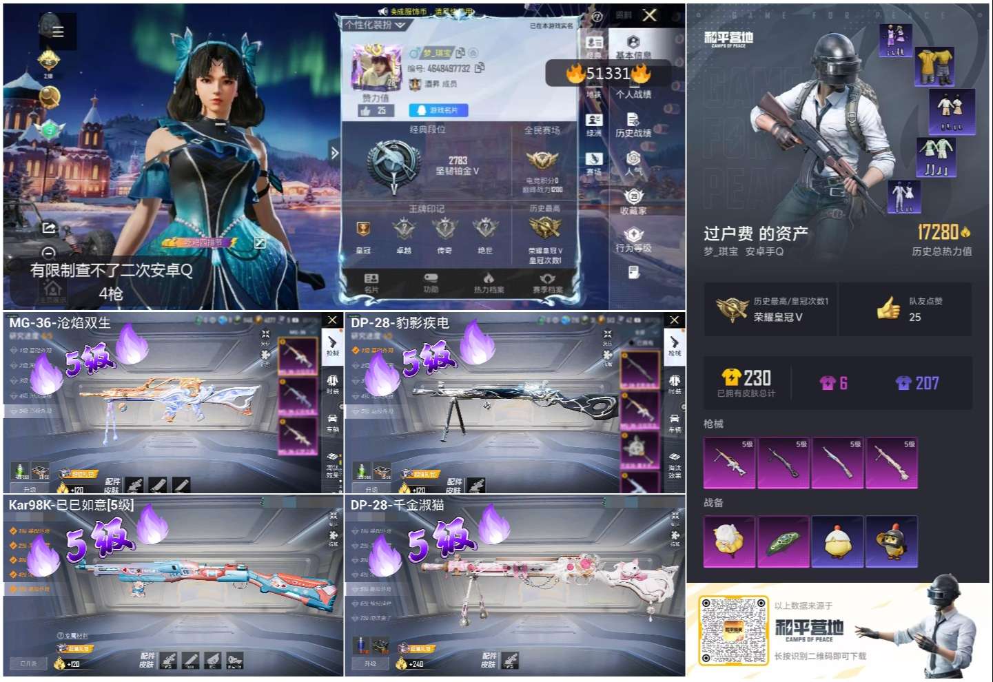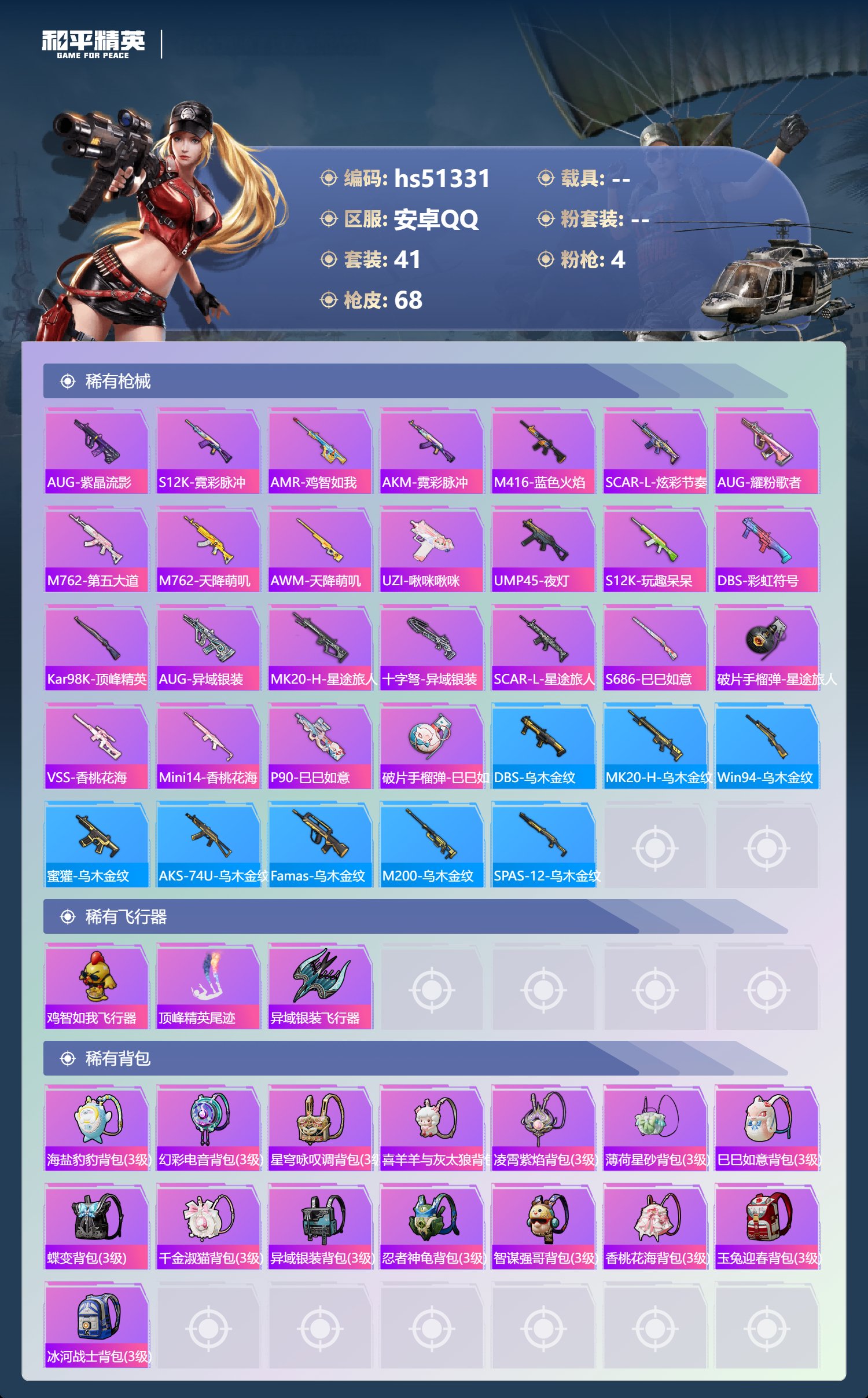 hs51331 安卓手q-0王牌印记-4特效呛-17280热力值-41套装-68呛皮【4特效呛】dp-28-豹影疾电/5级mg-36-沧焰双生/5级kar98k-巳巳如意/5级dp-28-千金淑猫/5级【1稀有紫装】暗夜魅影【41稀有时装】ss35特训午间小调ss33特训恋语绒绒ss34特训朱霞炽焰大橘大利暗夜魅影游乐凌霄紫焰云魄琉璃元气之梦蜜露汐语漫游都市