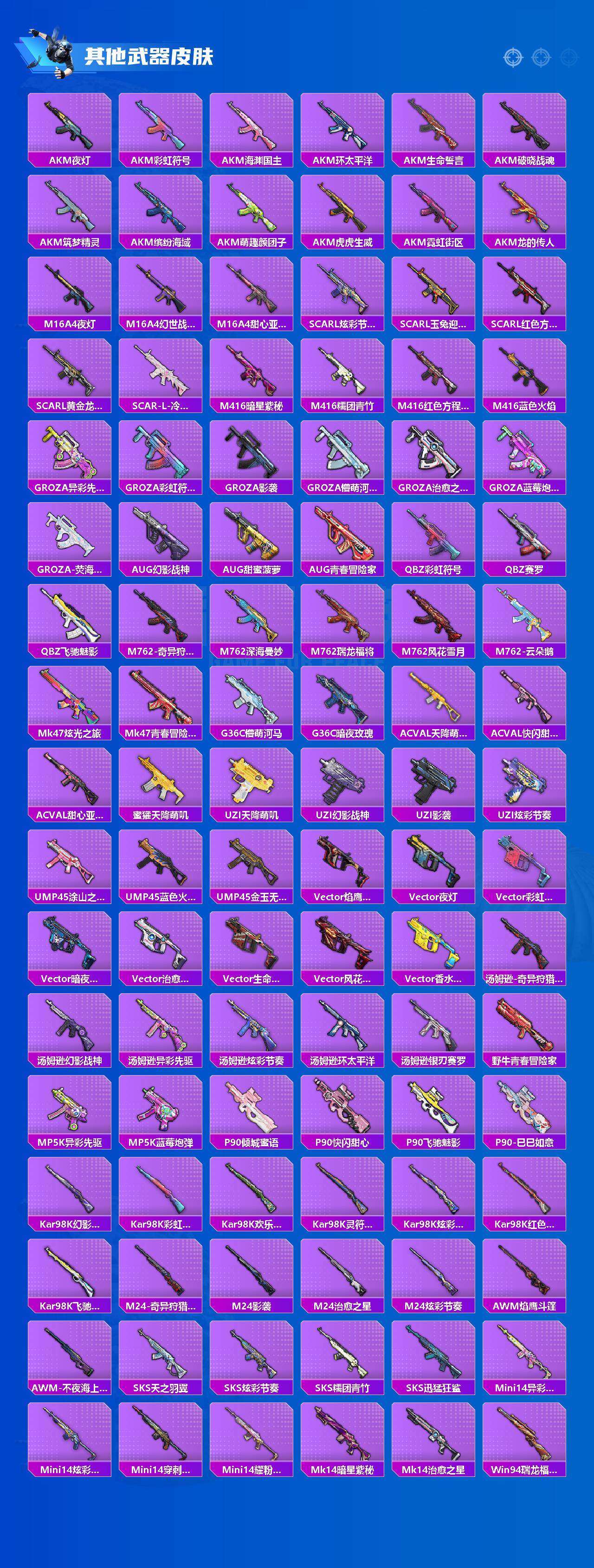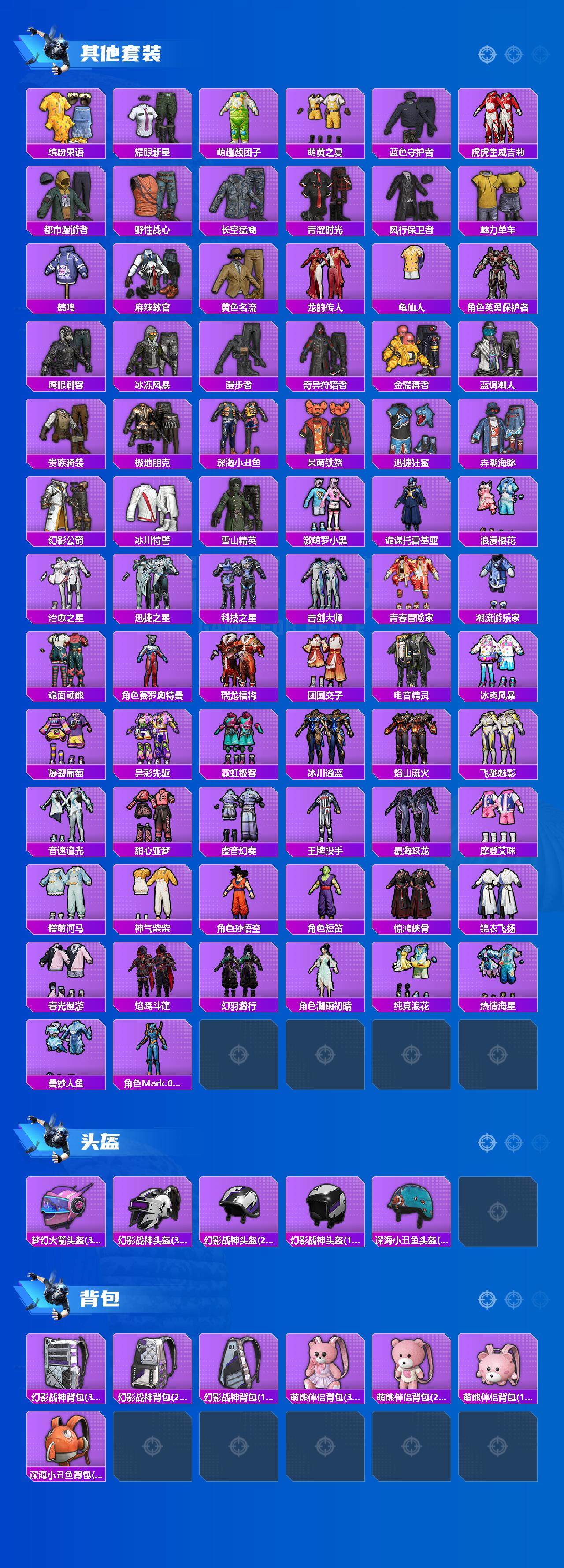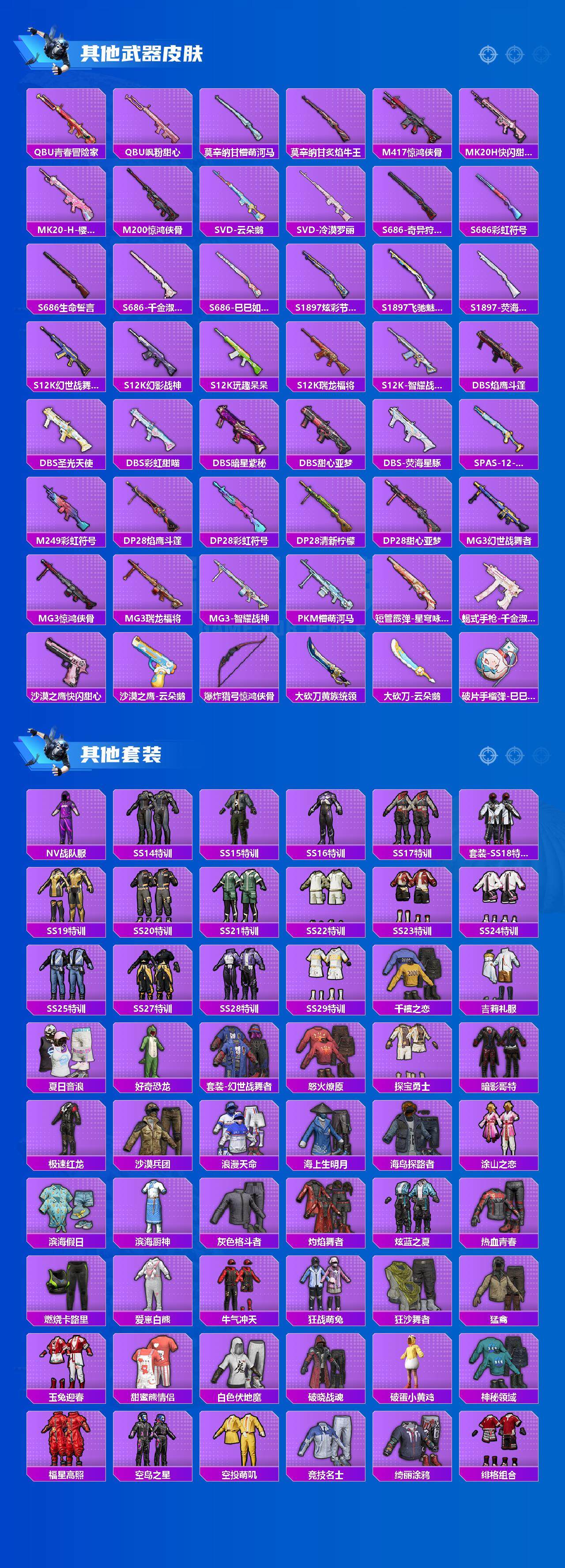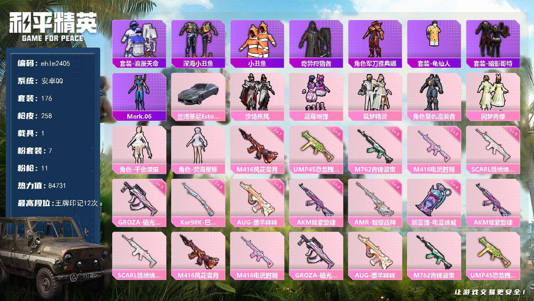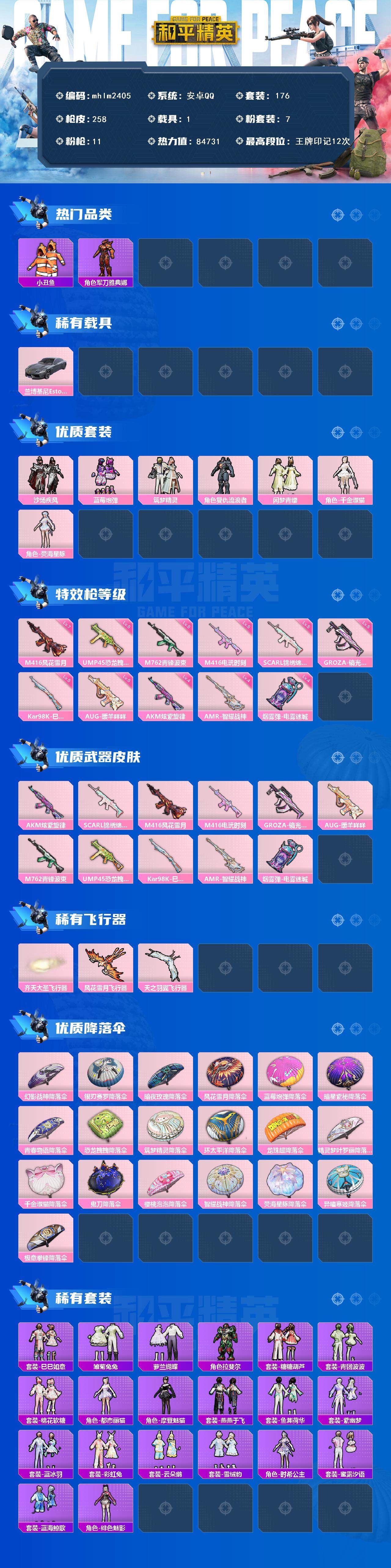 [14155125]【mhlm2405】安卓 手q-7粉装-11特效呛-1载具-5粉色飞行器-84731热力值-12王牌印记-176套装-258呛皮 【热门品类】:套装-浪漫天命,套装-深海小丑鱼,套装-小丑鱼,套装-奇异狩猎者,角色-军刀雅典娜,套装-龟仙人,套装-暗影哥特,角色-mark.06 【粉色载具】:兰博基尼estoque(银翼灰) 【粉色套装】:粉装-沙场疾风,粉装-蓝莓炮弹,粉装-筑梦精灵,角色-复仇流浪者,粉装-闲梦青缨,角色-千金淑猫,角色-荧海星豚 【粉色呛皮等级】:akm-炫紫旋律四级,scar-l-锦绣绵绵五级,m416-风花雪月七级,m416-电玩时刻五级,groza-镜光银凌五级,aug-暖羊咩咩五级,m762-青锋波束五级,ump45-恐龙拽拽五级,kar98k-巳巳如意五级,amr-智耀战神四级,盐雾蛋-电雾迷城四级 【粉色呛皮】:akm-炫紫旋律,scar-l-锦绣绵绵,m416-风花雪月,m416-电玩时刻,groza-镜光银凌,aug-暖羊咩咩,m762-青锋波束,ump45-恐龙拽拽,kar98k-巳巳如意,amr-智耀战神,盐雾蛋-电雾迷城 【粉色飞行器】:齐天大圣飞行器,风花雪月飞行器,天之羽翼飞行器 【粉色降落伞】:幻影战神降落伞,银刃赛罗降落伞,暗夜玫瑰降落伞,风花雪月降落伞,蓝莓炮弹降落伞,暗星紫秘降落伞,青春物语降落伞,恐龙拽拽降落伞,筑梦精灵降落伞,环太平洋降落伞,龙珠超降落伞,精灵梦叶罗丽降落伞,千金淑猫降落伞,鬼刀降落伞,樱桃泡泡降落伞,智耀战神降落伞,荧海星豚降落伞,异瞳寒姬降落伞,极意拳锋降落伞 【稀有套装】:套装-龟仙人,套装-巳巳如意,套装-雏菊兔兔,套装-萝兰蝴蝶,角色-拉斐尔,套装-糖糖葫芦,套装-青团波波,套装-棉花软糖,角色-都市丽猫,角色-摩登魅猫,套装-燕燕于飞,套装-鱼渊荷华,套装-紫幽梦,套装-蓝冰羽,套装-彩虹兔,套装-云朵鹅,套装-雪绒豹,角色-时希公主,套装-蜜露汐语,套装-蓝海鲸歌,角色-绯色魅影,套装-炫彩糖果 【稀有呛皮】:akm-夜灯,akm-彩虹符号,akm-海渊国主,akm-环太平洋,akm-生命誓言,akm-破晓战魂,akm-筑梦精灵,akm-缤纷海域,akm-萌趣颜团子,akm-虎虎生威,akm-霓虹街区,akm-龙的传人,m16a4-