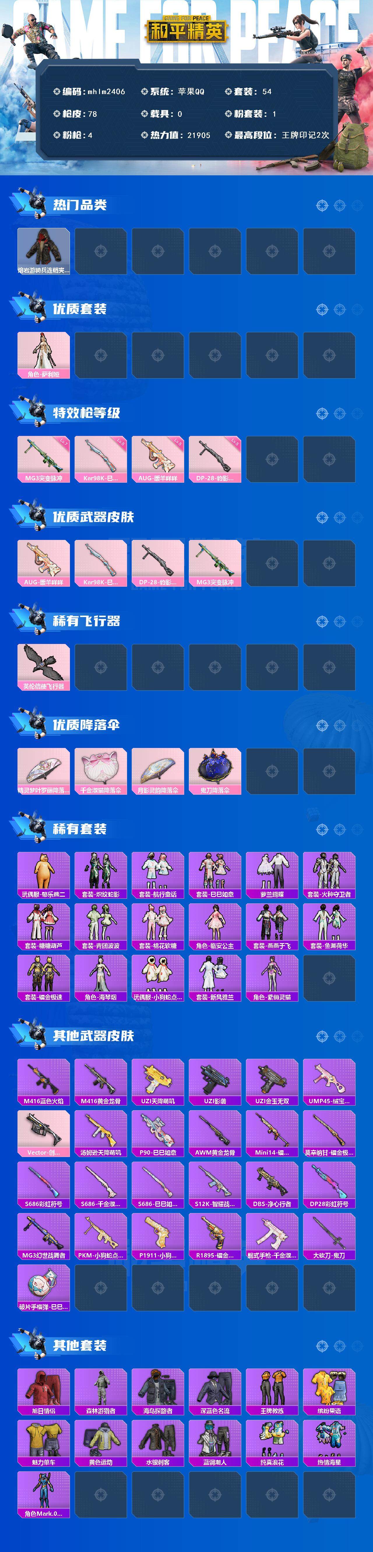 [14155159]【mhlm2406】苹果 手q-1粉装-4特效呛-0载具-1粉色飞行器-21905热力值-2王牌印记-54套装-78呛皮 【热门品类】:角色-mark.06,熔岩游骑兵连帽夹克 【粉色套装】:角色-萨利娅 【粉色呛皮等级】:aug-暖羊咩咩五级,kar98k-巳巳如意五级,dp-28-豹影疾电五级,mg3-突变脉冲七级 【粉色呛皮】:aug-暖羊咩咩,kar98k-巳巳如意,dp-28-豹影疾电,mg3-突变脉冲 【粉色飞行器】:英伦信使飞行器 【粉色降落伞】:精灵梦叶罗丽降落伞,千金淑猫降落伞,月影灵韵降落伞,鬼刀降落伞 【稀有套装】:玩偶服-憨乐熊二,套装-炽纹蛇影,套装-航行童话,套装-巳巳如意,套装-萝兰蝴蝶,套装-火种守卫者,套装-糖糖葫芦,套装-青团波波,套装-棉花软糖,角色-临安公主,套装-燕燕于飞,套装-鱼渊荷华,套装-镭金极速,角色-海琴烟,玩偶服-小狗蛇点点,套装-新风雅兰,角色-紫俏灵猫 【稀有呛皮】:m416-蓝色火焰,m416-黄金龙骨,uzi-天降萌叽,uzi-影袭,uzi-金玉无双,ump45-绒宝小鹅,vect-创世·救赎,汤姆逊-天降萌叽,p90-巳巳如意,awm-黄金龙骨,mini14-镭金极速,莫辛纳甘-镭金极速,s686-彩虹符号,s686-巳巳如意,s686-千金淑猫,s12k-智耀战神,dbs-净心行者,dp-28-彩虹符号,mg3-幻世战舞者,pkm-小狗蛇点点,p1911-小狗蛇点点,r1895-镭金极速,蝎式手呛-千金淑猫,大砍刀-鬼刀,破片手留单-巳巳如意 【其他套装】:套装-旭日情侣,套装-森林游猎者,套装-海岛探路者,套装-深蓝色名流,套装-王牌教练,套装-缤纷果语,套装-魅力单车,套装-黄色运动,套装-水银刺客,套装-蓝调潮人,套装-纯真浪花,套装-热情海星,角色-mark.06 【稀有头盔】:金羽特工头盔3级,金羽特工头盔2级,金羽特工头盔1级 【稀有背包】:金羽特工背包3级,金羽特工背包2级,金羽特工背包1级 【营地id】:934091857