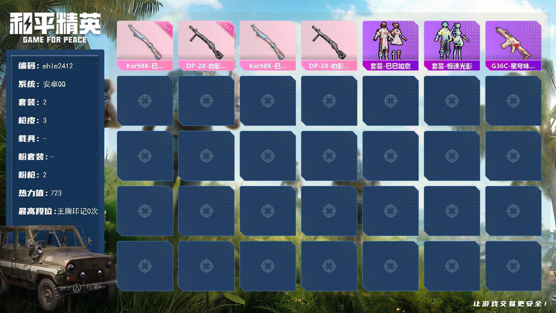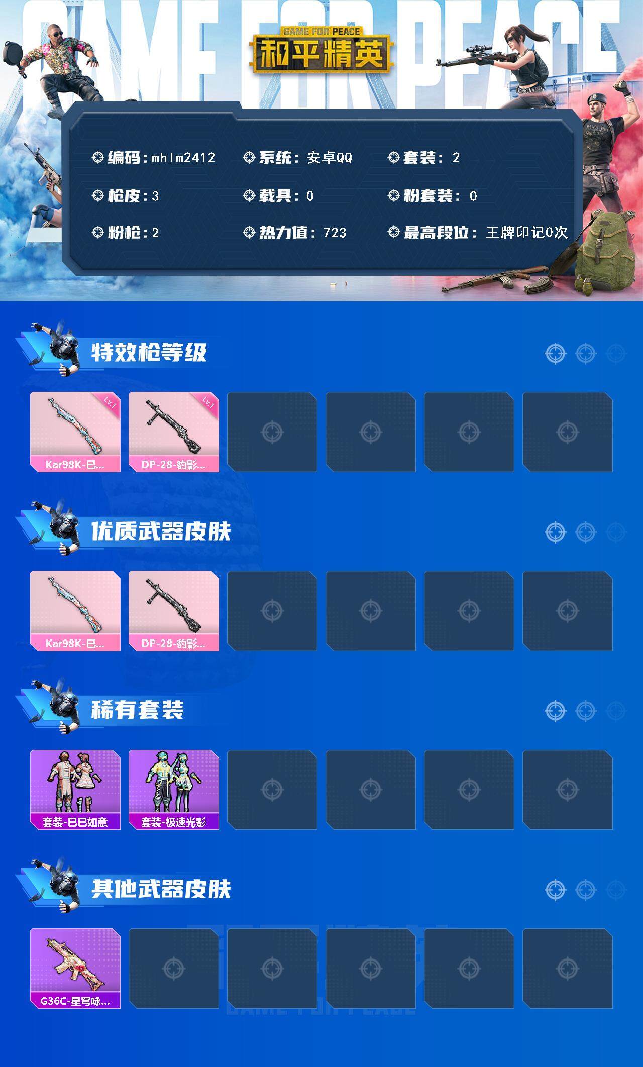 [14155442]【mhlm2412】安卓 手q-0粉装-2特效呛-0载具-0粉色飞行器-723热力值-0王牌印记-2套装-3呛皮 【粉色呛皮等级】:kar98k-巳巳如意一级,dp-28-豹影疾电一级 【粉色呛皮】:kar98k-巳巳如意,dp-28-豹影疾电 【稀有套装】:套装-巳巳如意,套装-极速光影 【稀有呛皮】:g36c-星穹咏叹调 【营地id】:1029351071