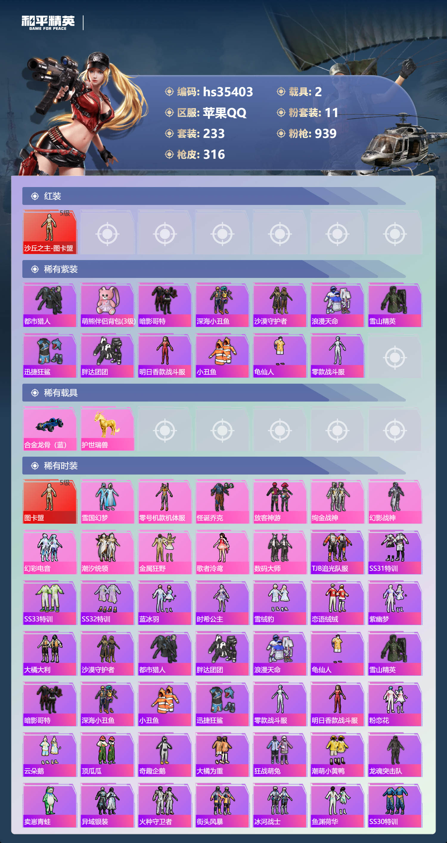 hs35403 苹果手q-26王牌印记-有战神框-1红装-11粉装-11特效呛-2载具-热力值-233套装-316呛皮-5卓越印记-2传奇印记 【1红装】沙丘之主-图卡盟/5级 【11粉装