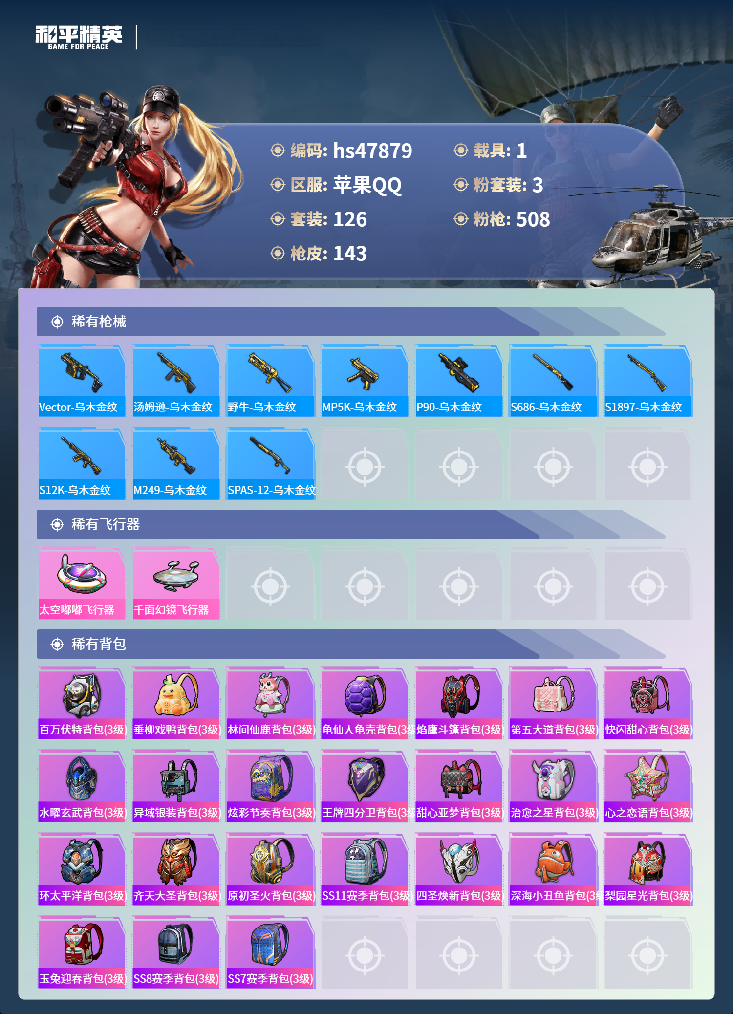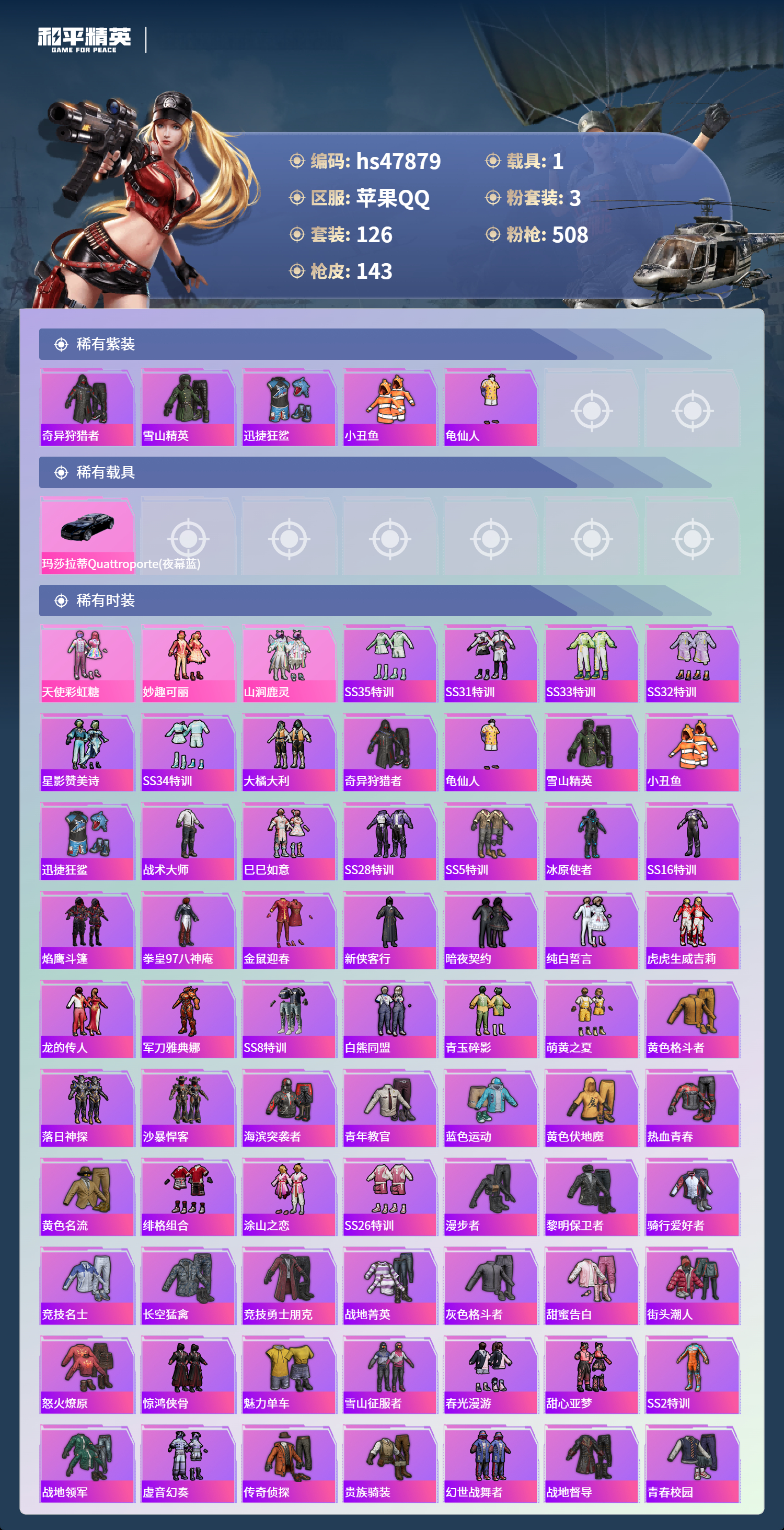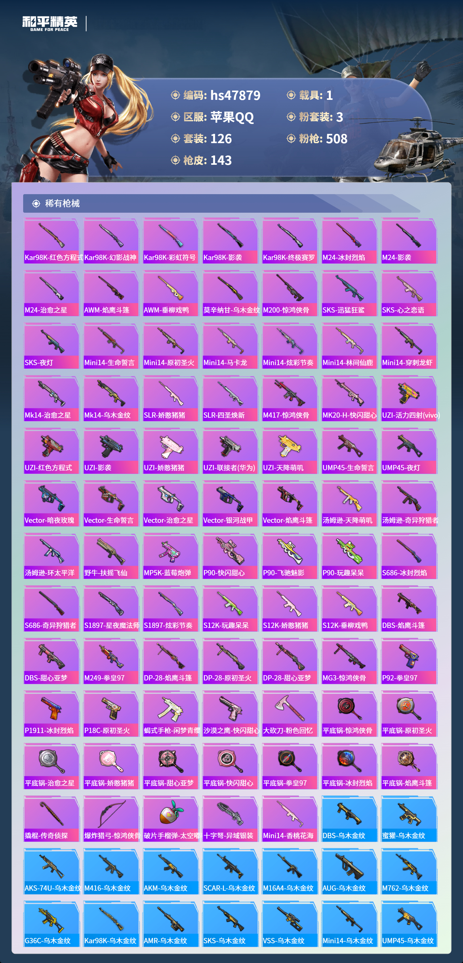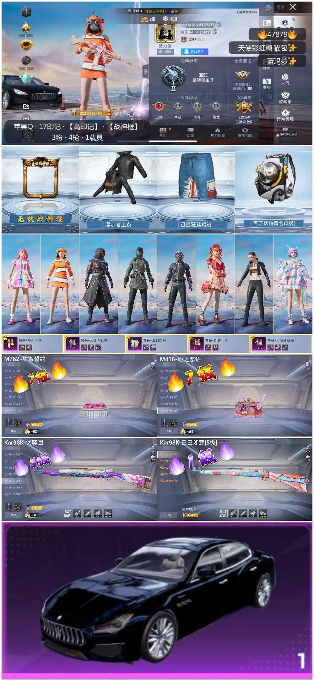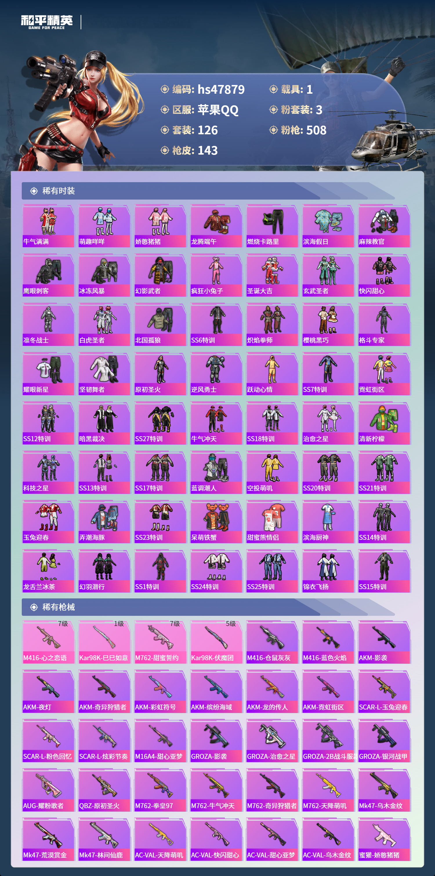 hs47879 苹果手q-17王牌印记-有战神框-3粉装-4特效呛-1载具-48444热力值-126套装-143呛皮 【3粉装】套装-天使彩虹糖套装-山涧鹿灵套装-妙趣可丽 【4特效呛】m416-