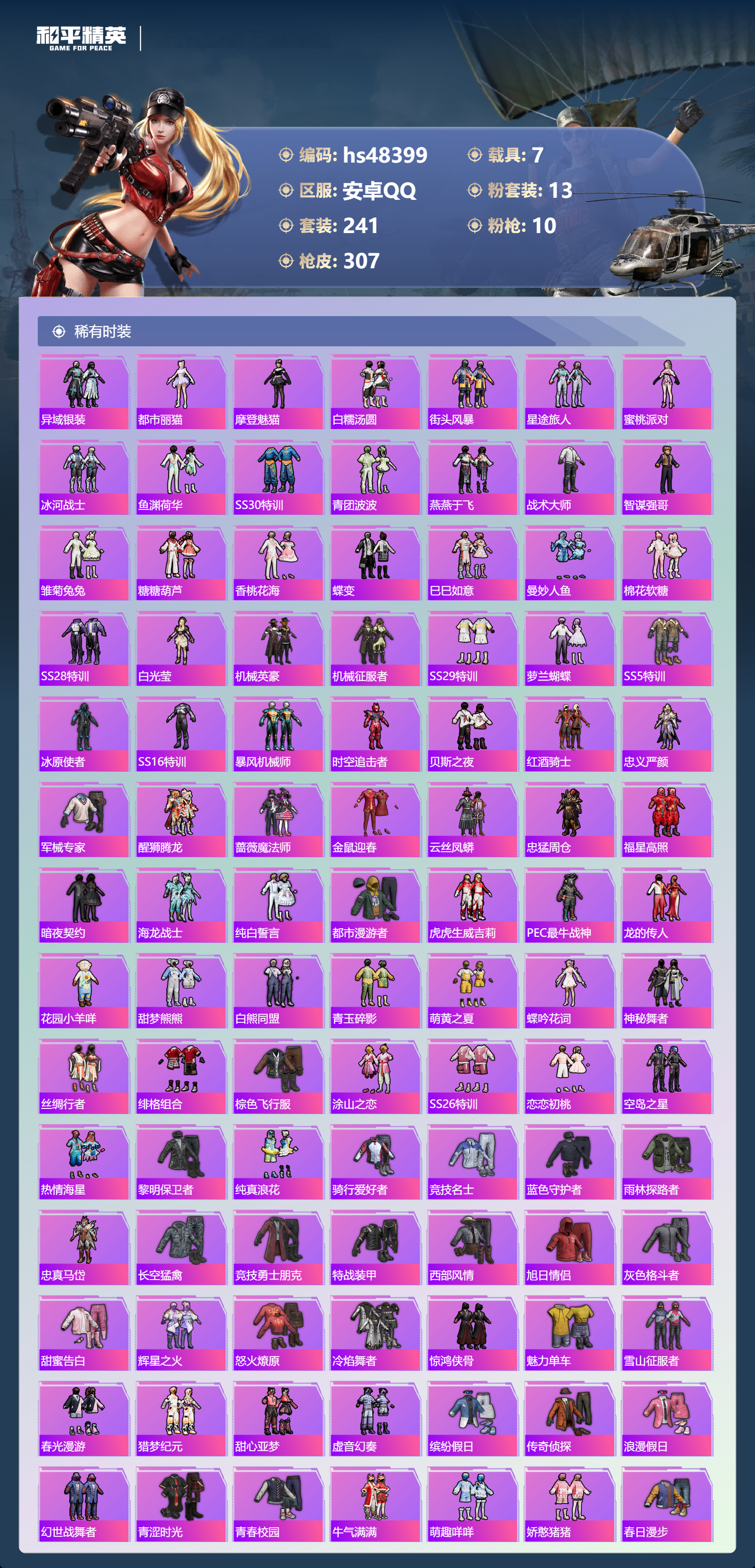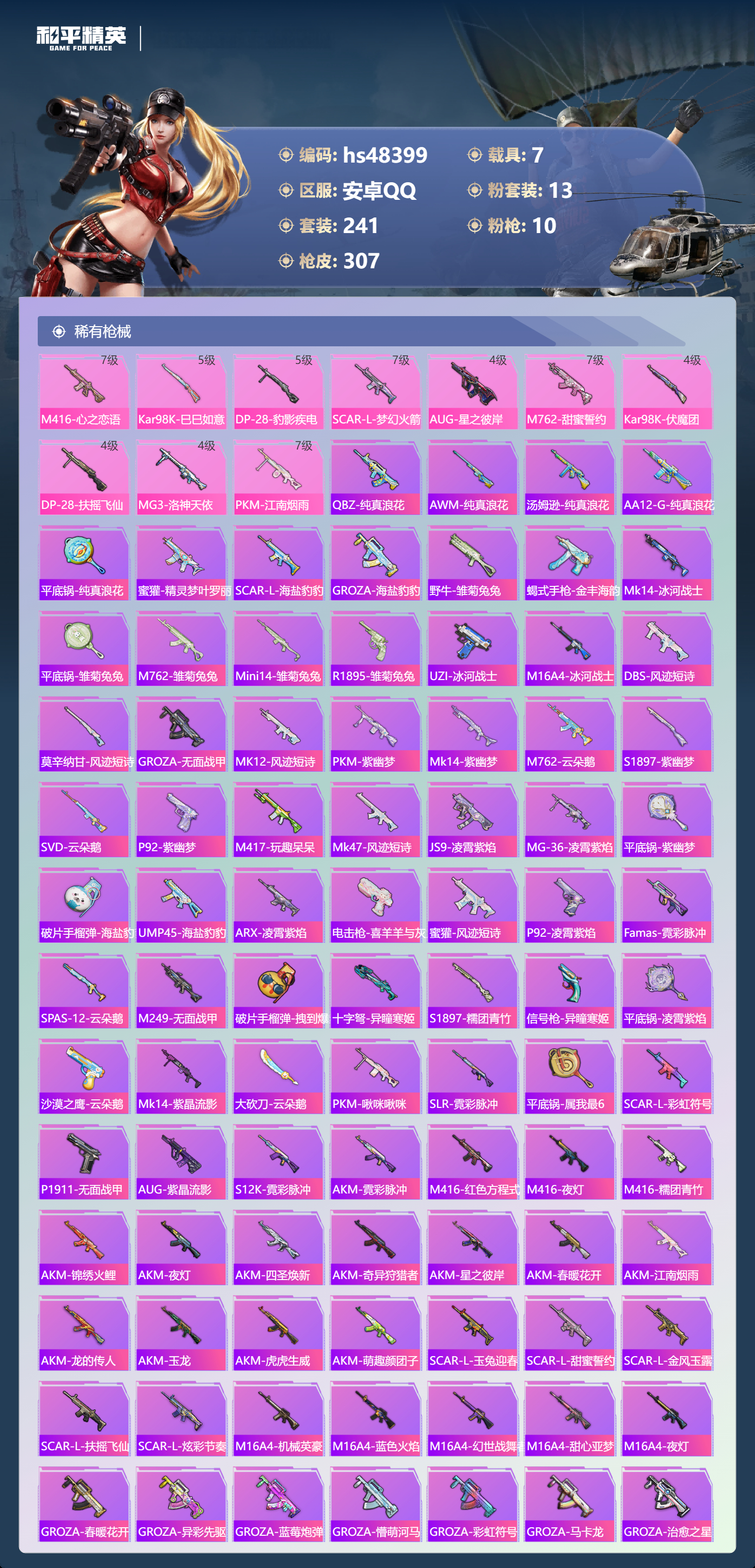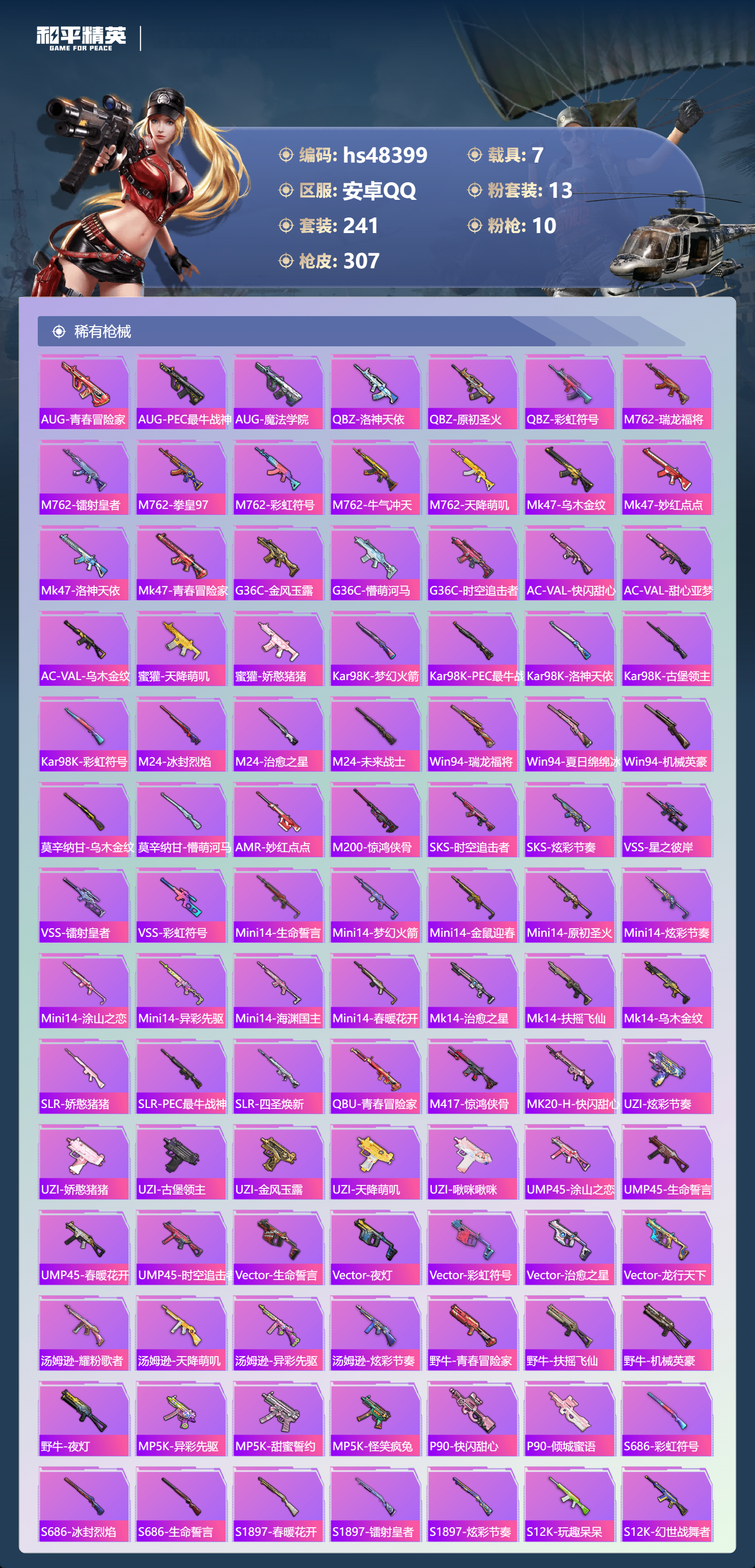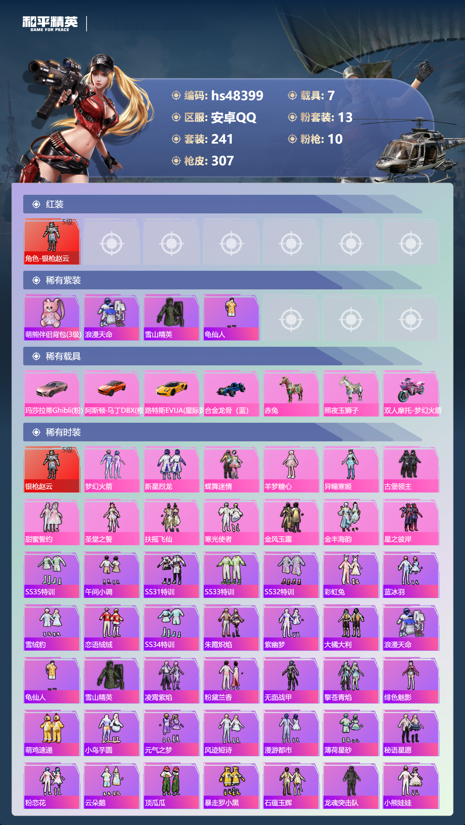 hs48399 安卓手q-21王牌印记-1红装-13粉装-10特效呛-7载具-热力值-241套装-307呛皮-7卓越印记-3传奇印记 【1红装】角色-银呛赵云/5级 【13粉装】套装-古堡