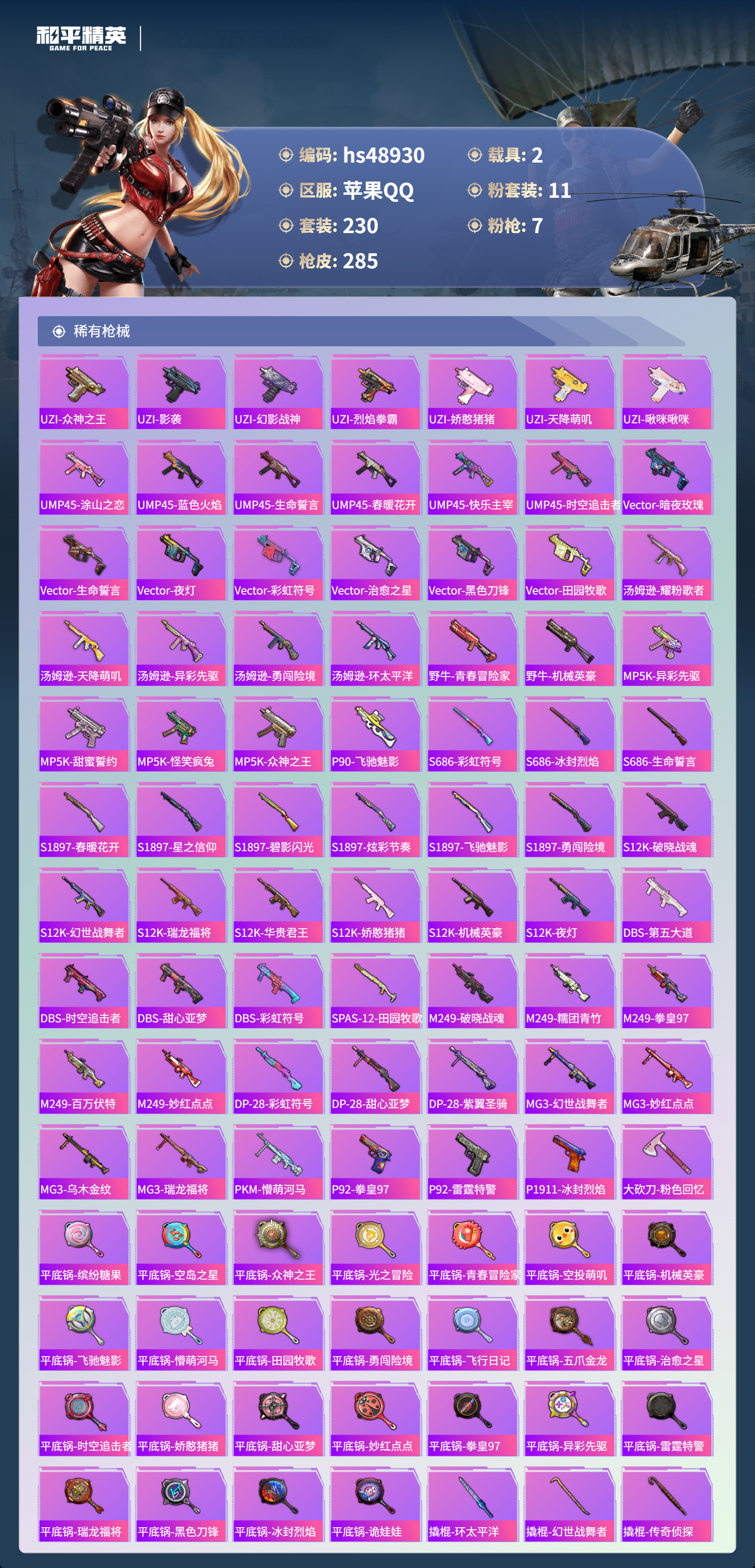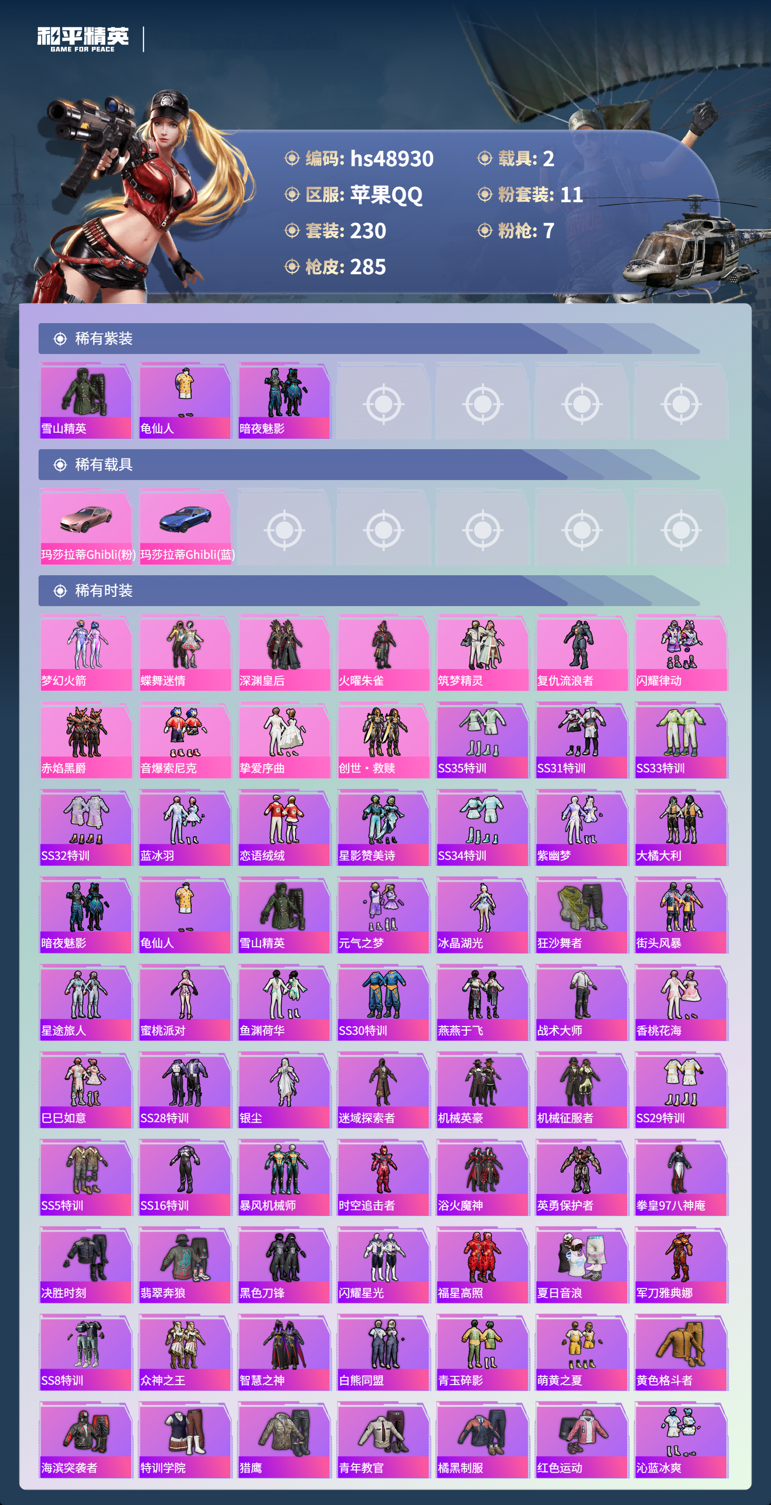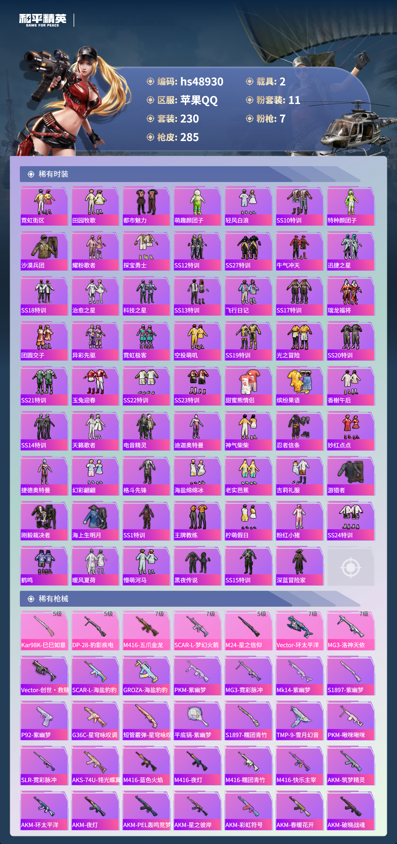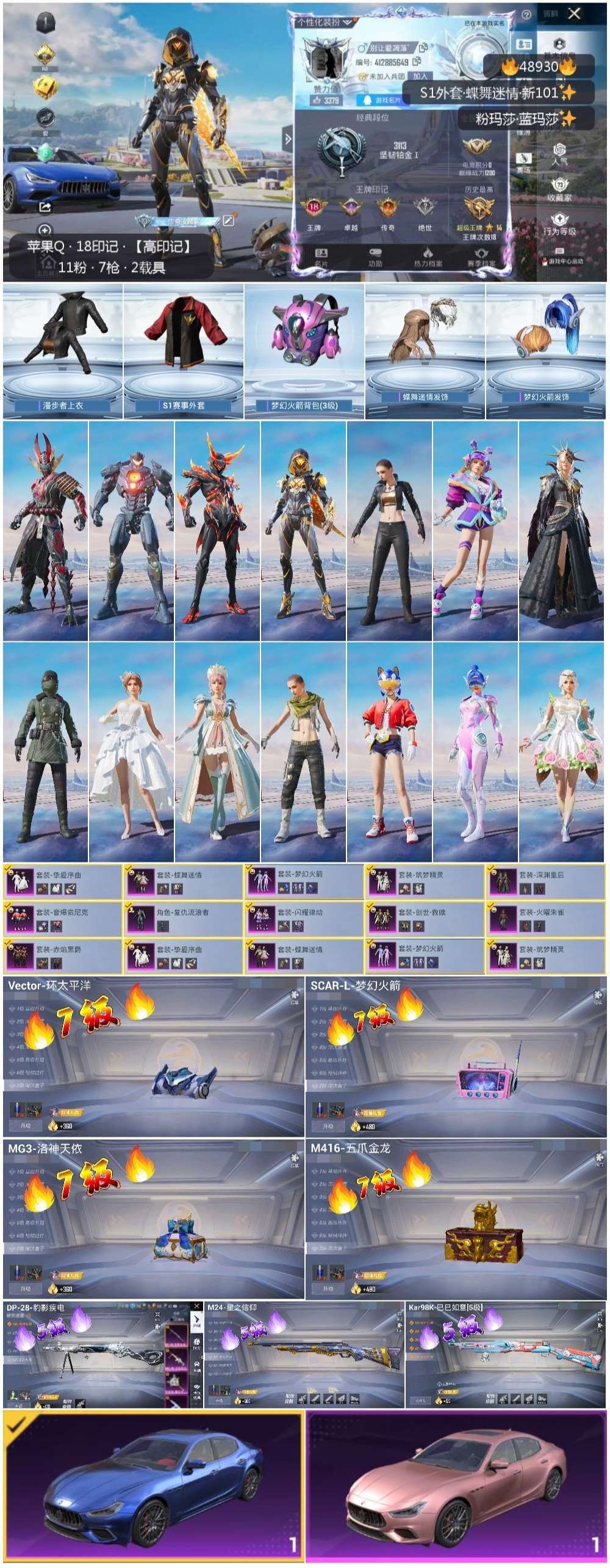 hs48930 苹果手q-18王牌印记-11粉装-7特效呛-2载具-98322热力值-230套装-285呛皮-4卓越印记-2传奇印记【11粉装】套装-深渊皇后套装-火曜朱雀套装-梦幻火箭套装-蝶舞迷情套装-筑梦精灵角色-复仇流浪者套装-闪耀律动套装-赤焰黑爵套装-音爆索尼克套装-挚爱序曲套装-创世·救赎【7特效呛】scar-l-梦幻火箭/7级m416-五爪金龙/7级m2