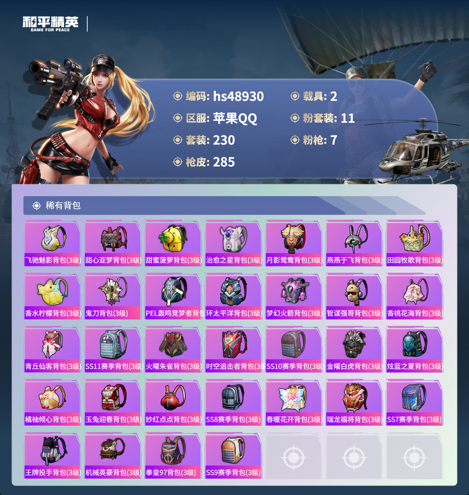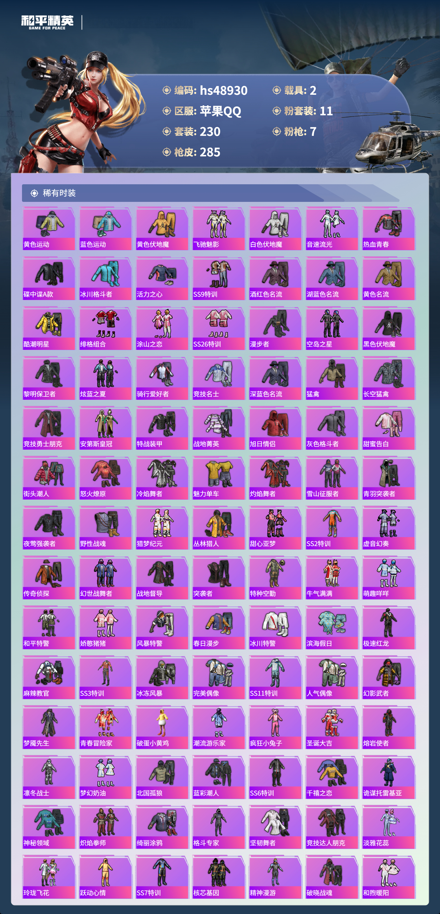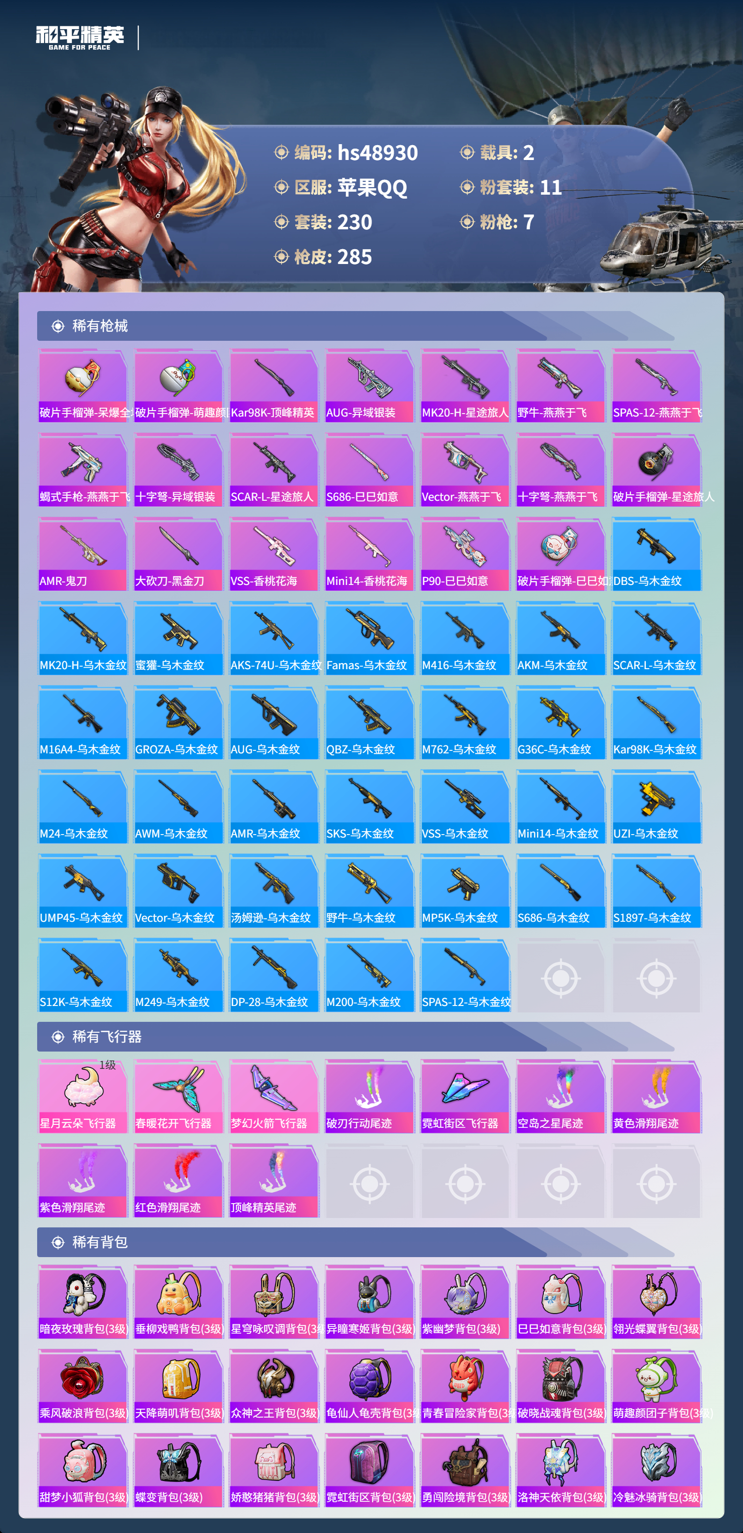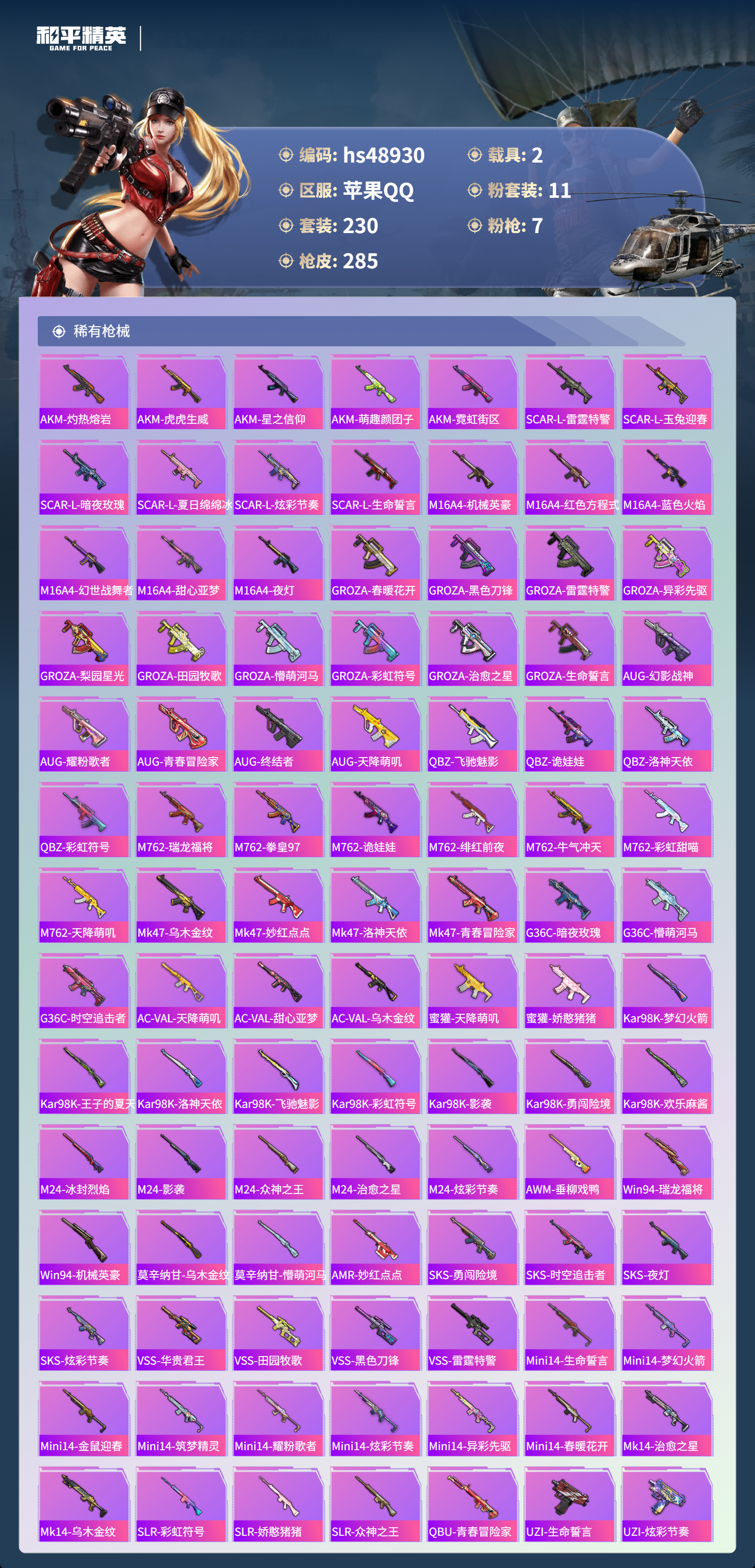 hs48930 苹果手q-18王牌印记-11粉装-7特效呛-2载具-98322热力值-230套装-285呛皮-4卓越印记-2传奇印记【11粉装】套装-深渊皇后套装-火曜朱雀套装-梦幻火箭套装-蝶舞迷情套装-筑梦精灵角色-复仇流浪者套装-闪耀律动套装-赤焰黑爵套装-音爆索尼克套装-挚爱序曲套装-创世·救赎【7特效呛】scar-l-梦幻火箭/7级m416-五爪金龙/7级m2