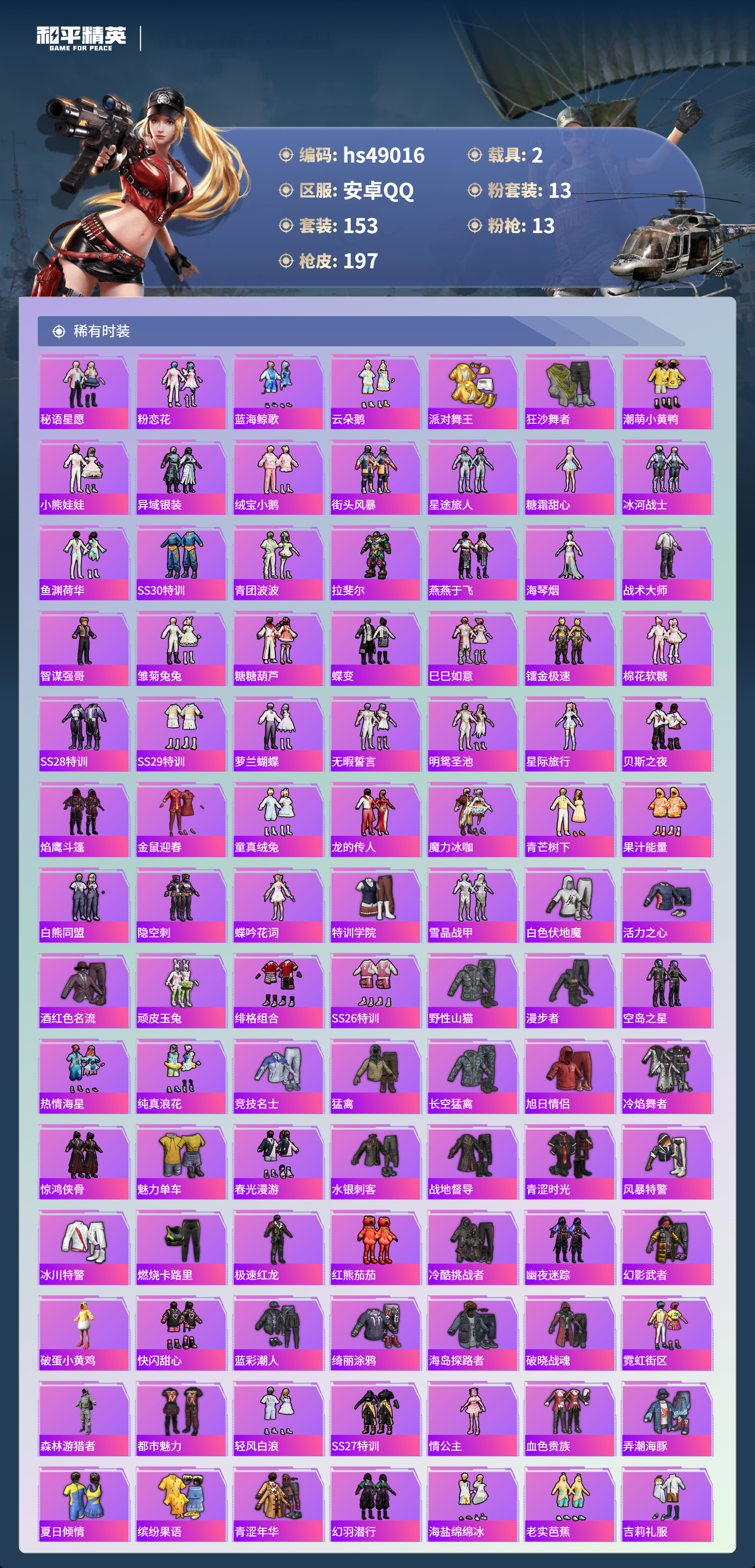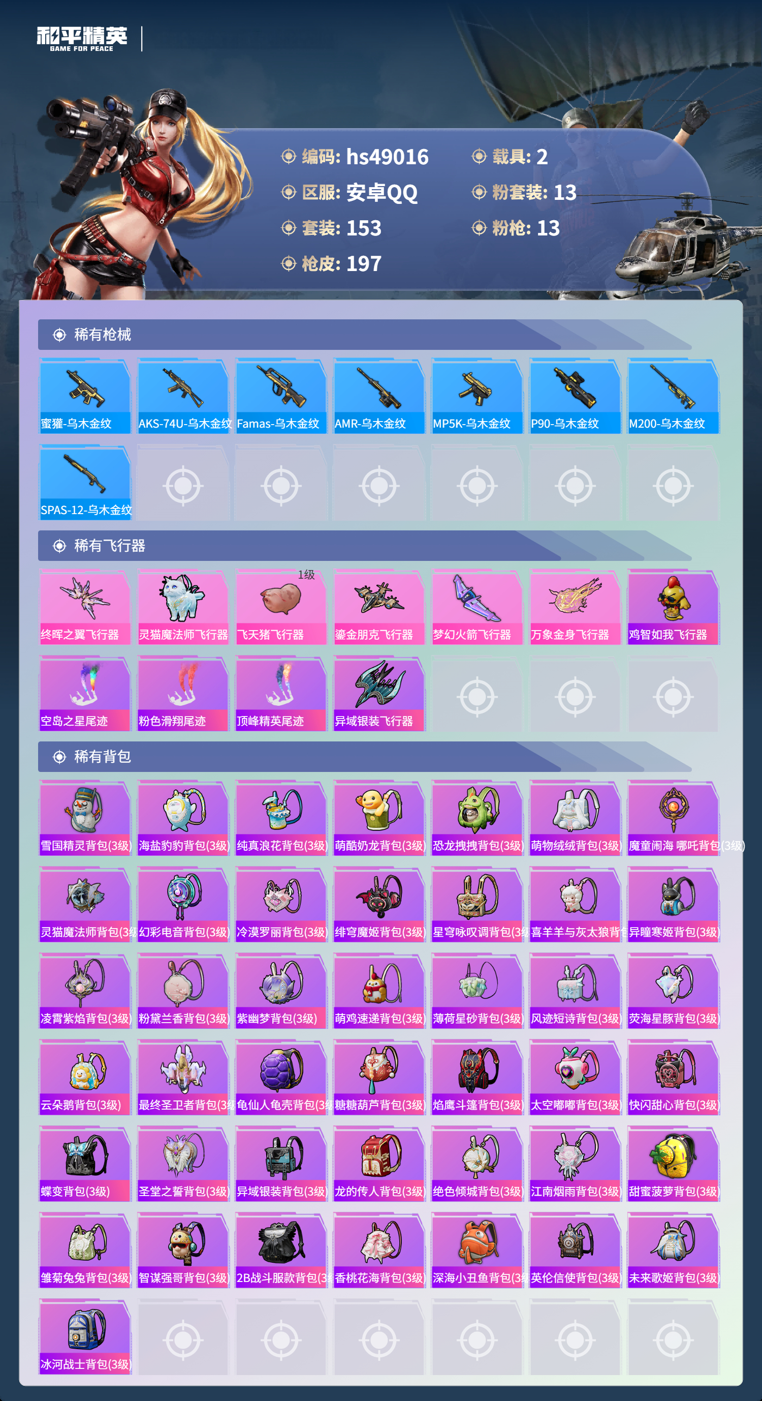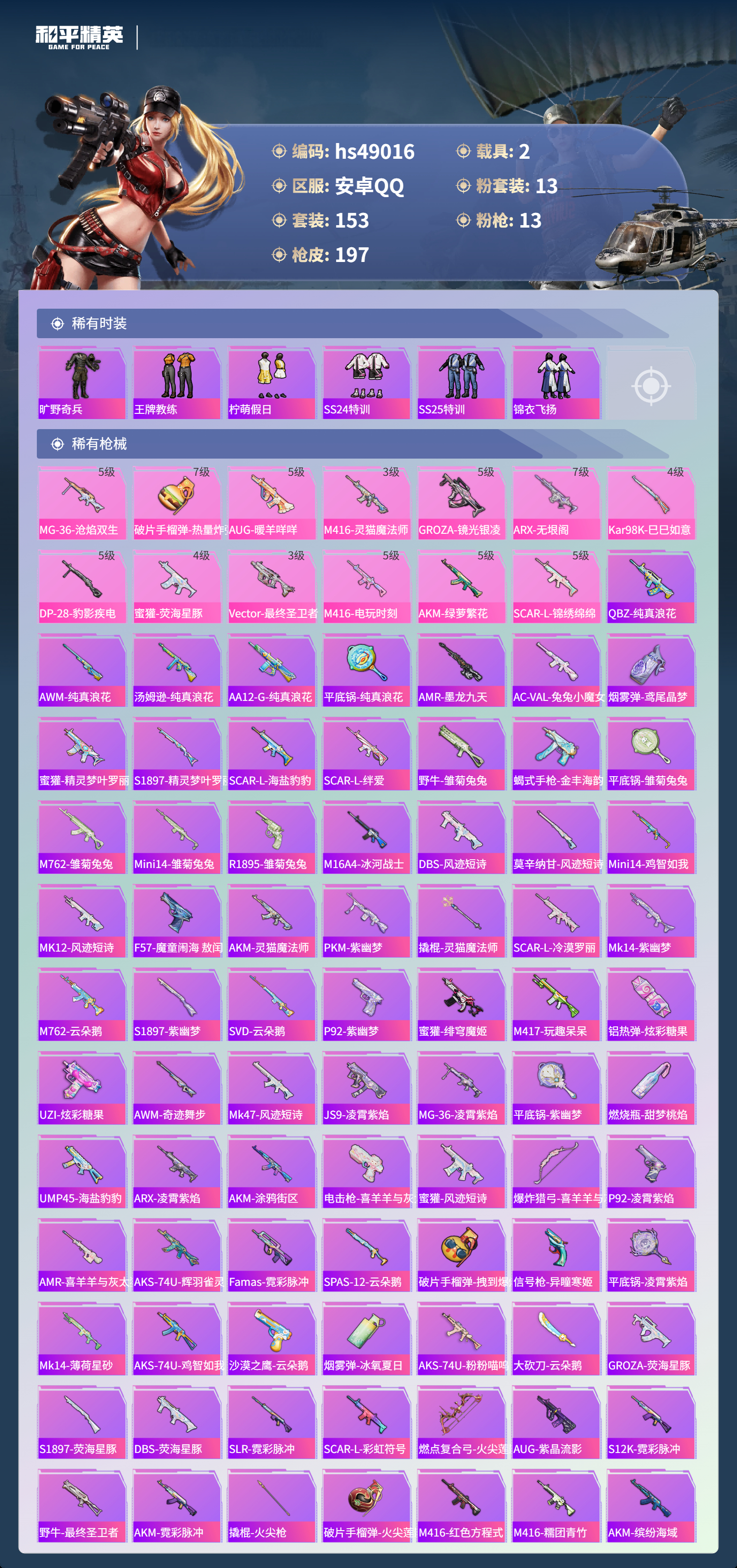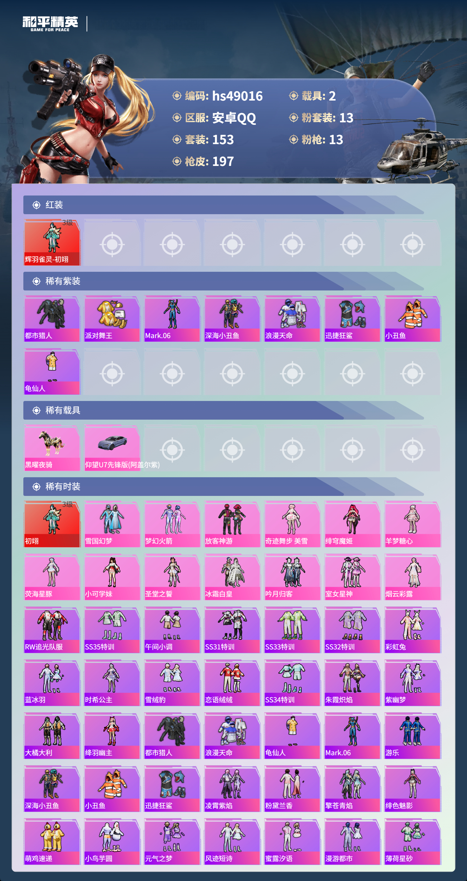 hs49016 安卓手q-11王牌印记-1红装-13粉装-13特效呛-2载具-74204热力值-153套装-197呛皮-4卓越印记-2传奇印记【1红装】辉羽雀灵-初翊/3级【13粉装】套装-雪国幻梦套装-梦幻火箭套装-放客神游套装-冰霜白皇套装-室女星神套装-吟月归客角色-小可学妹角色-圣堂之誓角色-烟云彩露角色-绯穹魔姬角色-羊梦糖心角色-荧海星豚角色-奇迹舞步 美雪