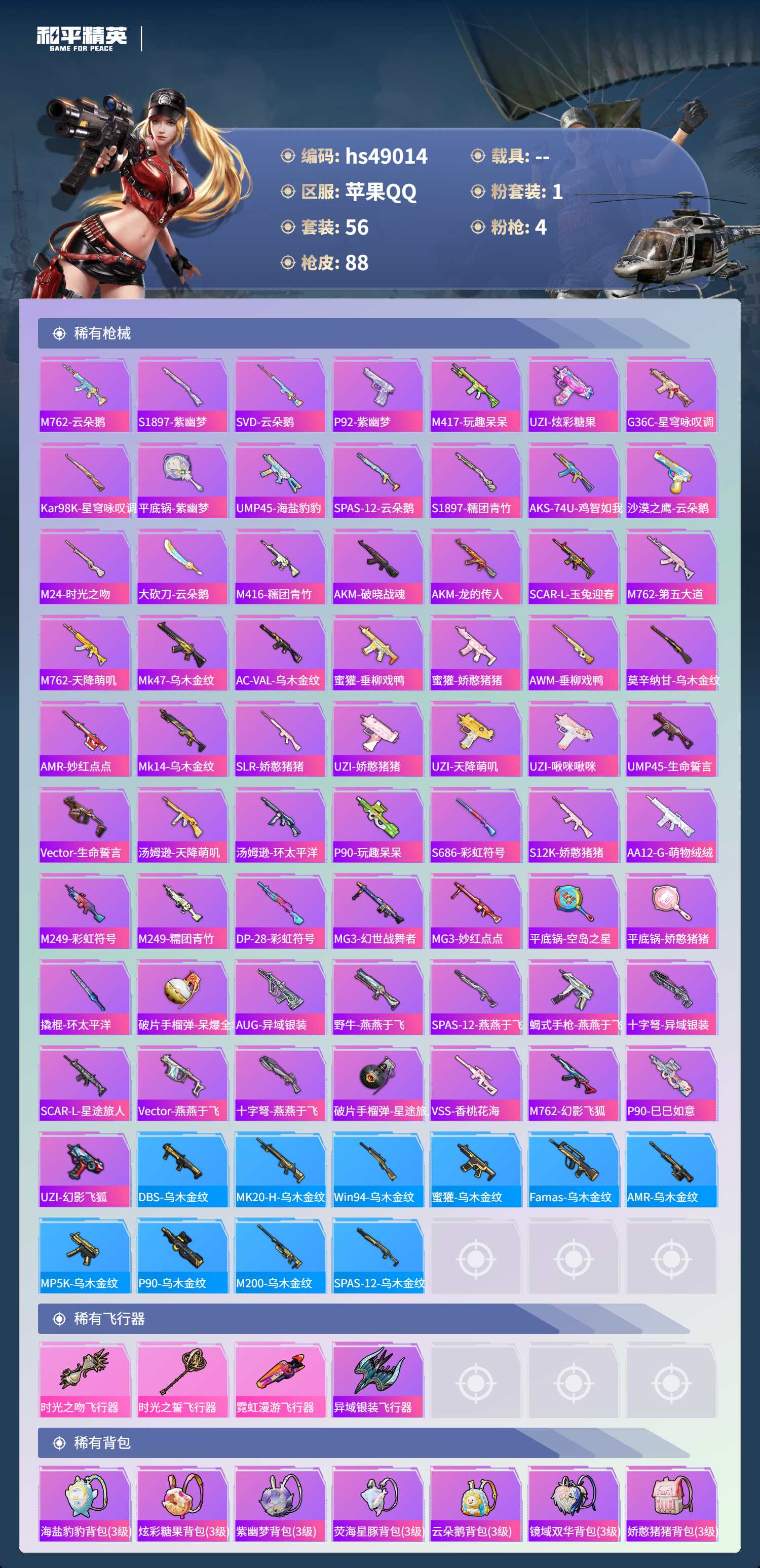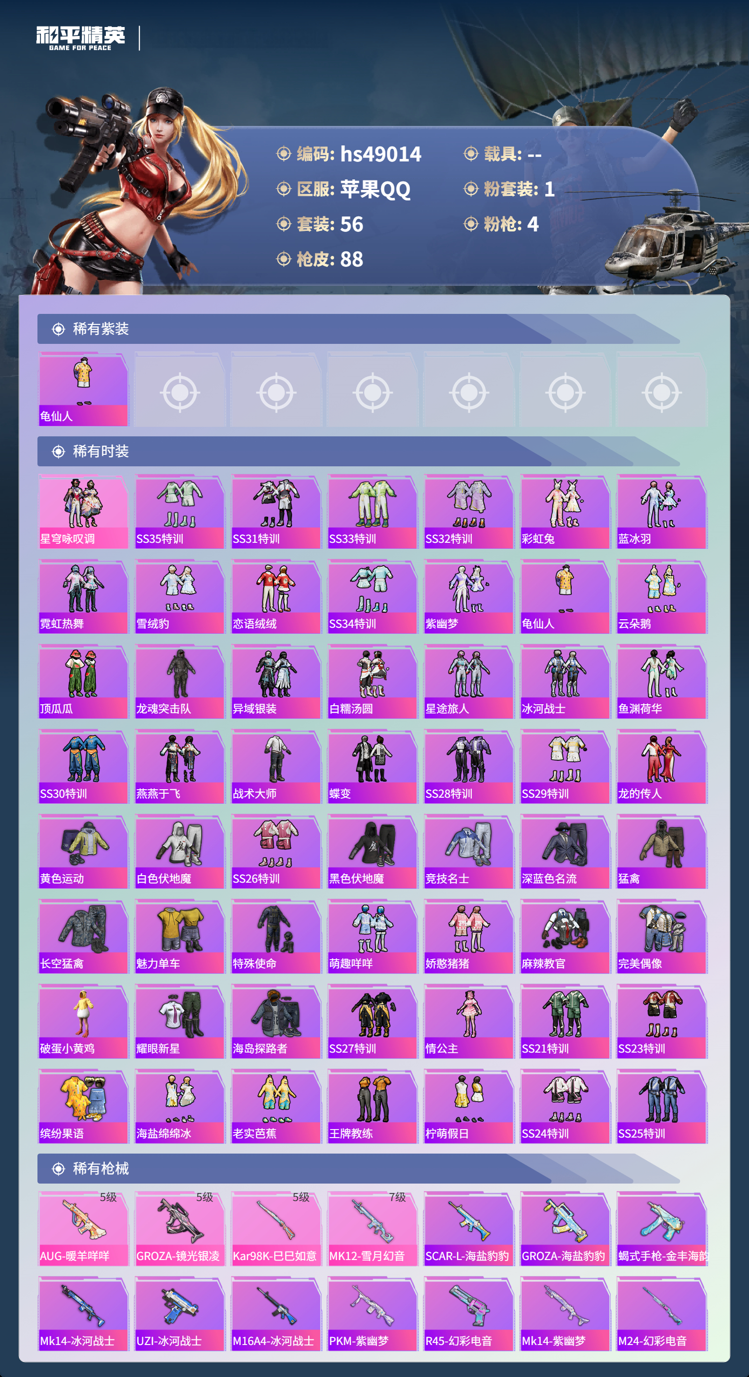 hs49014 苹果手q-8王牌印记-1粉装-4特效呛-26003热力值-56套装-88呛皮-1卓越印记-1传奇印记【1粉装】套装-星穹咏叹调【4特效呛】groza-镜光银凌/5级aug-暖羊咩咩/5级kar98k-巳巳如意/5级12-雪月幻音/7级【1稀有紫装】龟仙人【56稀有时装】星穹咏叹调ss35特训ss31特训ss33特训ss32特训彩虹兔蓝冰羽霓虹热舞雪