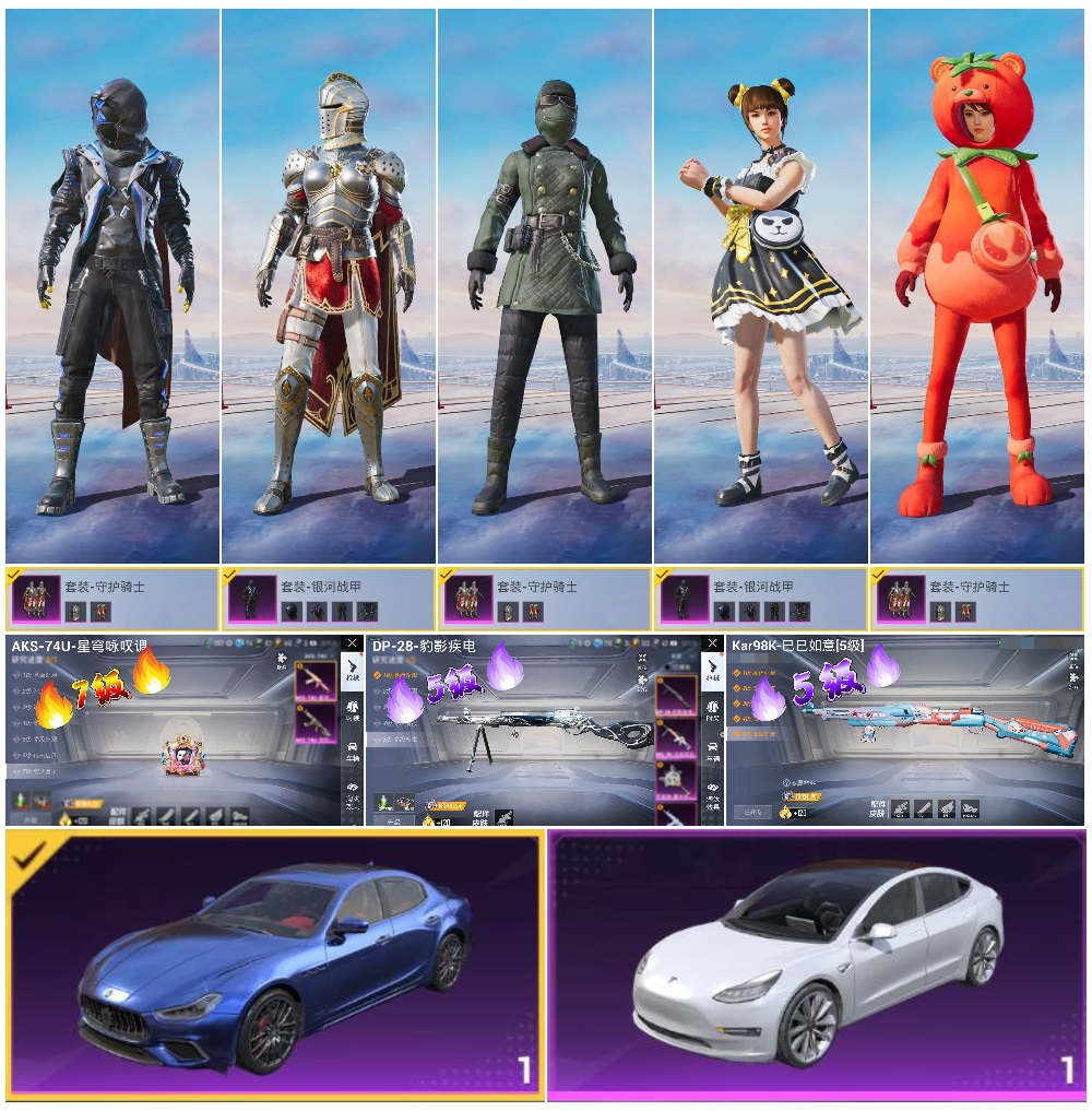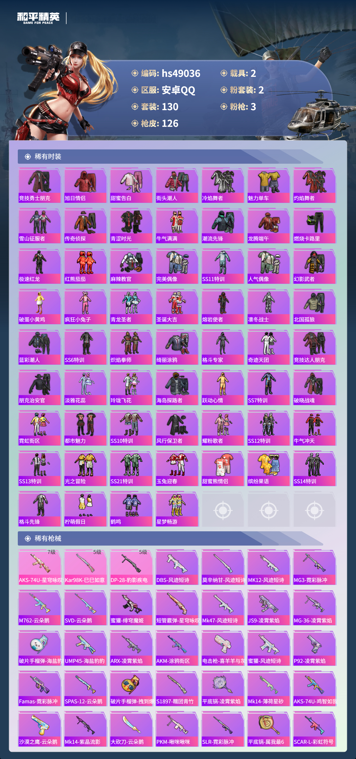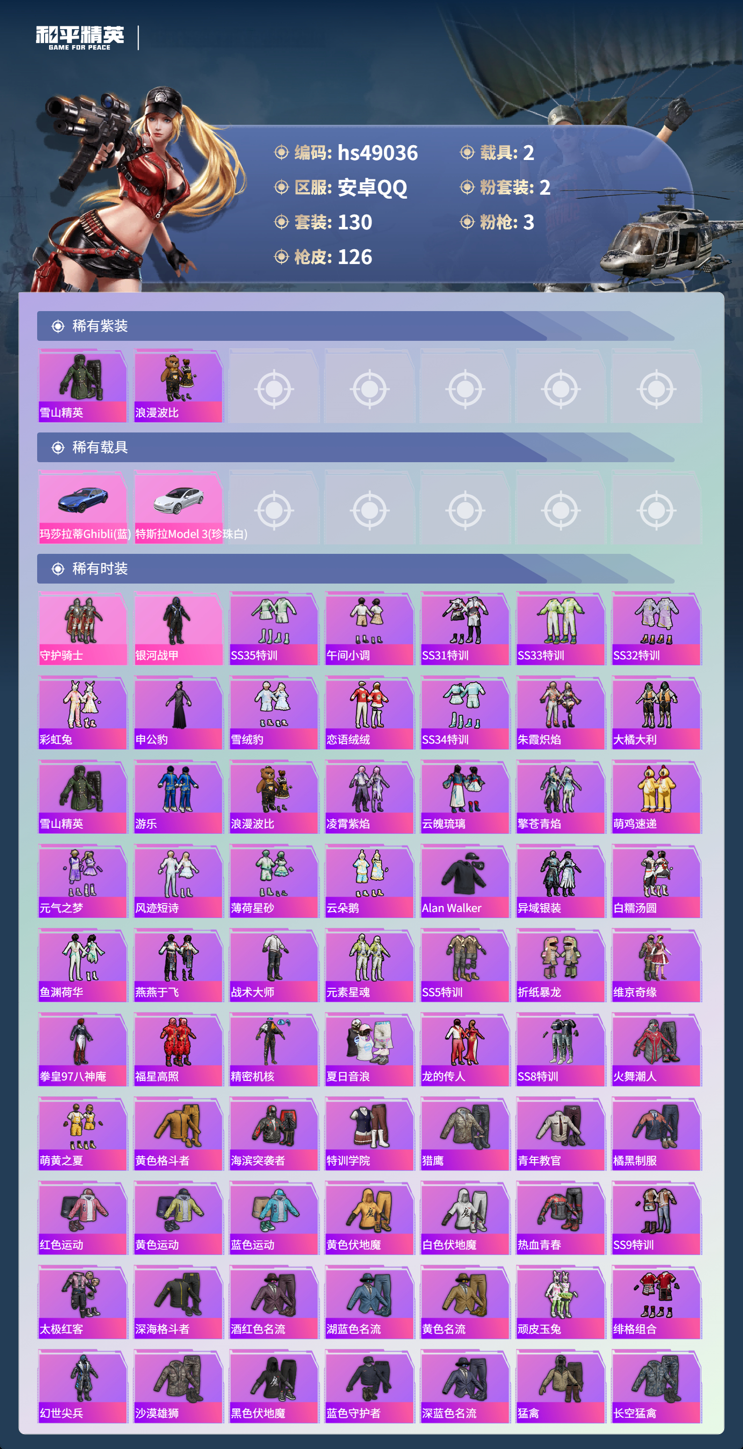 hs49036 安卓手q-4王牌印记-2粉装-3特效呛-2载具-41845热力值-130套装-126呛皮-1卓越印记-1传奇印记【2粉装】套装-银河战甲套装-守护骑士【3特效呛】kar98k-巳巳如意/5级aks-74u-星穹咏叹调/7级dp-28-豹影疾电/5级【2稀有紫装】雪山精英浪漫波比【2稀有载具】玛莎拉蒂ghibli蓝特斯拉model 3珍珠白【130稀有时装