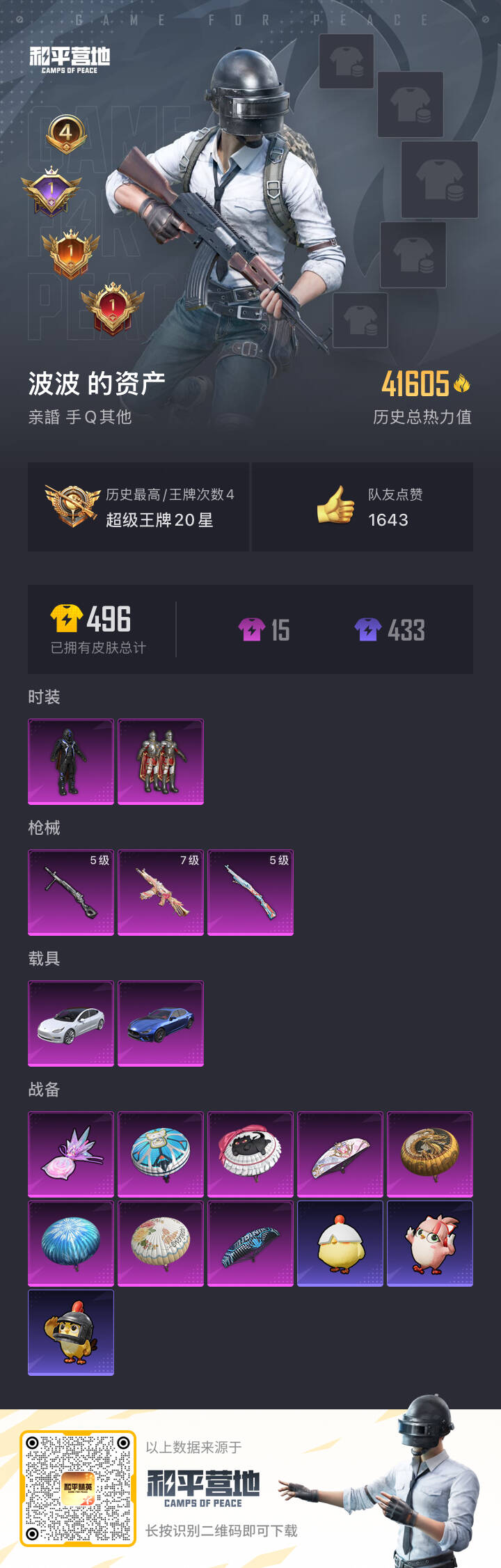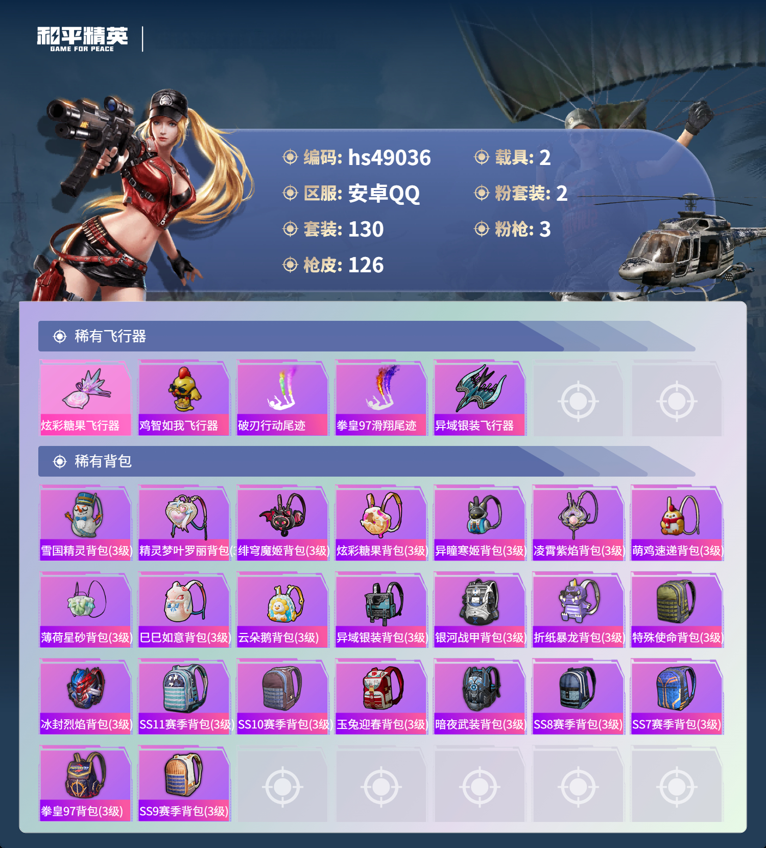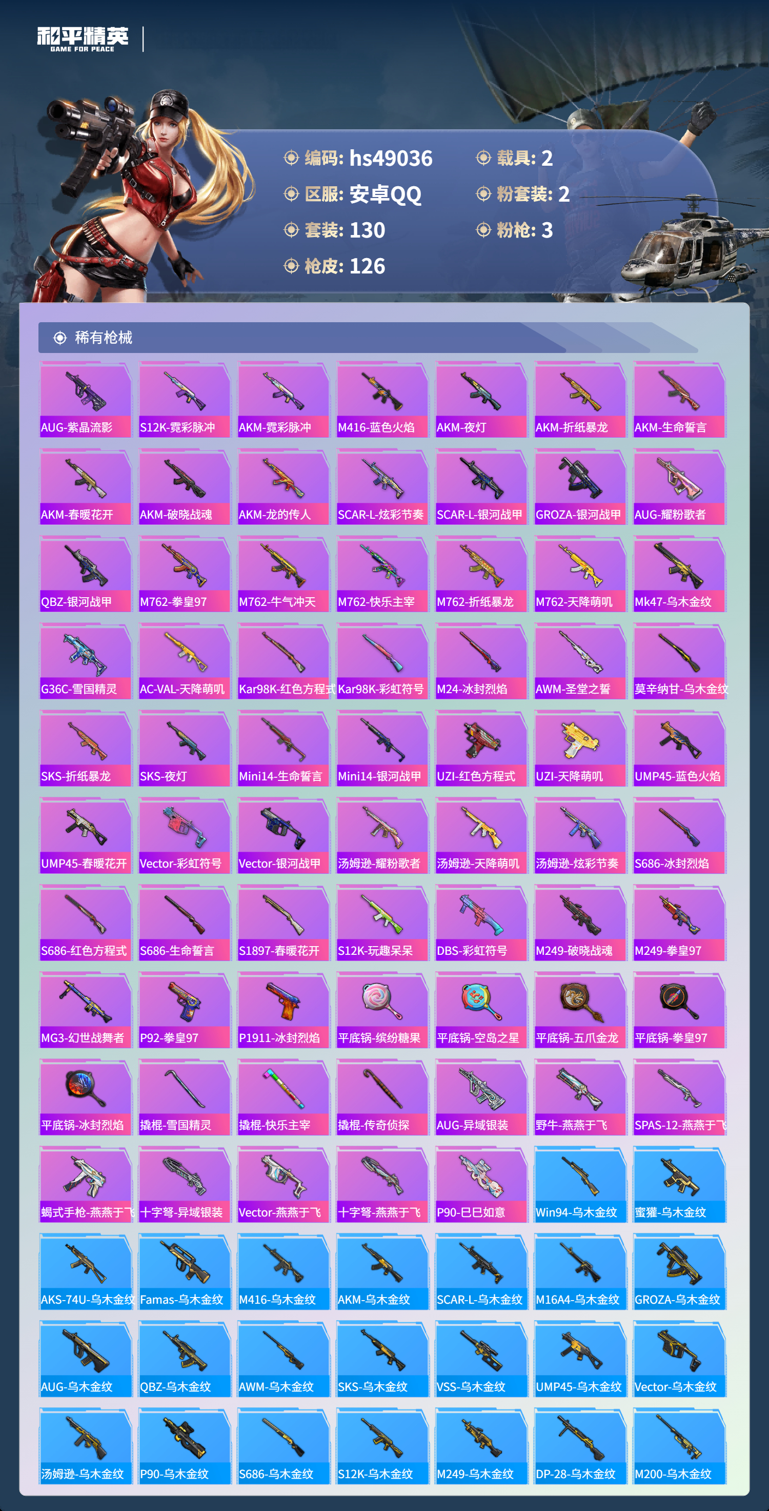 hs49036 安卓手q-4王牌印记-2粉装-3特效呛-2载具-41845热力值-130套装-126呛皮-1卓越印记-1传奇印记【2粉装】套装-银河战甲套装-守护骑士【3特效呛】kar98k-巳巳如意/5级aks-74u-星穹咏叹调/7级dp-28-豹影疾电/5级【2稀有紫装】雪山精英浪漫波比【2稀有载具】玛莎拉蒂ghibli蓝特斯拉model 3珍珠白【130稀有时装