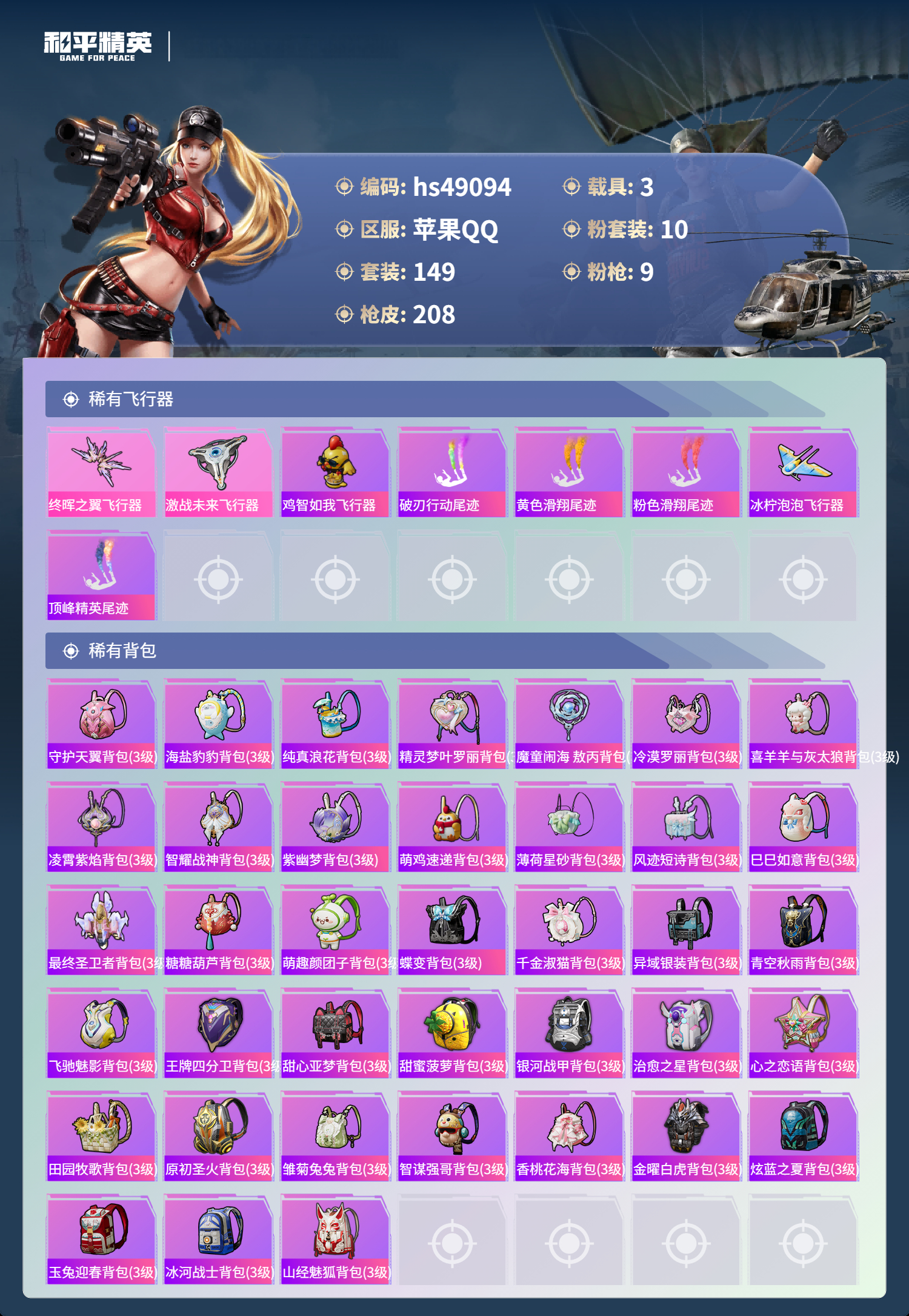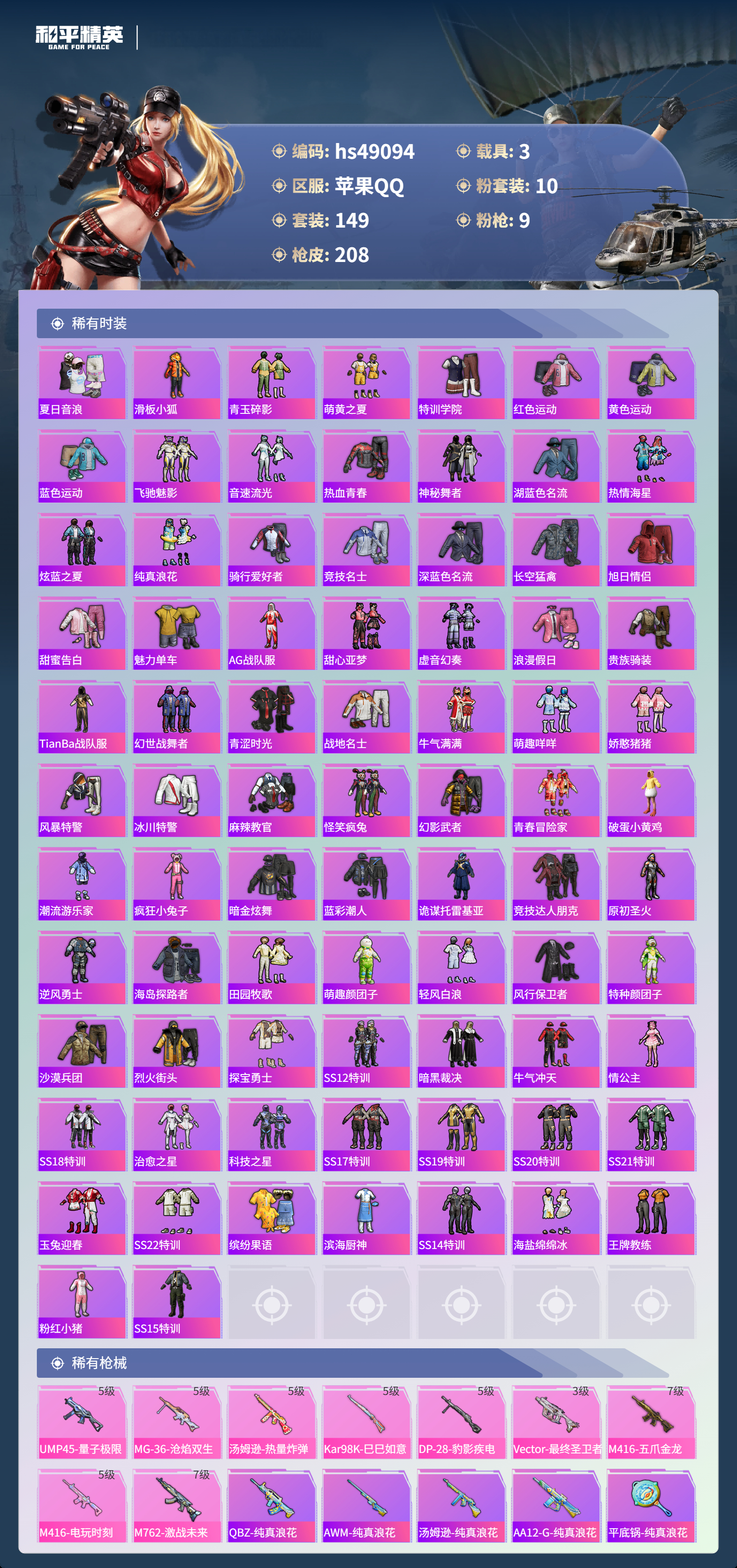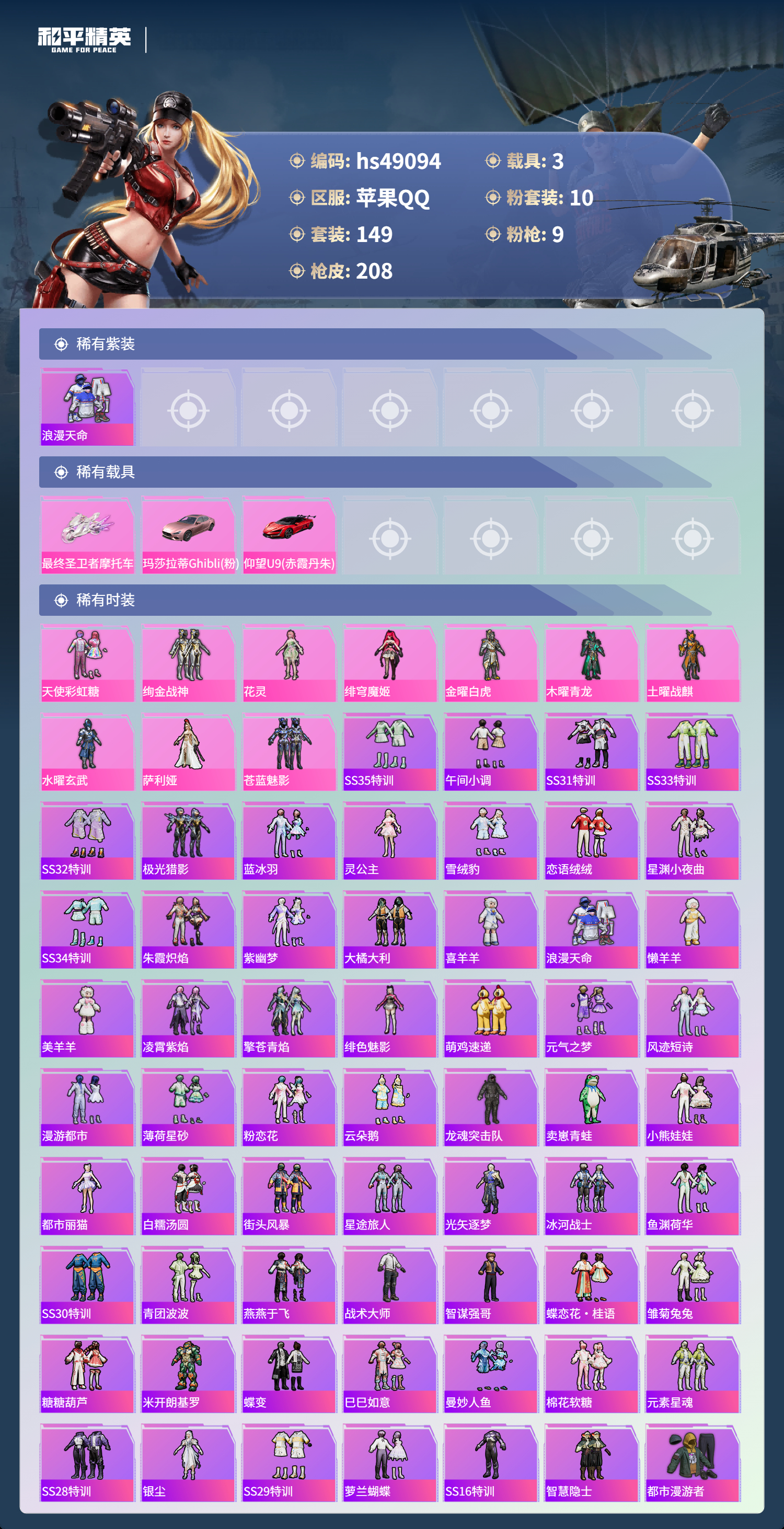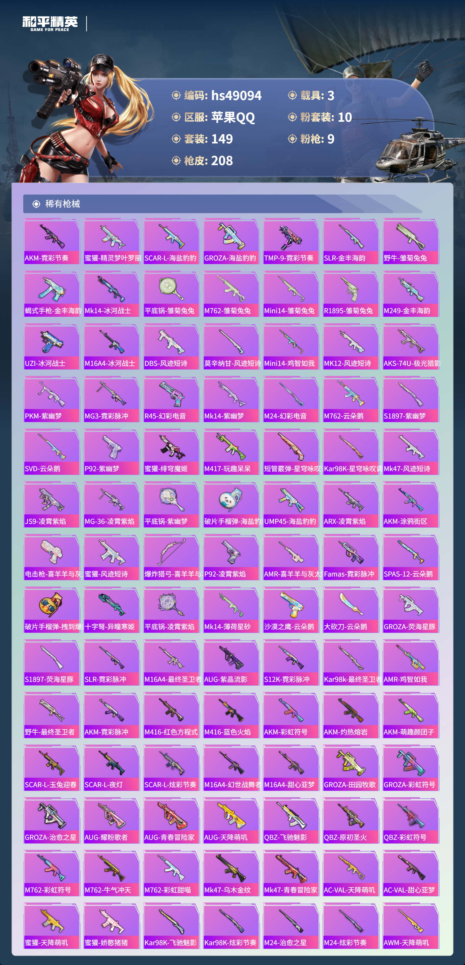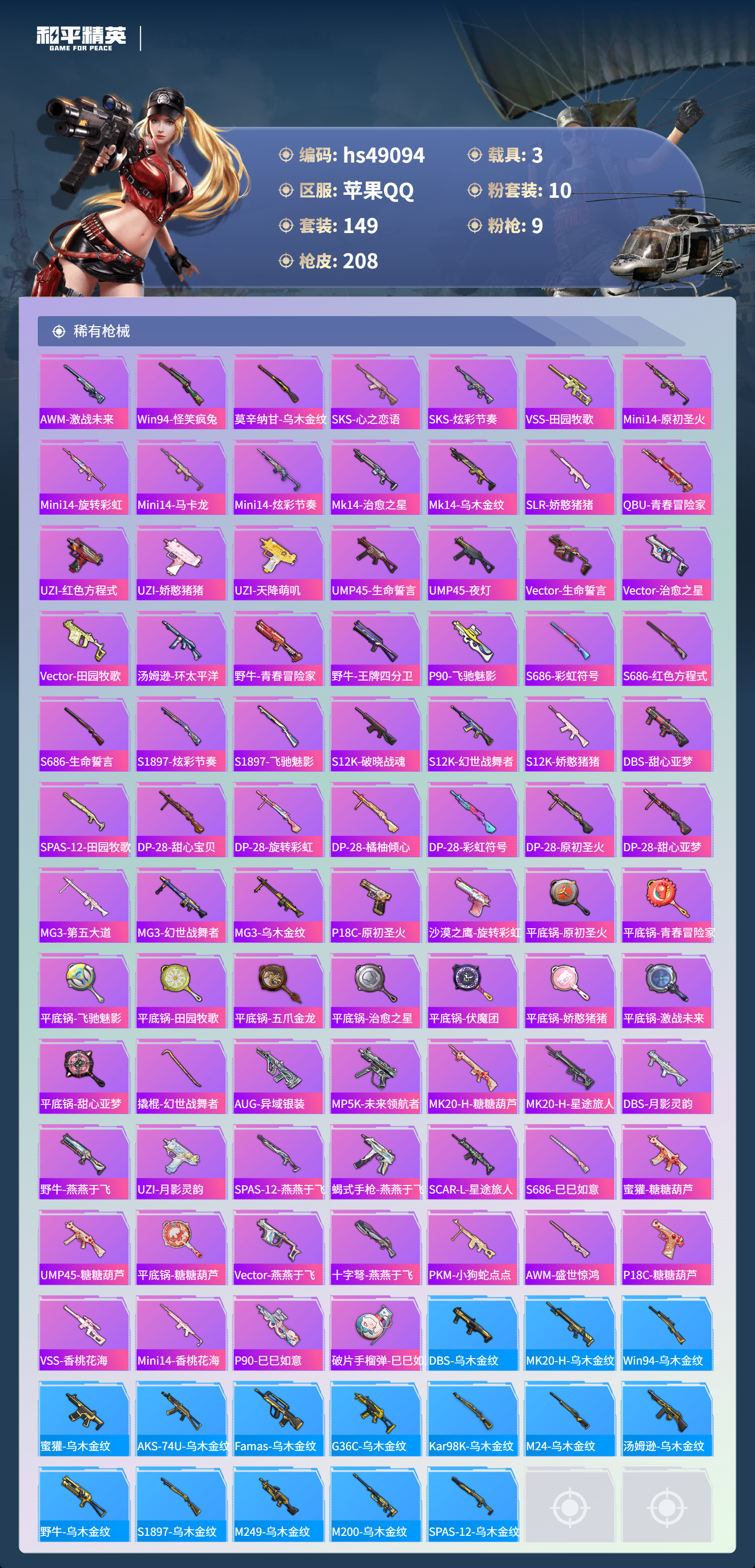 hs49094 苹果手q-6王牌印记-10粉装-9特效呛-3载具-72943热力值-149套装-208呛皮-2卓越印记【10粉装】角色-花灵角色-萨利娅角色-绯穹魔姬套装-木曜青龙套装-苍蓝魅影套装-金曜白虎套装-天使彩虹糖套装-土曜战麒套装-绚金战神套装-水曜玄武【9特效呛】mg-36-沧焰双生/5级vect-最终圣卫者/3级ump45-量子极限/5级dp-28-
