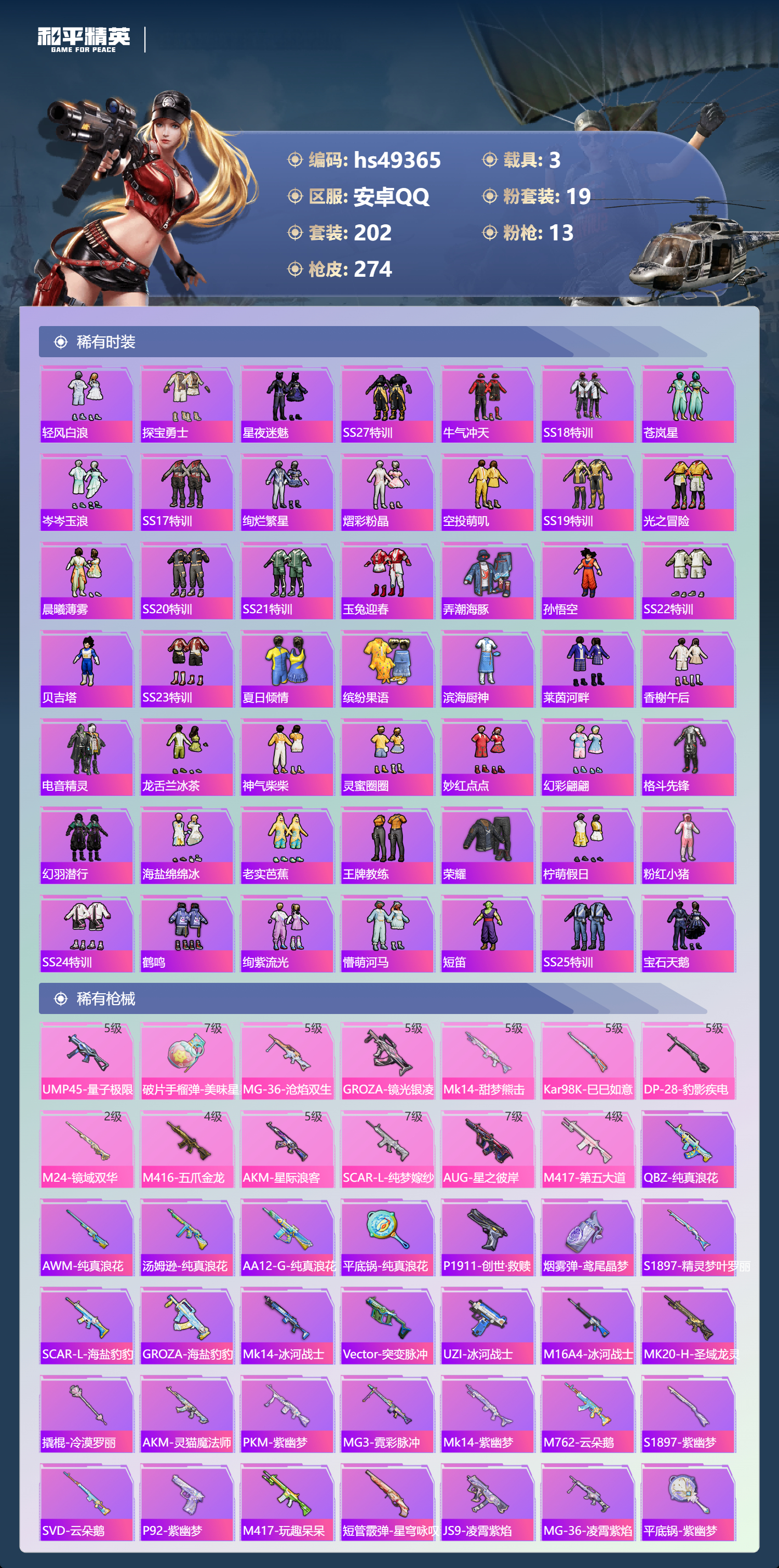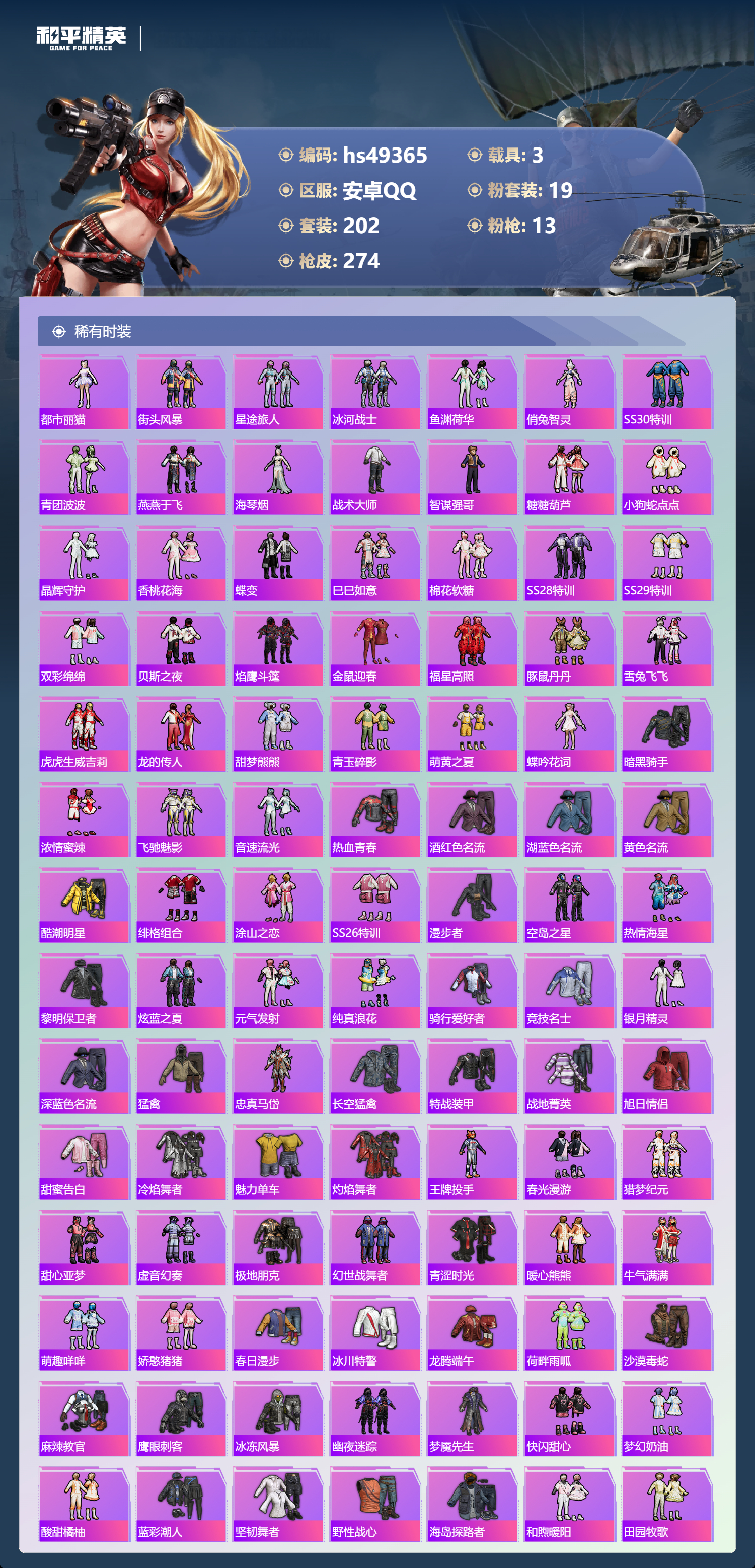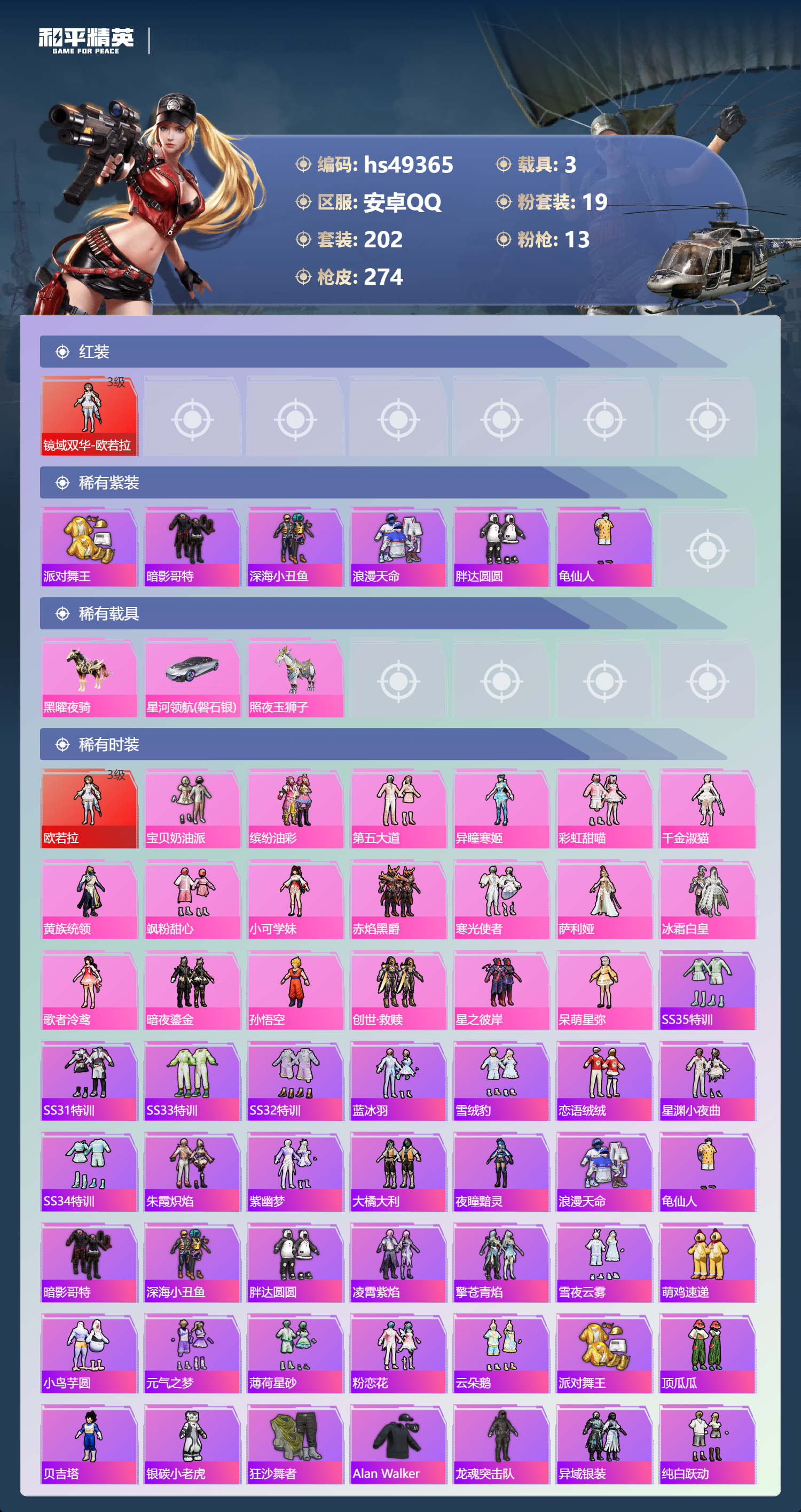 hs49365 安卓手q-16王牌印记-有战神框-1红装-19粉装-13特效呛-3载具-热力值-202套装-274呛皮-5卓越印记-2传奇印记【1红装】镜域双华-欧若拉/3级【19粉装】角色-萨利娅超级赛亚人-孙悟空套装-赤焰黑爵套装-彩虹甜喵角色-小可学妹套装-黄族统领套装-暗夜鎏金角色-呆萌星弥套装-创世·救赎角色-异瞳寒姬套装-星之彼岸套装-缤纷油彩套