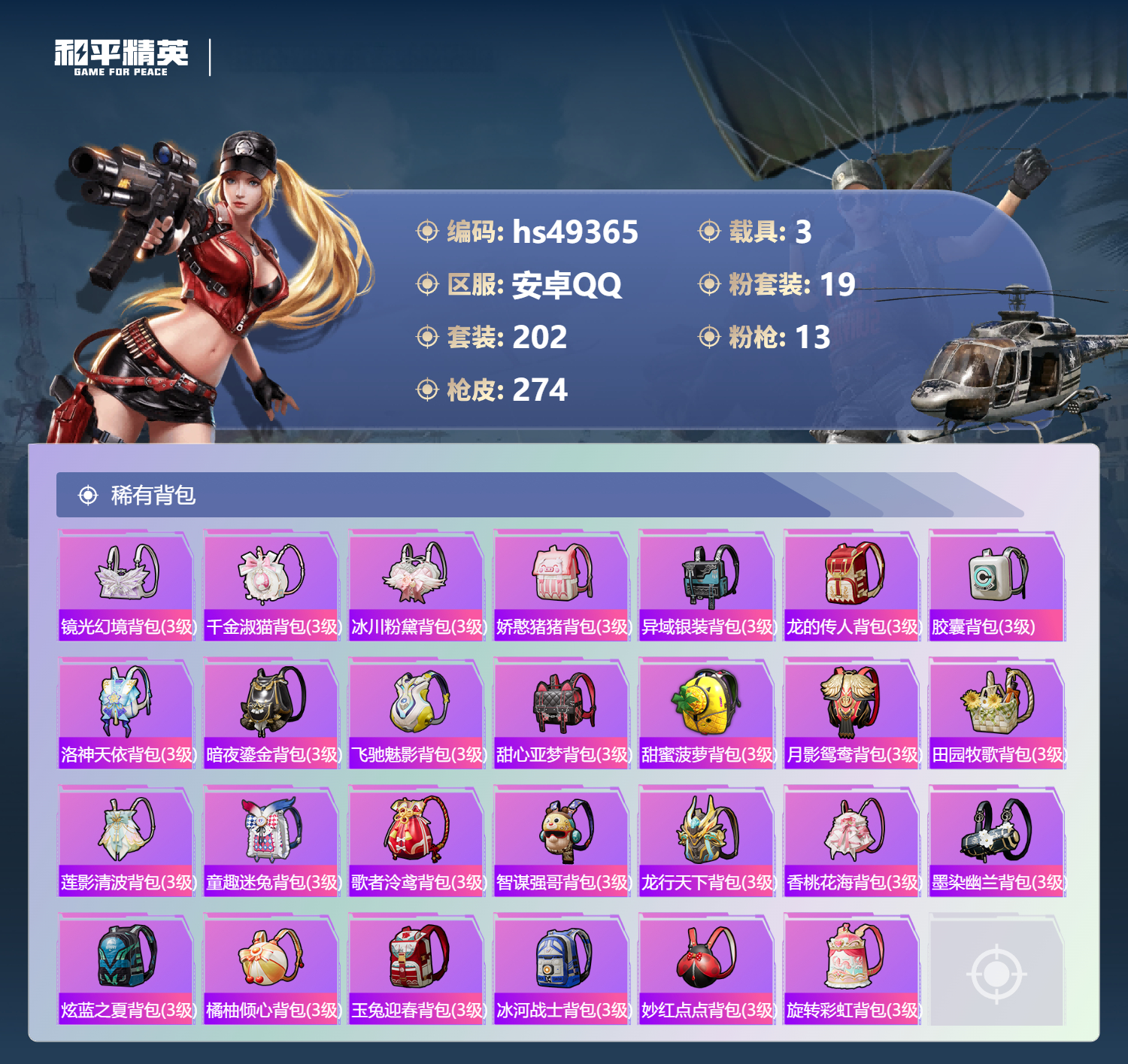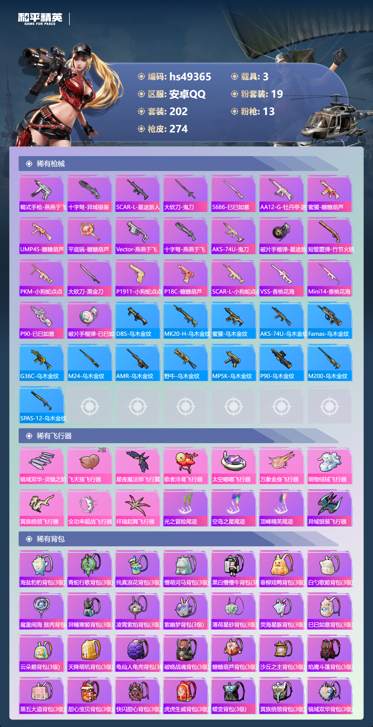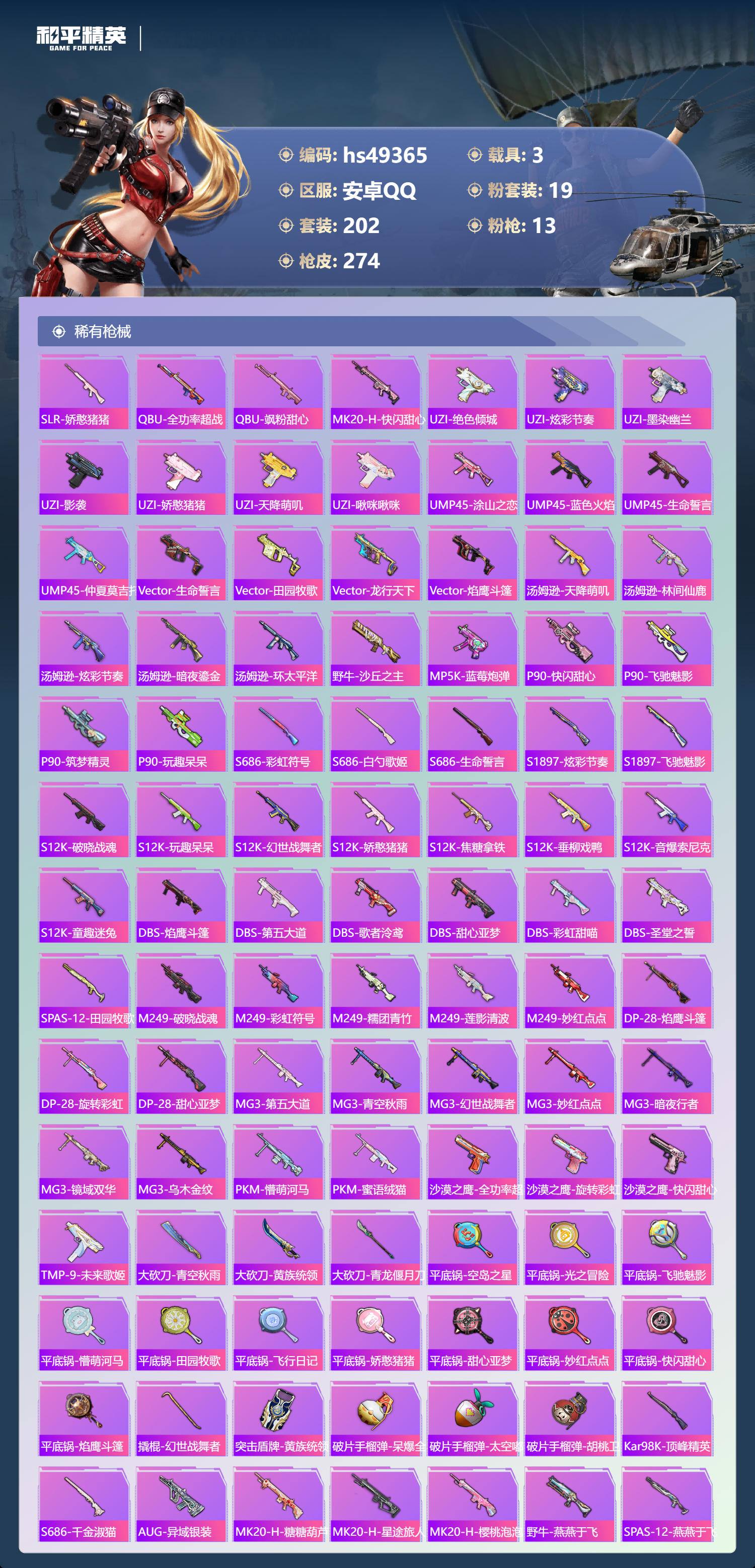 hs49365 安卓手q-16王牌印记-有战神框-1红装-19粉装-13特效呛-3载具-热力值-202套装-274呛皮-5卓越印记-2传奇印记【1红装】镜域双华-欧若拉/3级【19粉装】角色-萨利娅超级赛亚人-孙悟空套装-赤焰黑爵套装-彩虹甜喵角色-小可学妹套装-黄族统领套装-暗夜鎏金角色-呆萌星弥套装-创世·救赎角色-异瞳寒姬套装-星之彼岸套装-缤纷油彩套