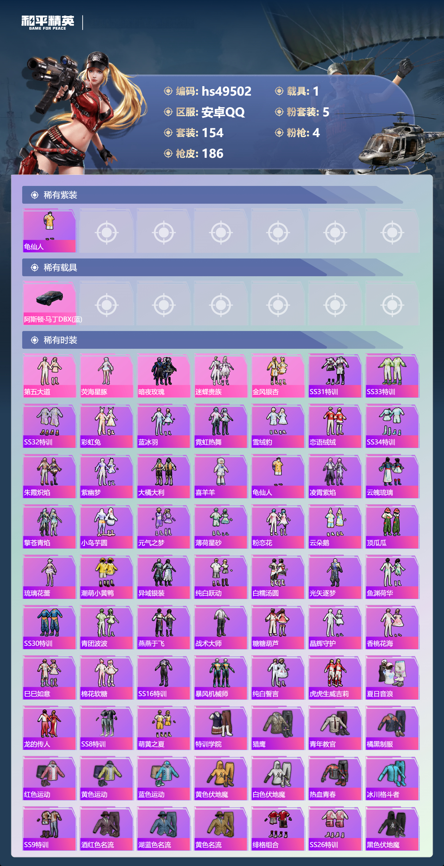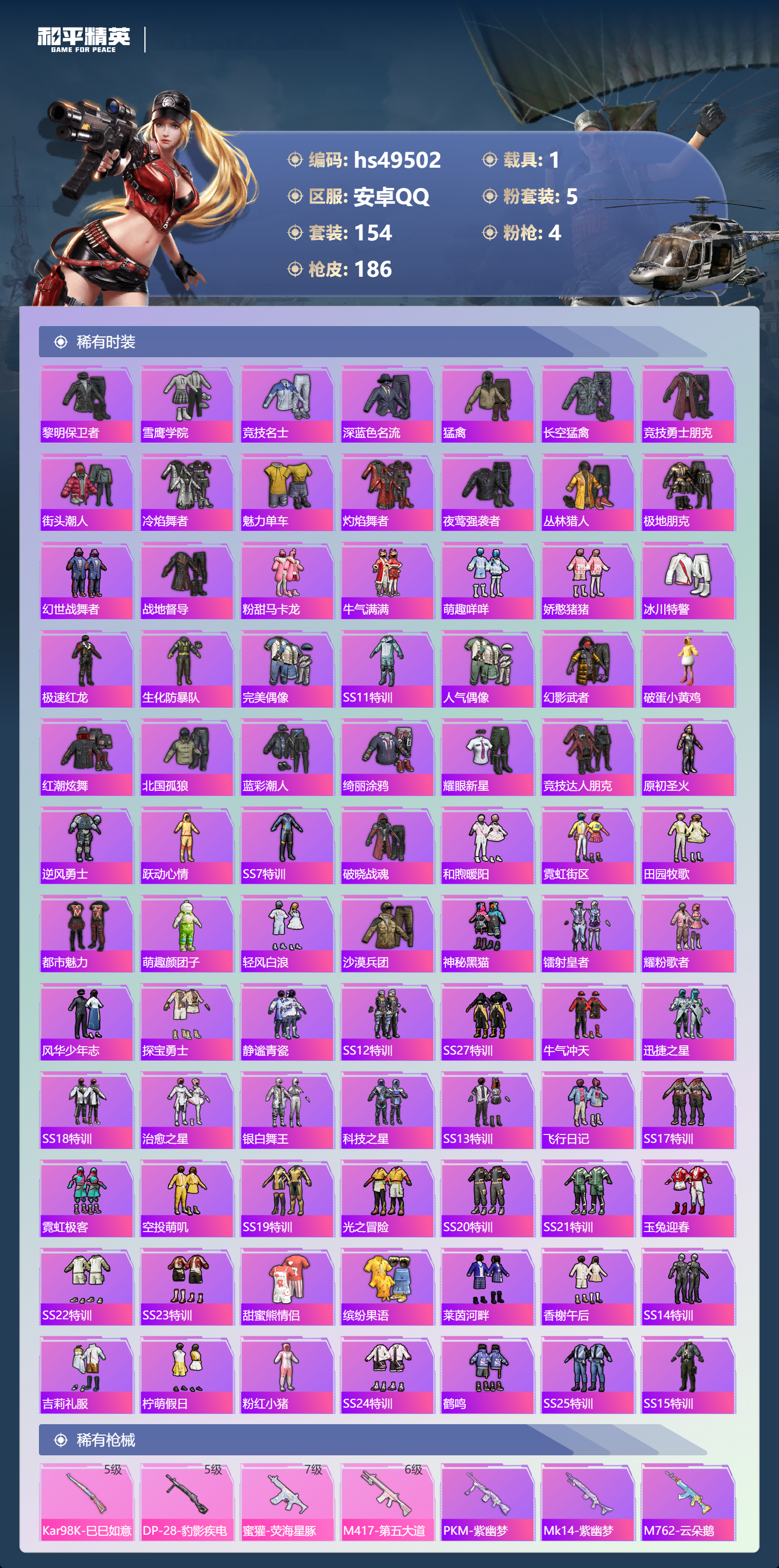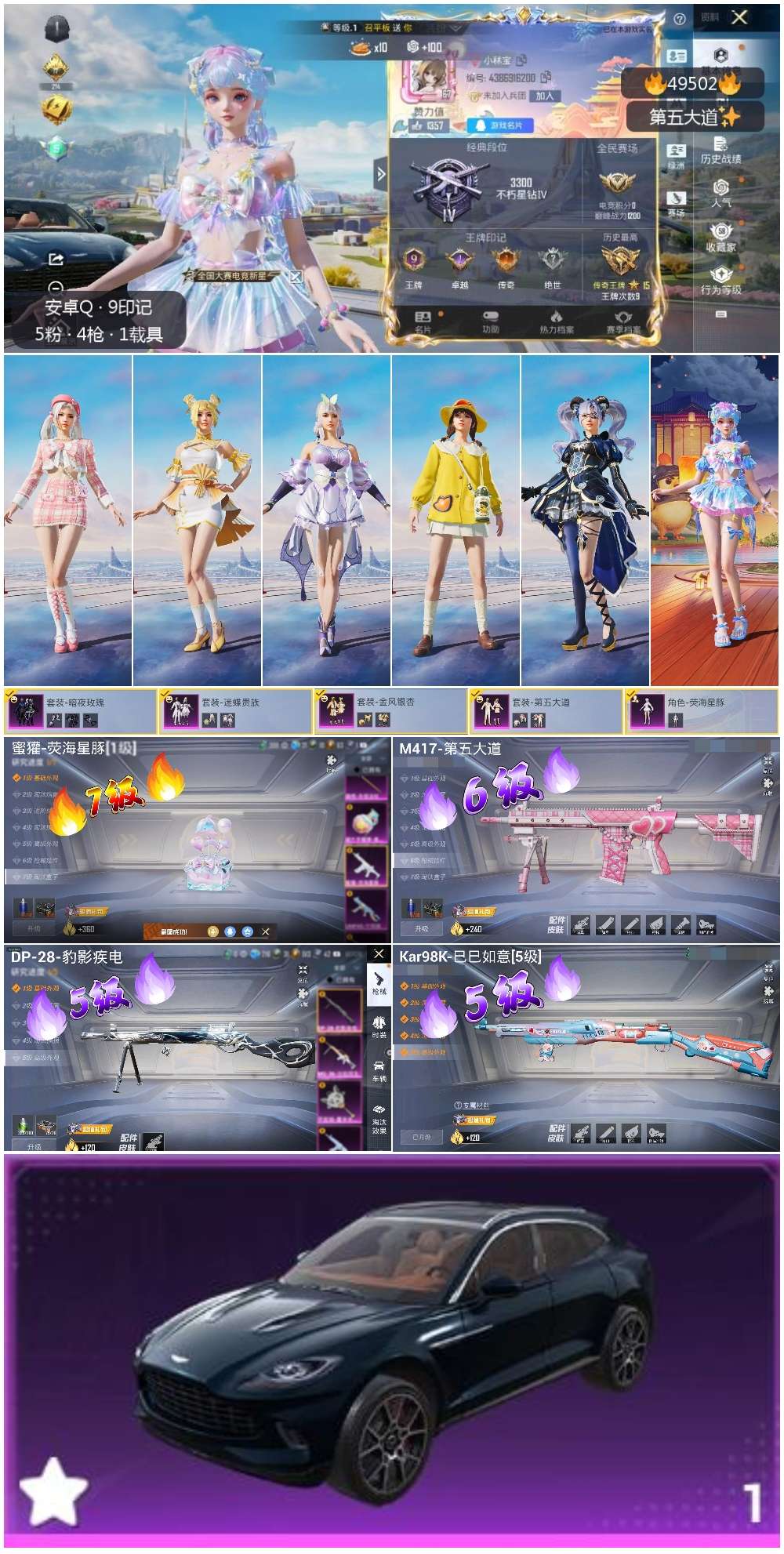 hs49502 安卓手q-9王牌印记-5粉装-4特效呛-1载具-59823热力值-154套装-186呛皮-1卓越印记-1传奇印记【5粉装】套装-迷蝶贵族角色-荧海星豚套装-金风银杏套装-第五大道套装-暗夜玫瑰【4特效呛】蜜獾-荧海星豚/7级kar98k-巳巳如意/5级m417-第五大道/6级dp-28-豹影疾电/5级【1稀有紫装】龟仙人【1稀有载具】阿斯顿·马丁dbx蓝