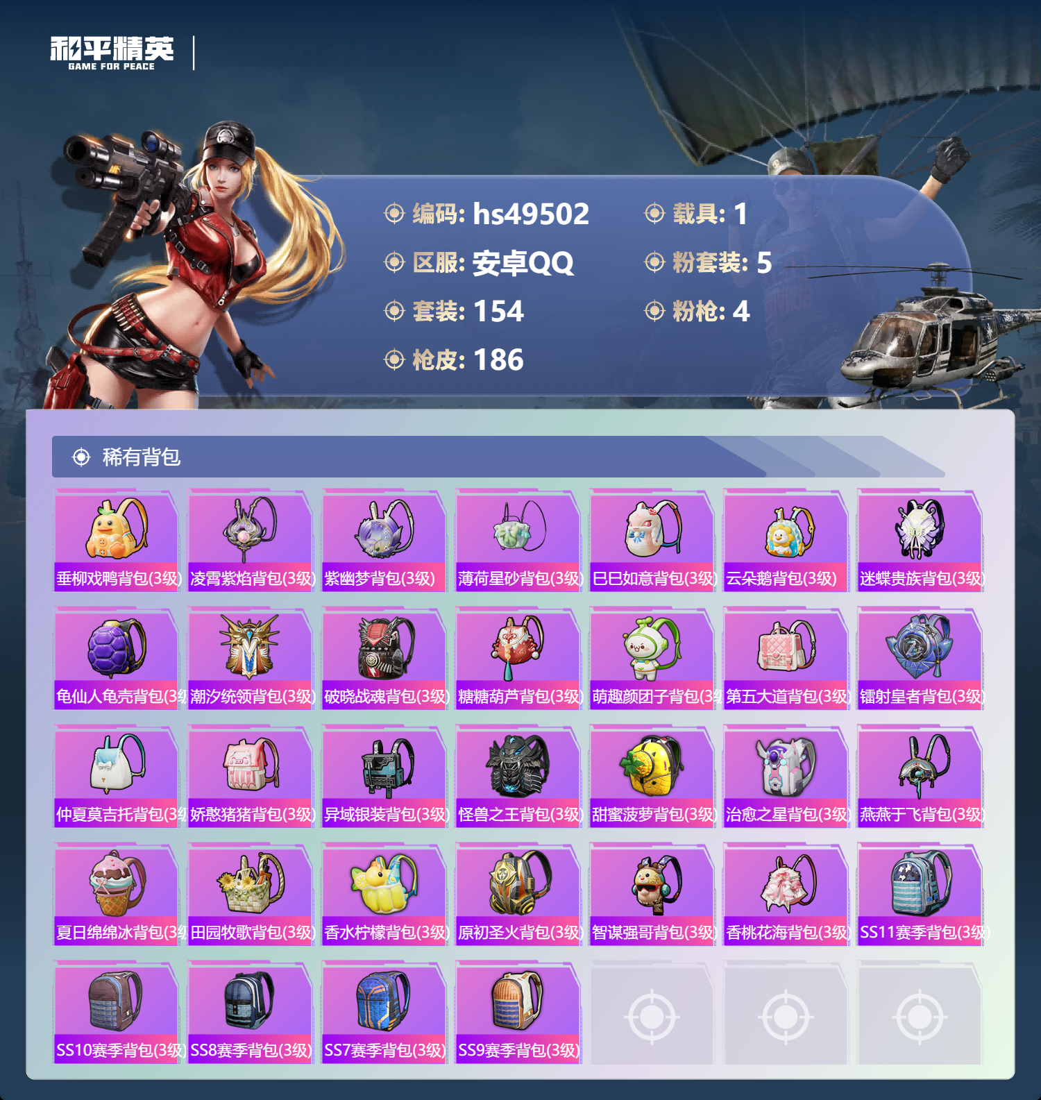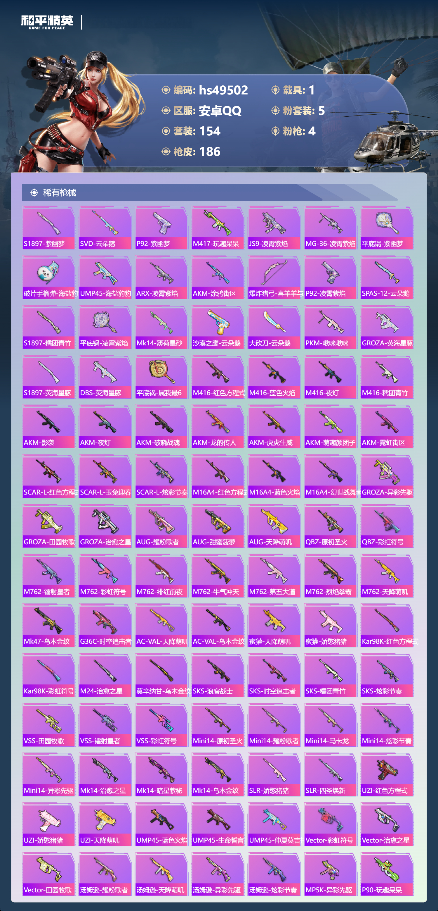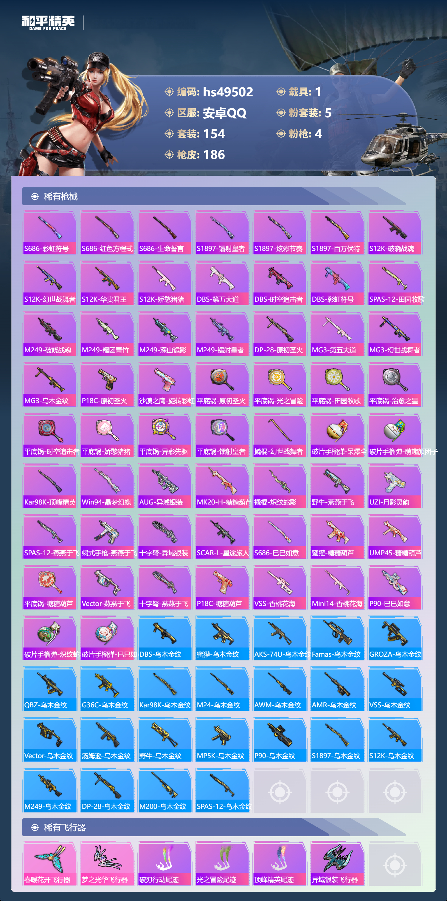 hs49502 安卓手q-9王牌印记-5粉装-4特效呛-1载具-59823热力值-154套装-186呛皮-1卓越印记-1传奇印记【5粉装】套装-迷蝶贵族角色-荧海星豚套装-金风银杏套装-第五大道套装-暗夜玫瑰【4特效呛】蜜獾-荧海星豚/7级kar98k-巳巳如意/5级m417-第五大道/6级dp-28-豹影疾电/5级【1稀有紫装】龟仙人【1稀有载具】阿斯顿·马丁dbx蓝