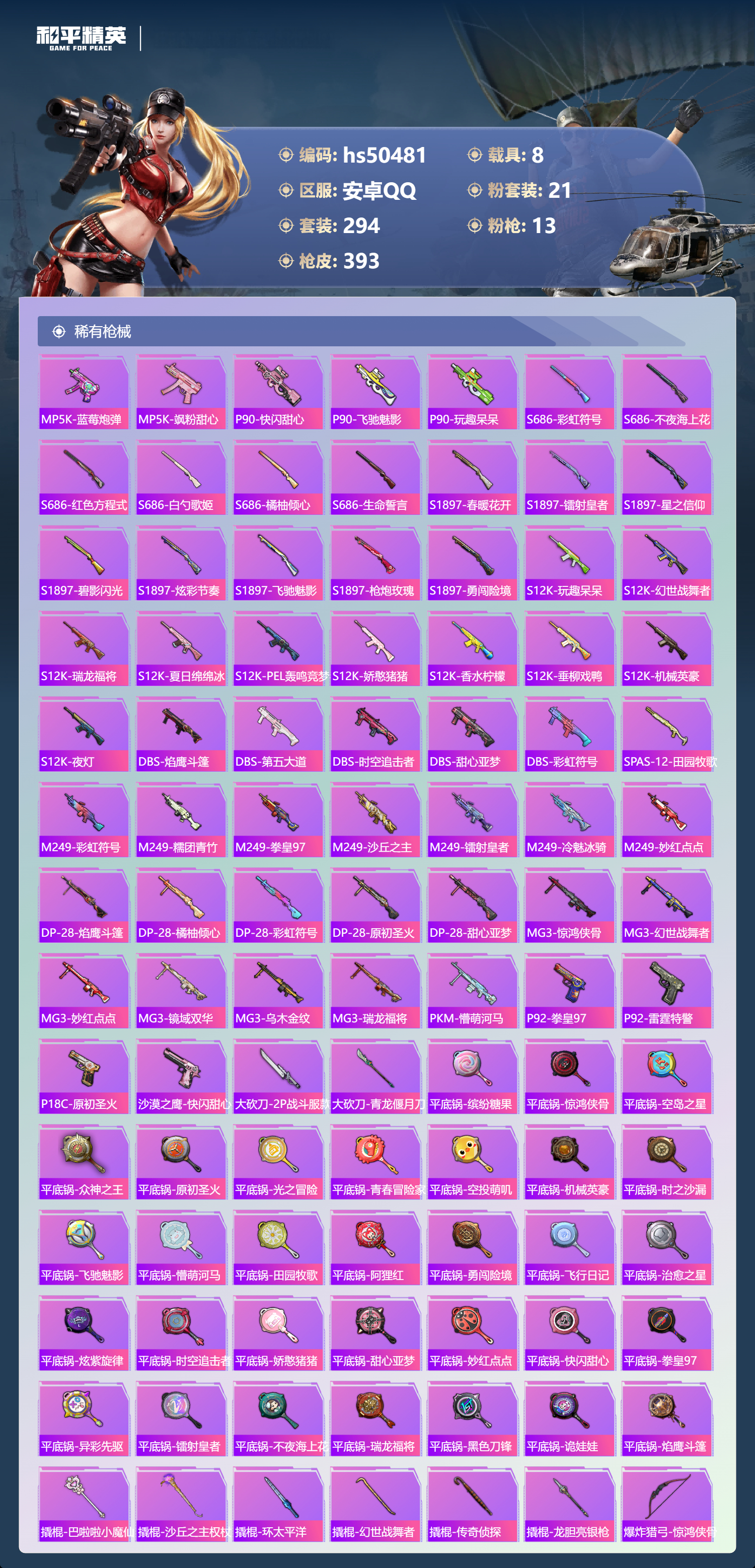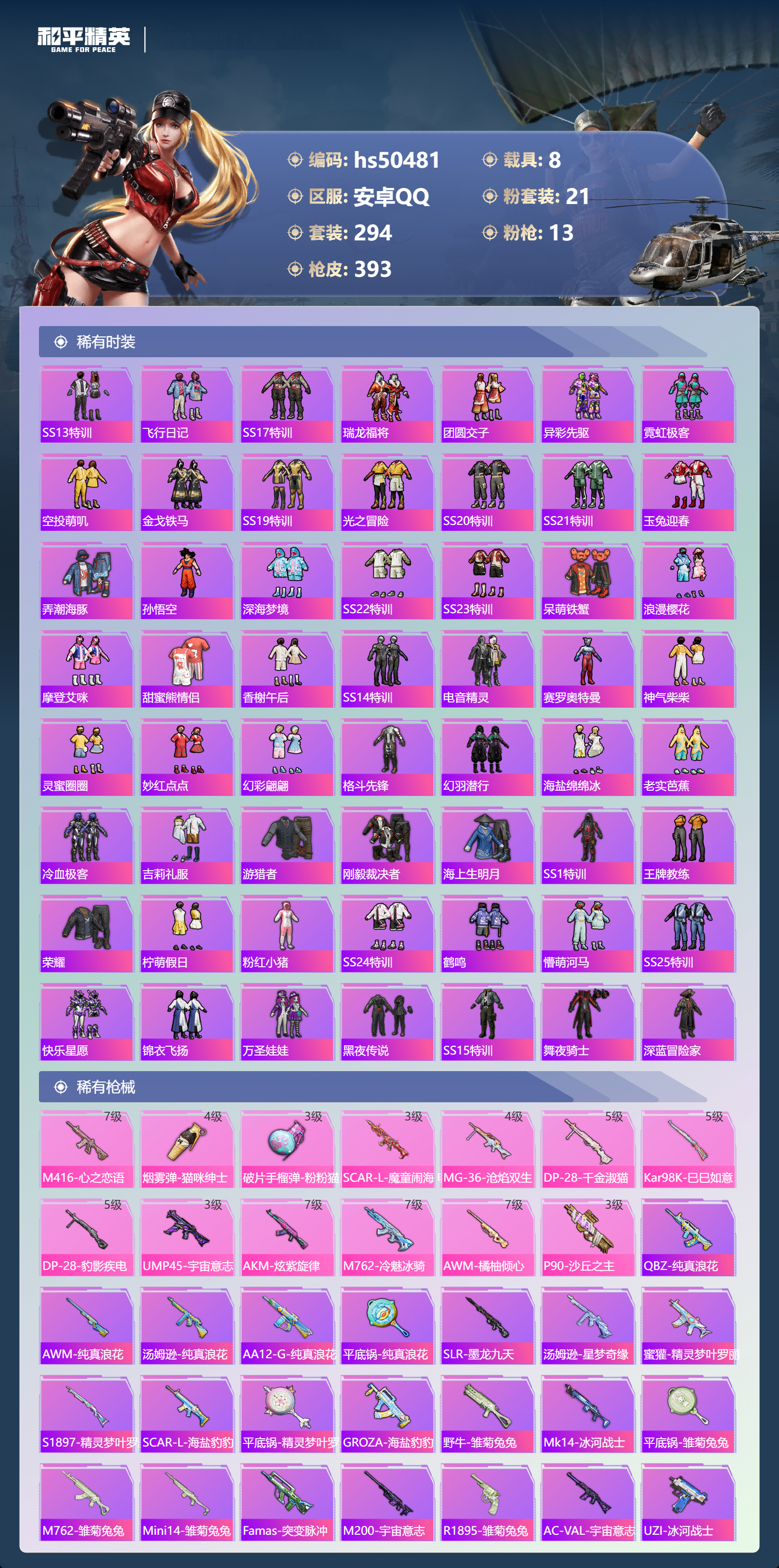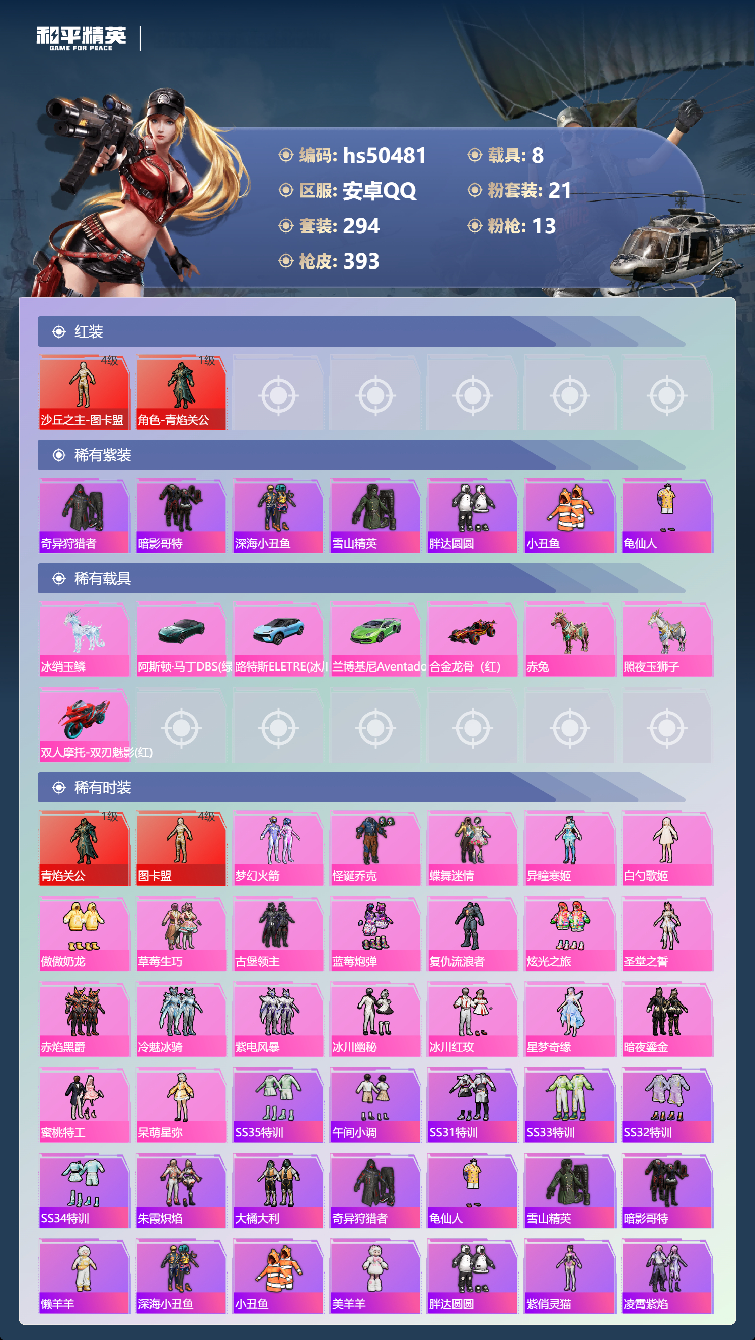 hs50481 安卓手q-17王牌印记-2红装-21粉装-13特效呛-8载具-热力值-294套装-393呛皮-5卓越印记-2传奇印记【2红装】角色-青焰关公/1级沙丘之主-图卡盟/4级【21粉装】套装-古堡领主套装-炫光之旅角色-复仇流浪者角色-星梦奇缘套装-草莓生巧角色-圣堂之誓套装-冰川幽秘角色-白勺歌姬套装-冰川红玫角色-异瞳寒姬套装-傲傲奶龙套装-梦