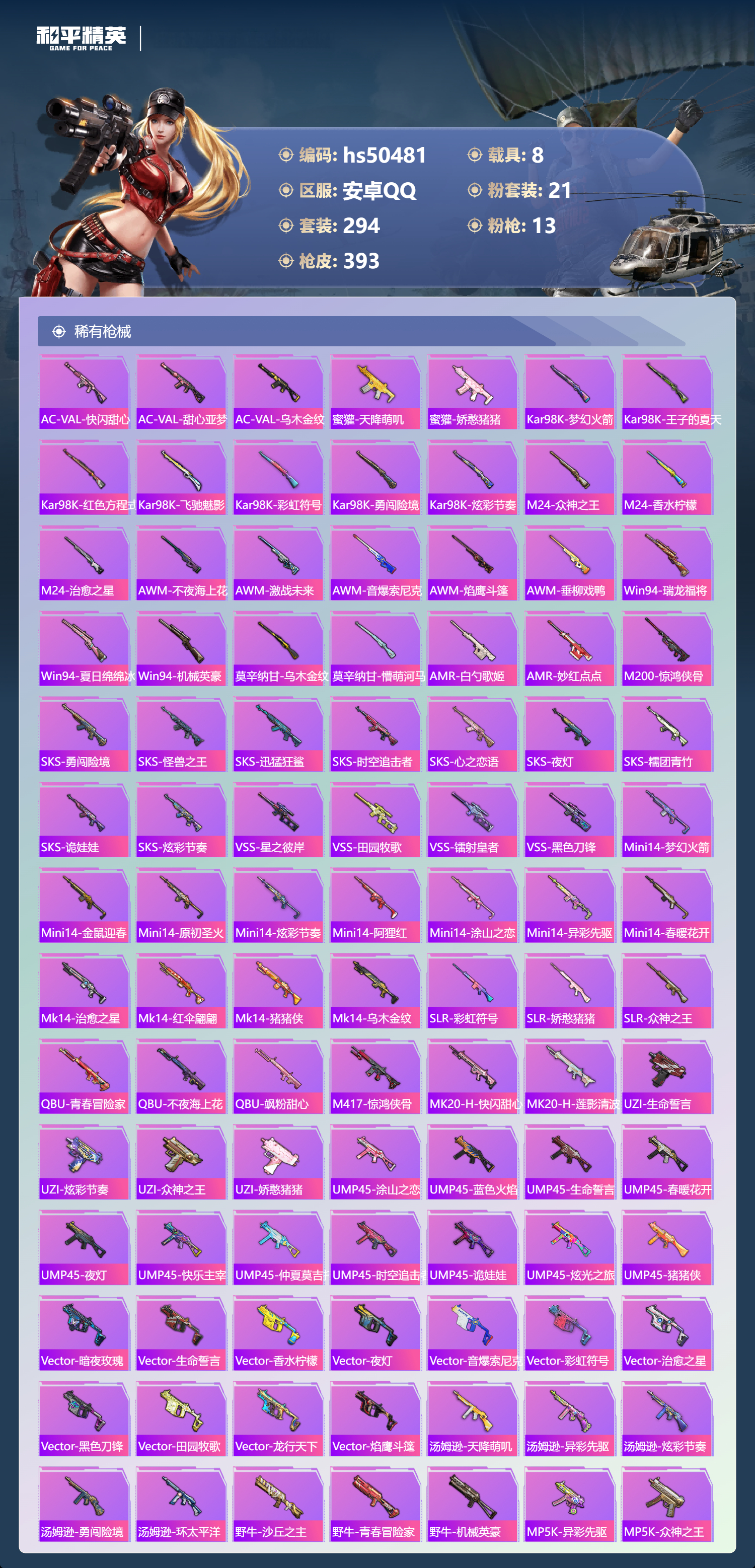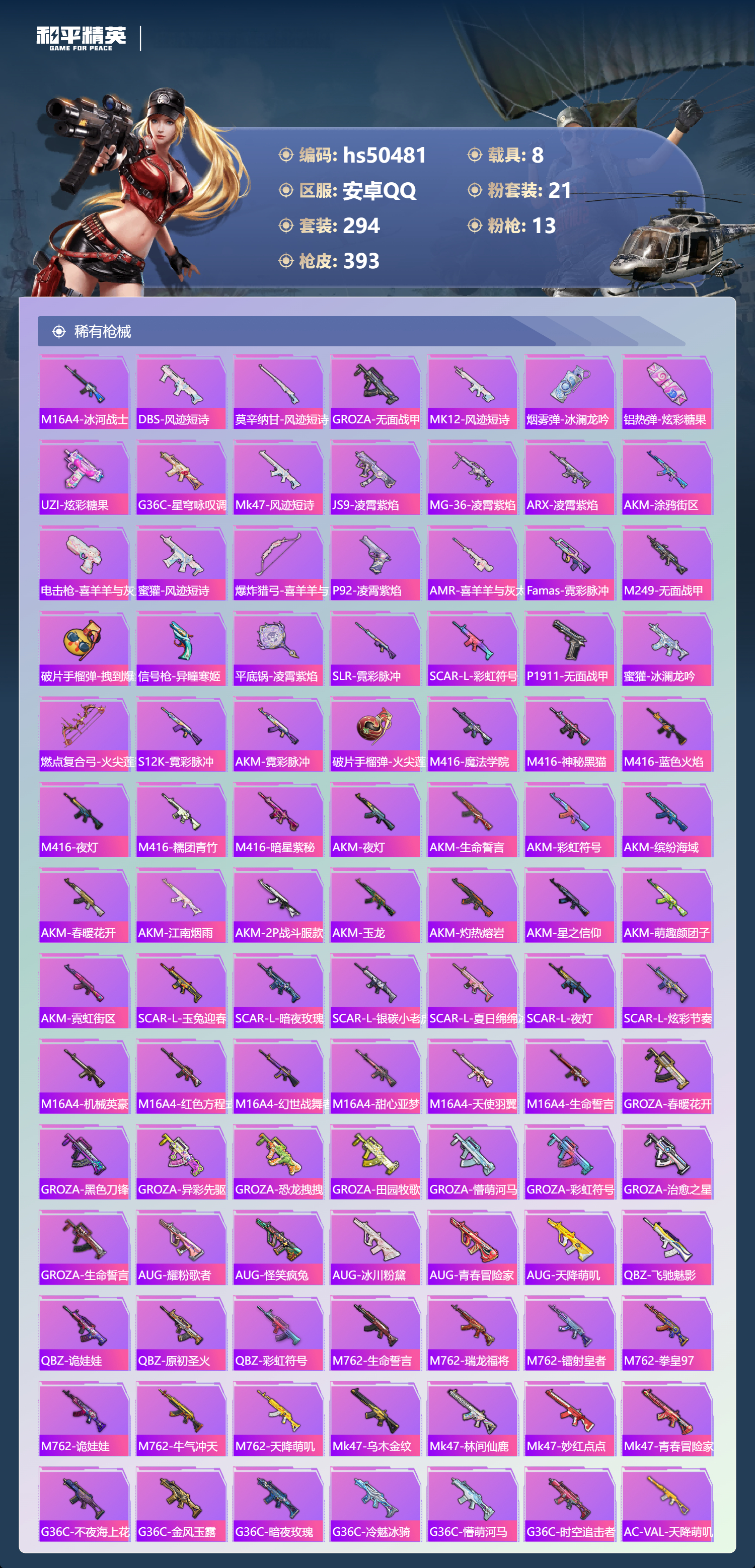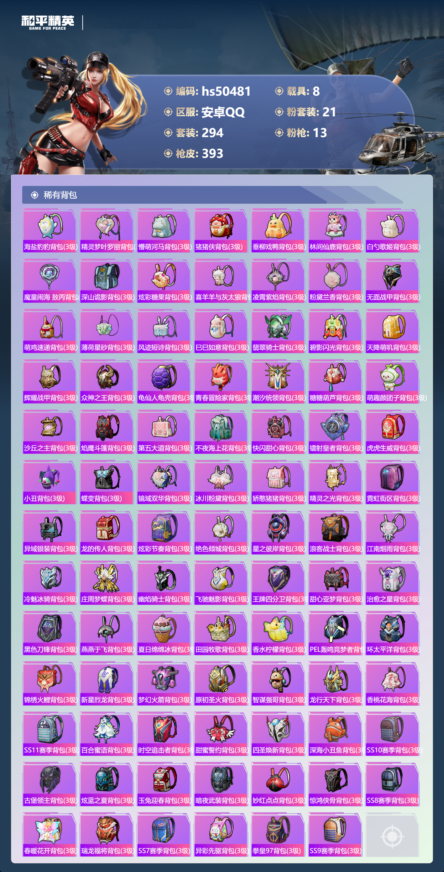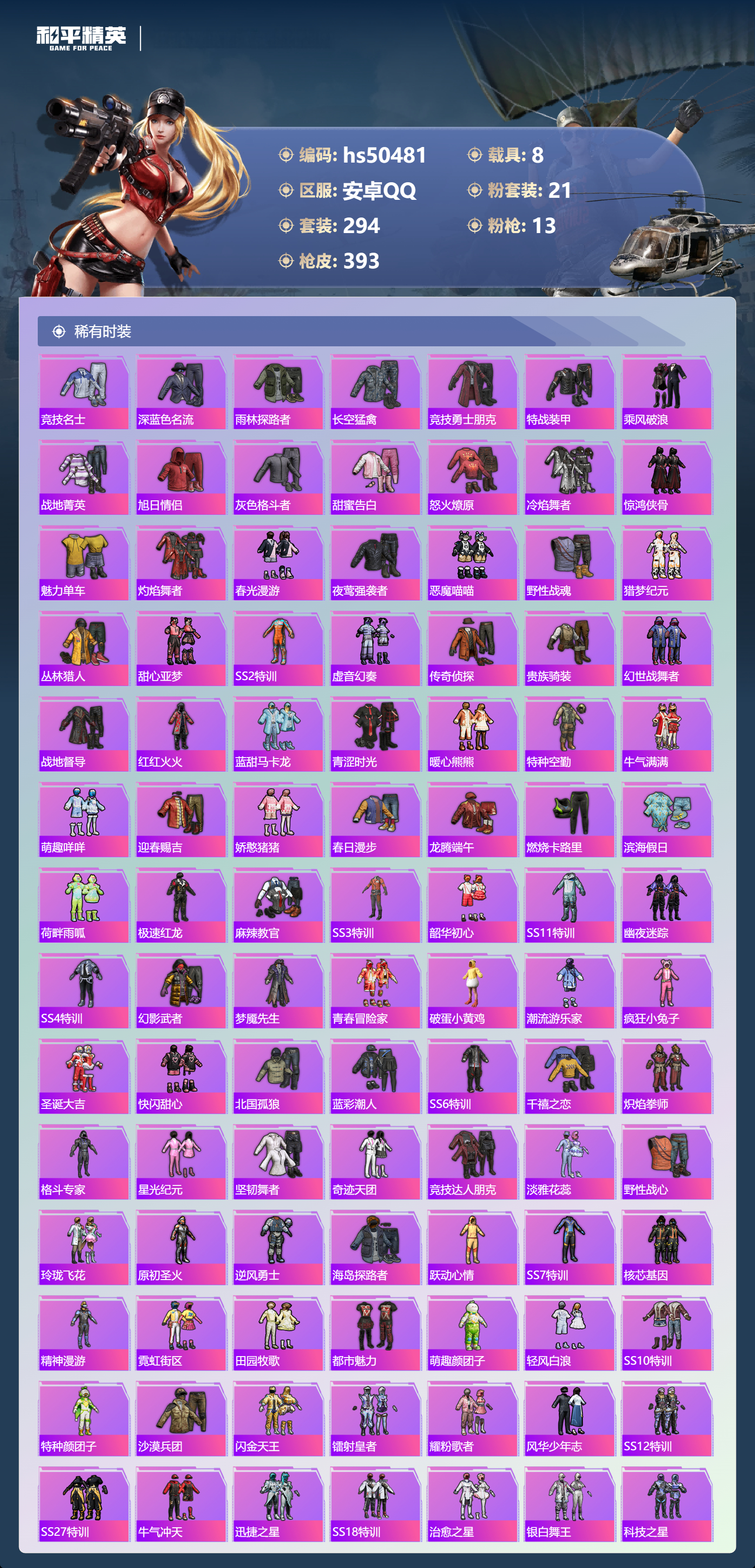 hs50481 安卓手q-17王牌印记-2红装-21粉装-13特效呛-8载具-热力值-294套装-393呛皮-5卓越印记-2传奇印记【2红装】角色-青焰关公/1级沙丘之主-图卡盟/4级【21粉装】套装-古堡领主套装-炫光之旅角色-复仇流浪者角色-星梦奇缘套装-草莓生巧角色-圣堂之誓套装-冰川幽秘角色-白勺歌姬套装-冰川红玫角色-异瞳寒姬套装-傲傲奶龙套装-梦