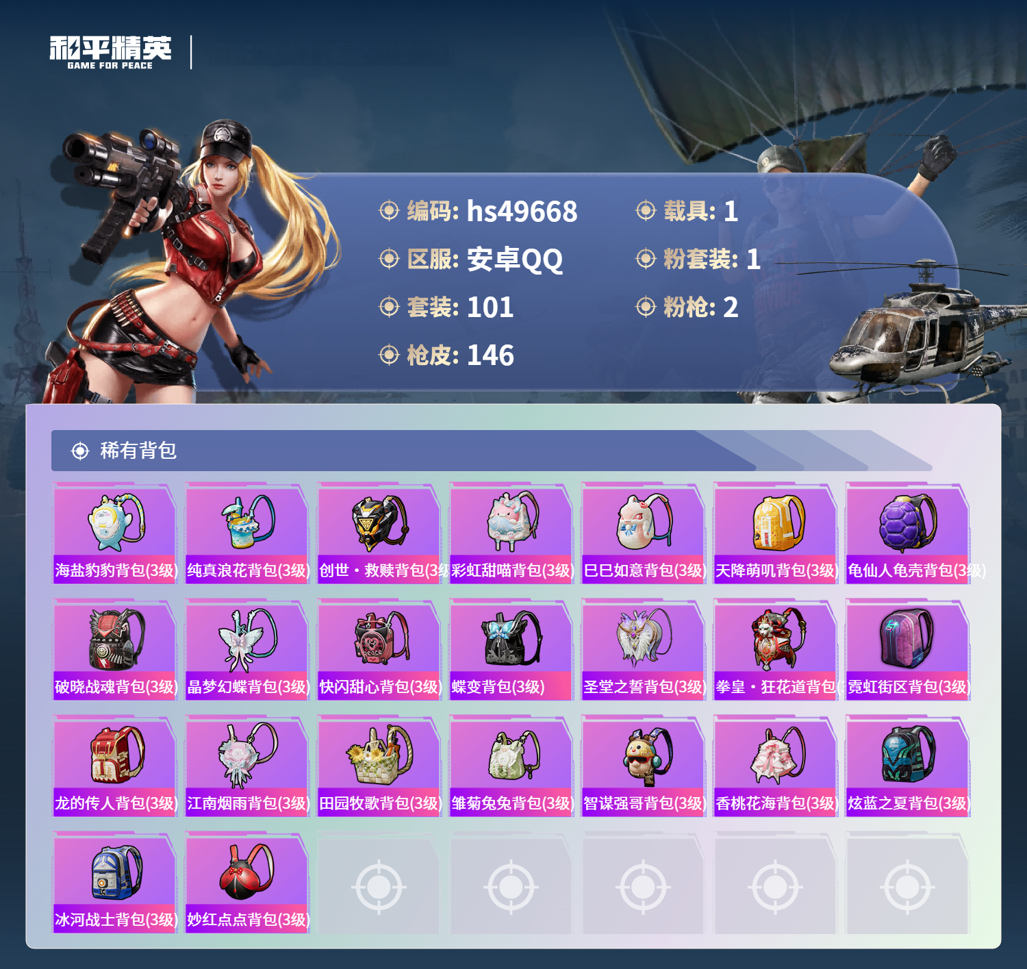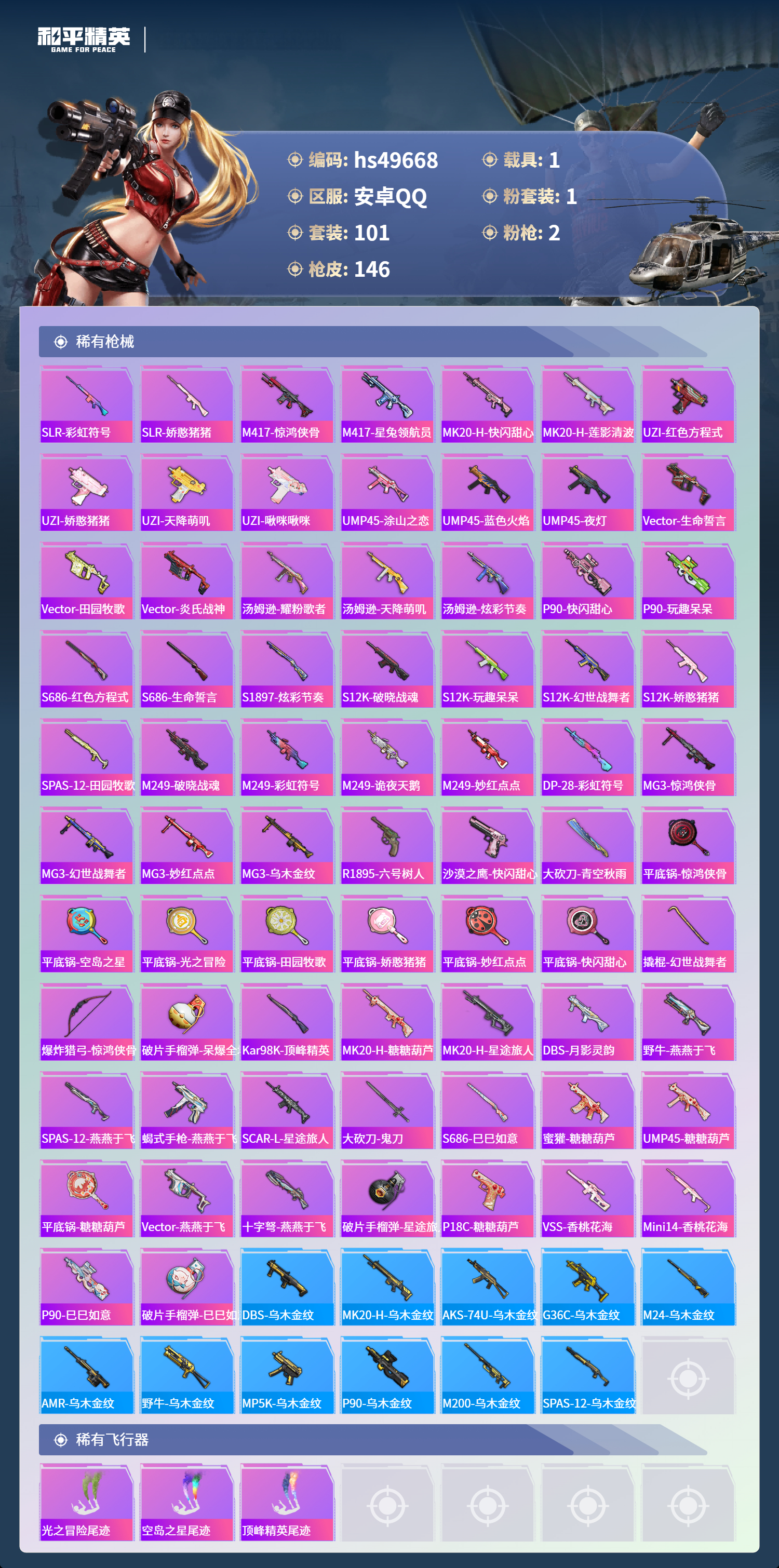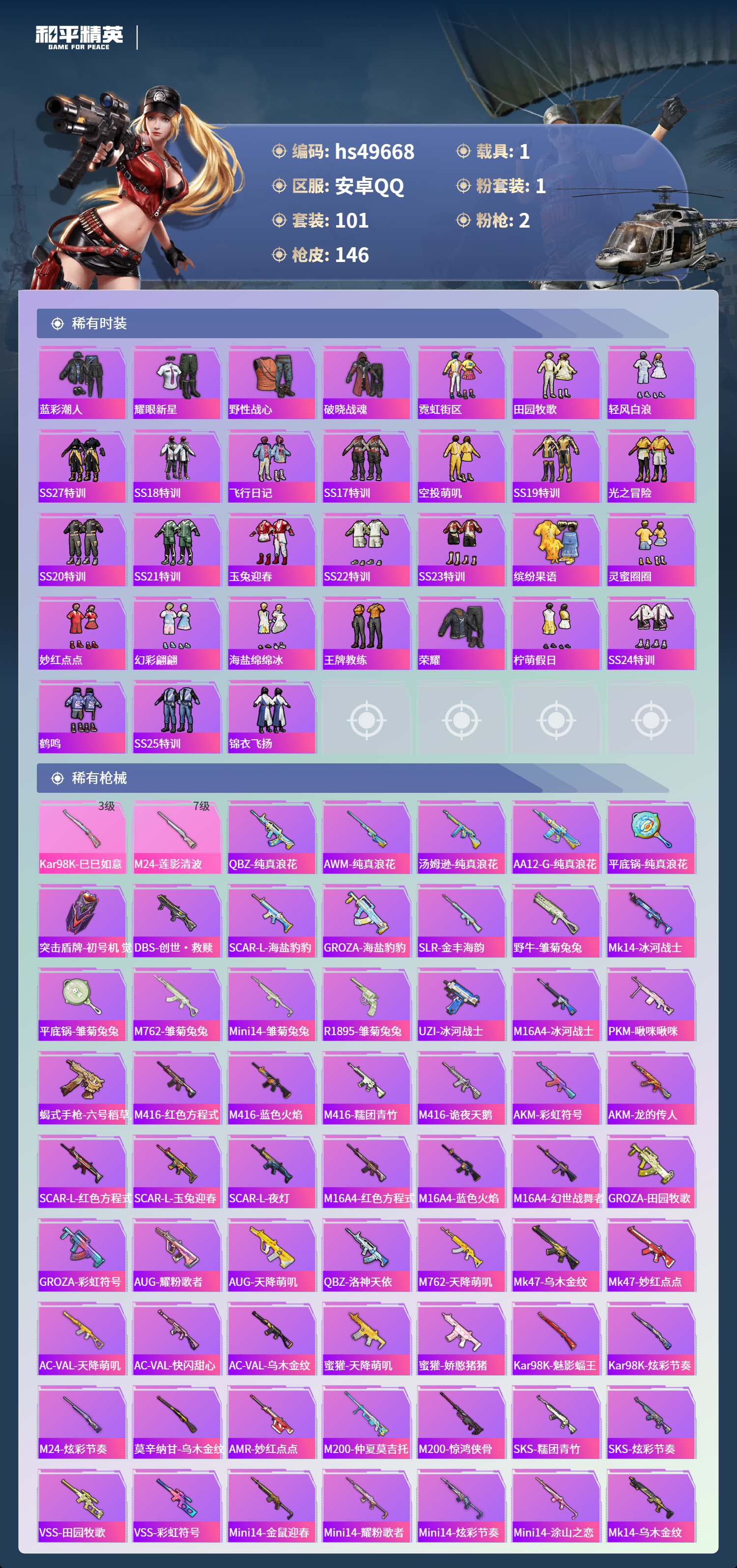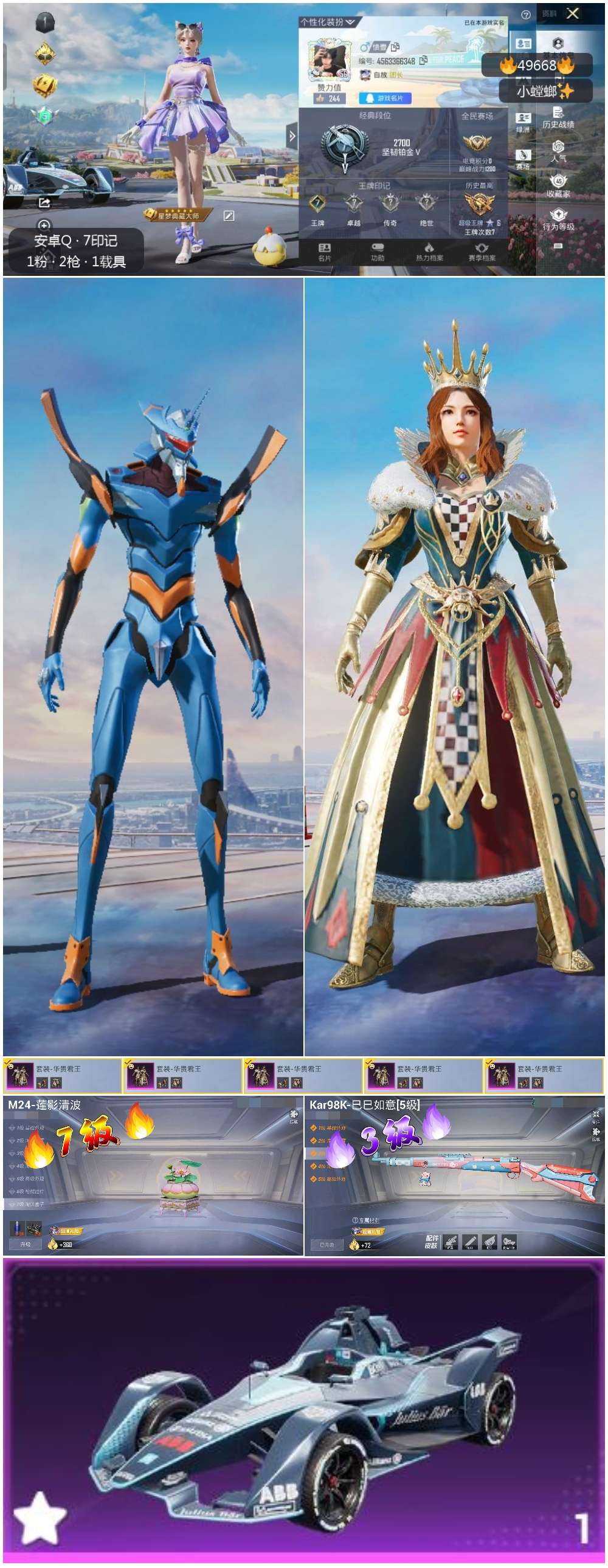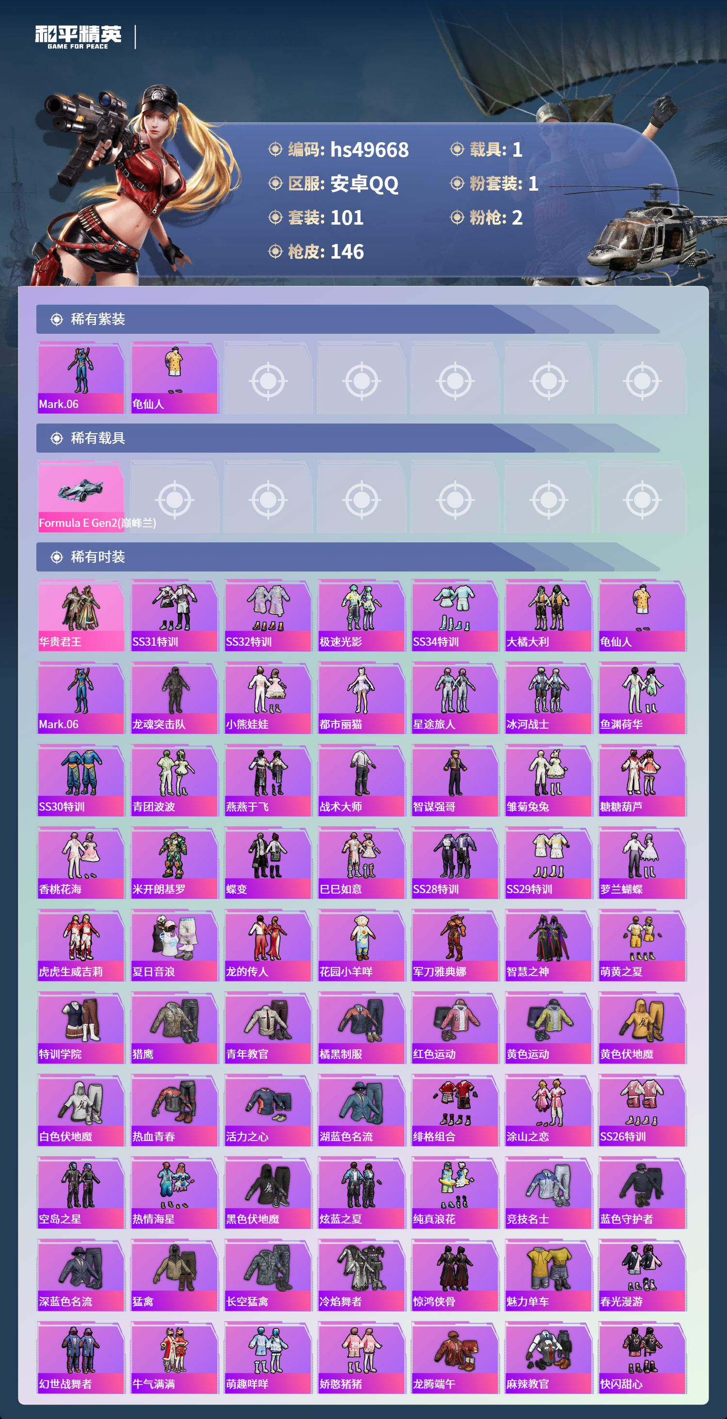 hs49668 安卓手q-7王牌印记-1粉装-2特效呛-1载具-38773热力值-101套装-146呛皮【1粉装】套装-华贵君王【2特效呛】kar98k-巳巳如意/3级m24-莲影清波/7级【2稀有紫装】mark.06龟仙人【1稀有载具】fmula e gen2巅峰兰【101稀有时装】ss31特训ss32特训极速光影ss34特训大橘大利龟仙人mark.06华贵君