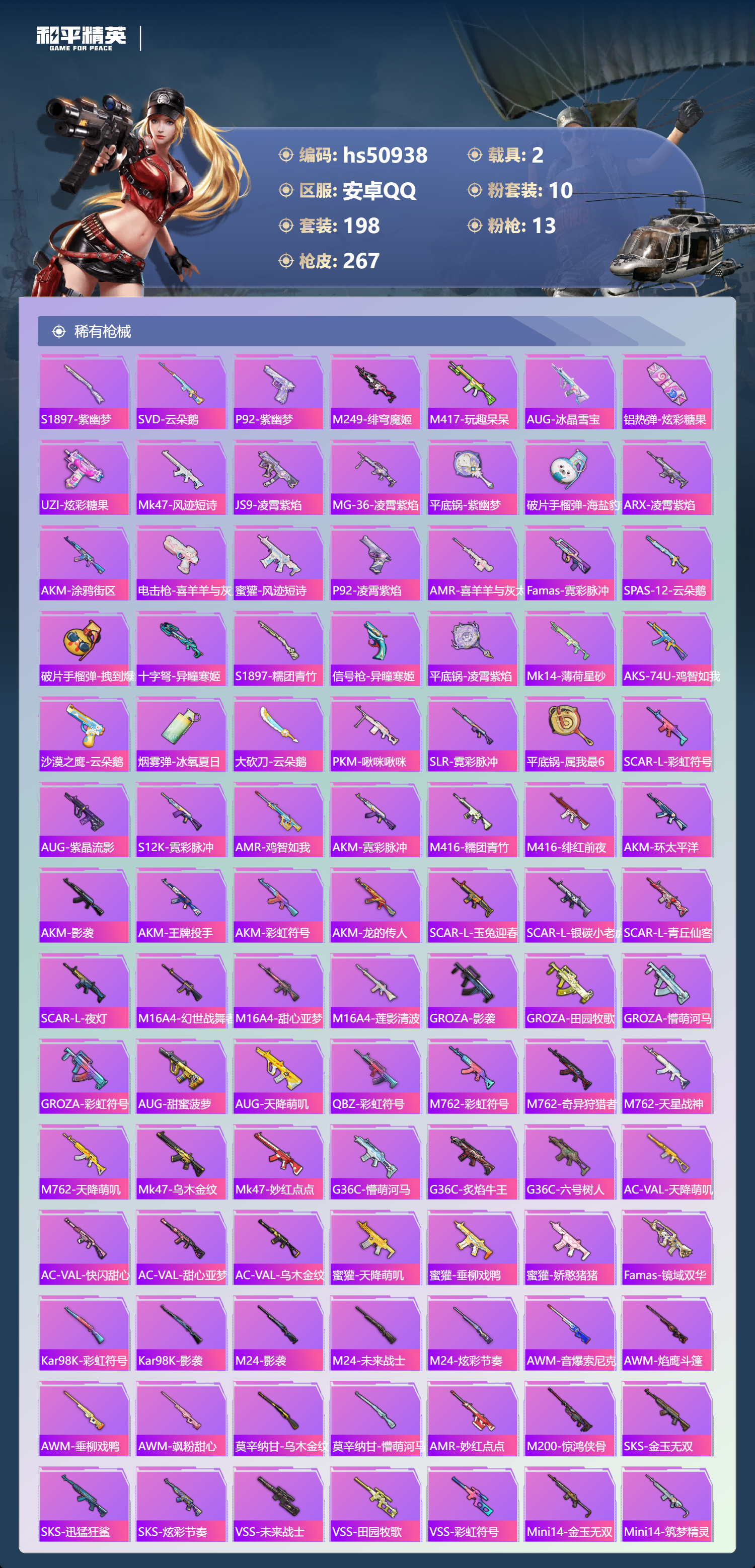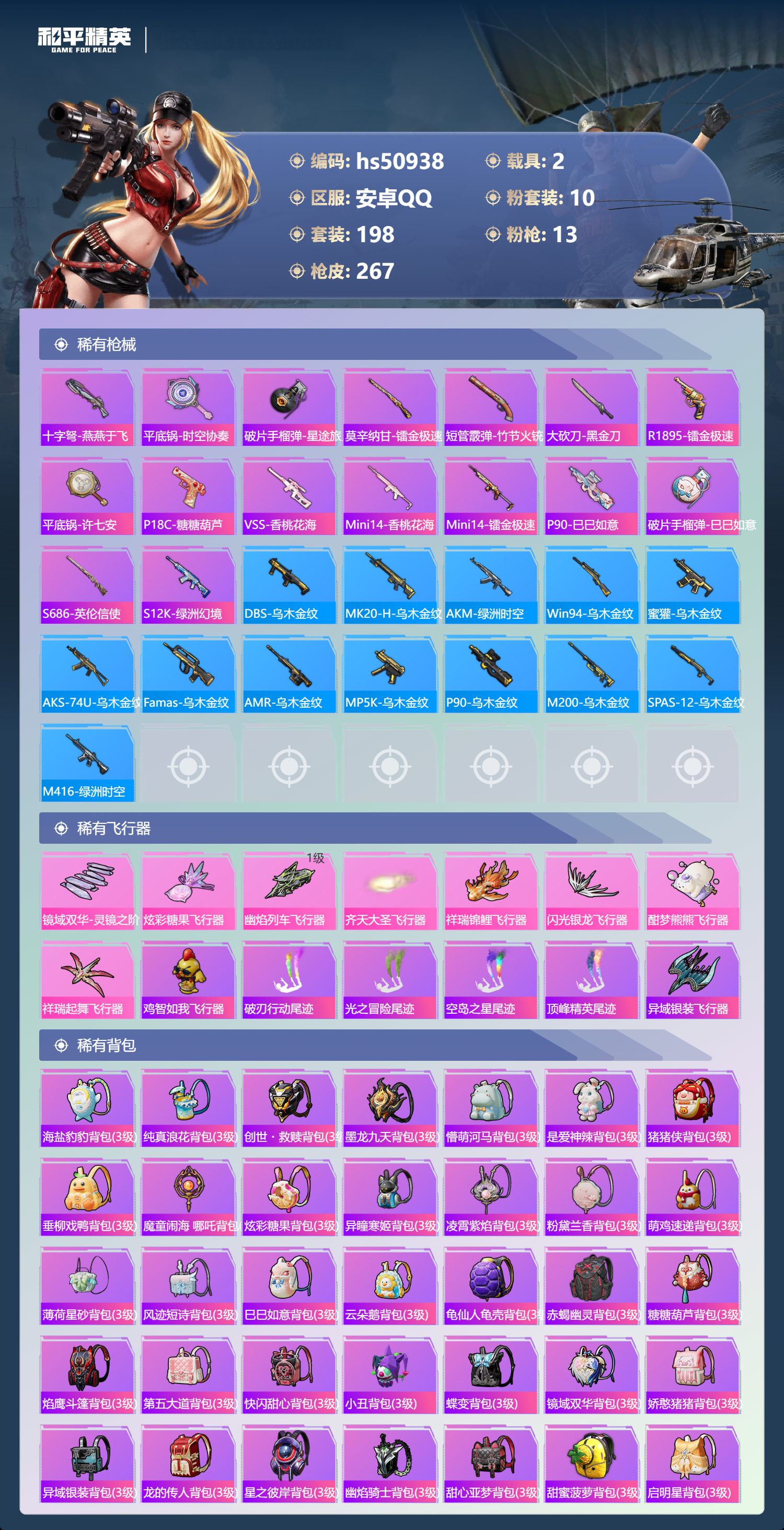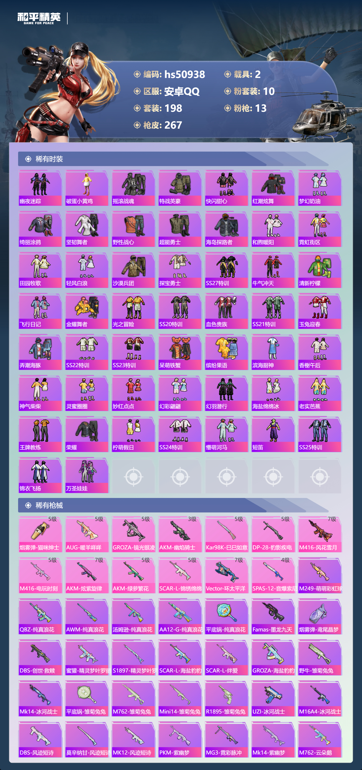 hs50938 安卓手q-16王牌印记-1红装-10粉装-13特效呛-2载具-热力值-198套装-267呛皮-1卓越印记【1红装】沙丘之主-图卡盟/5级【10粉装】套装-冰霜白皇角色-圣堂之誓套装-暗夜鎏金套装-怪诞乔克角色-异瞳寒姬角色-复仇流浪者套装-花间之火角色-智耀战神套装-绚金战神套装-寒光使者【13特效呛】akm-幽焰骑士/3级m416-风花雪月/