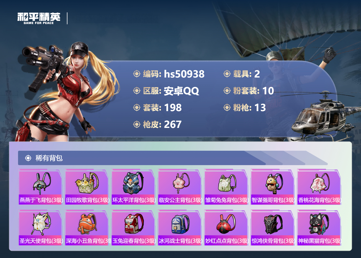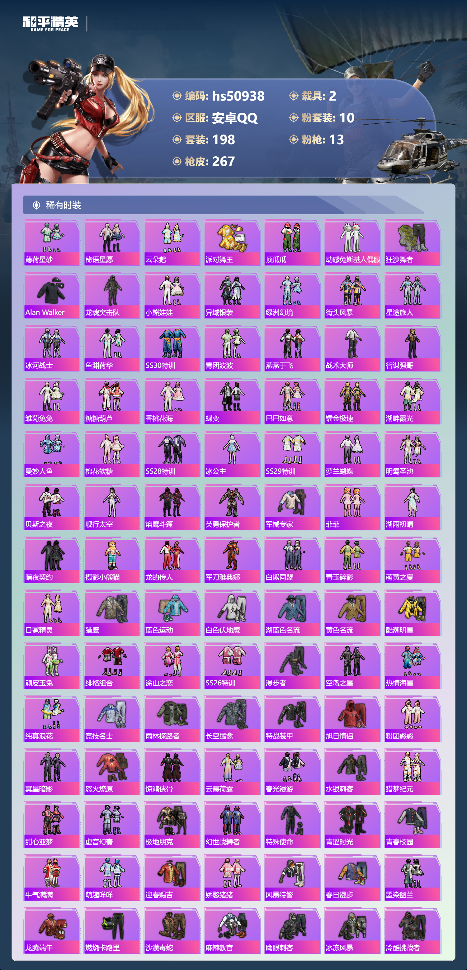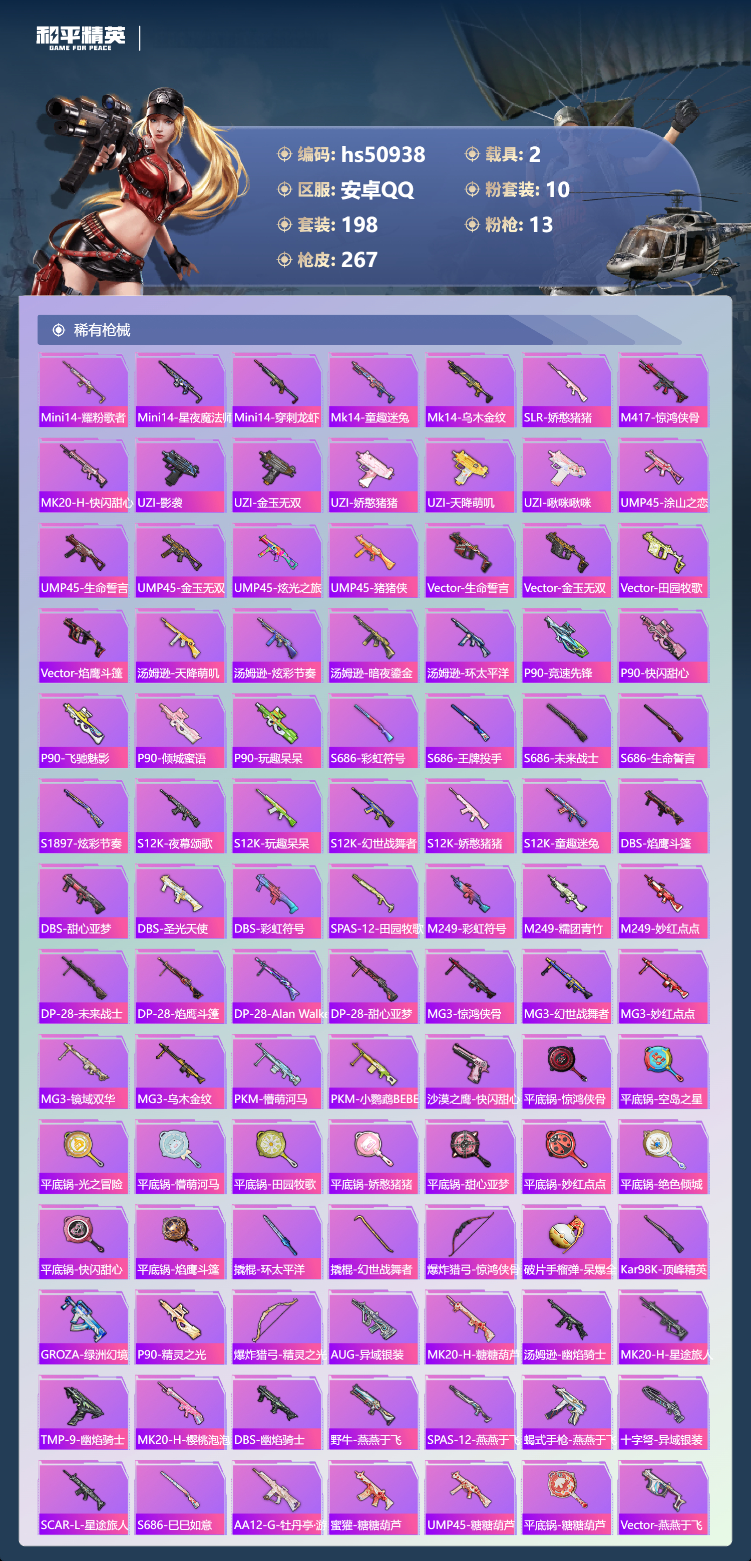 hs50938 安卓手q-16王牌印记-1红装-10粉装-13特效呛-2载具-热力值-198套装-267呛皮-1卓越印记【1红装】沙丘之主-图卡盟/5级【10粉装】套装-冰霜白皇角色-圣堂之誓套装-暗夜鎏金套装-怪诞乔克角色-异瞳寒姬角色-复仇流浪者套装-花间之火角色-智耀战神套装-绚金战神套装-寒光使者【13特效呛】akm-幽焰骑士/3级m416-风花雪月/