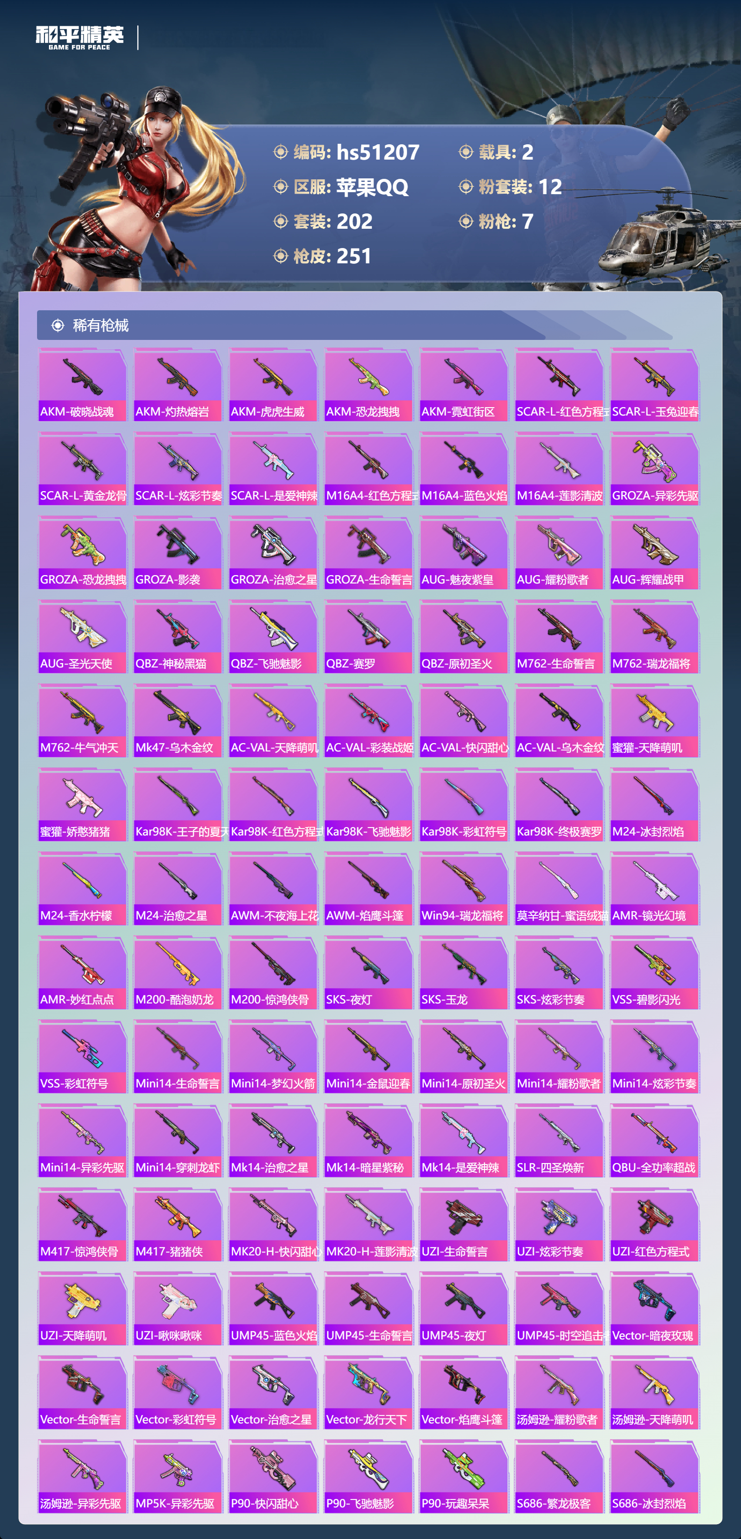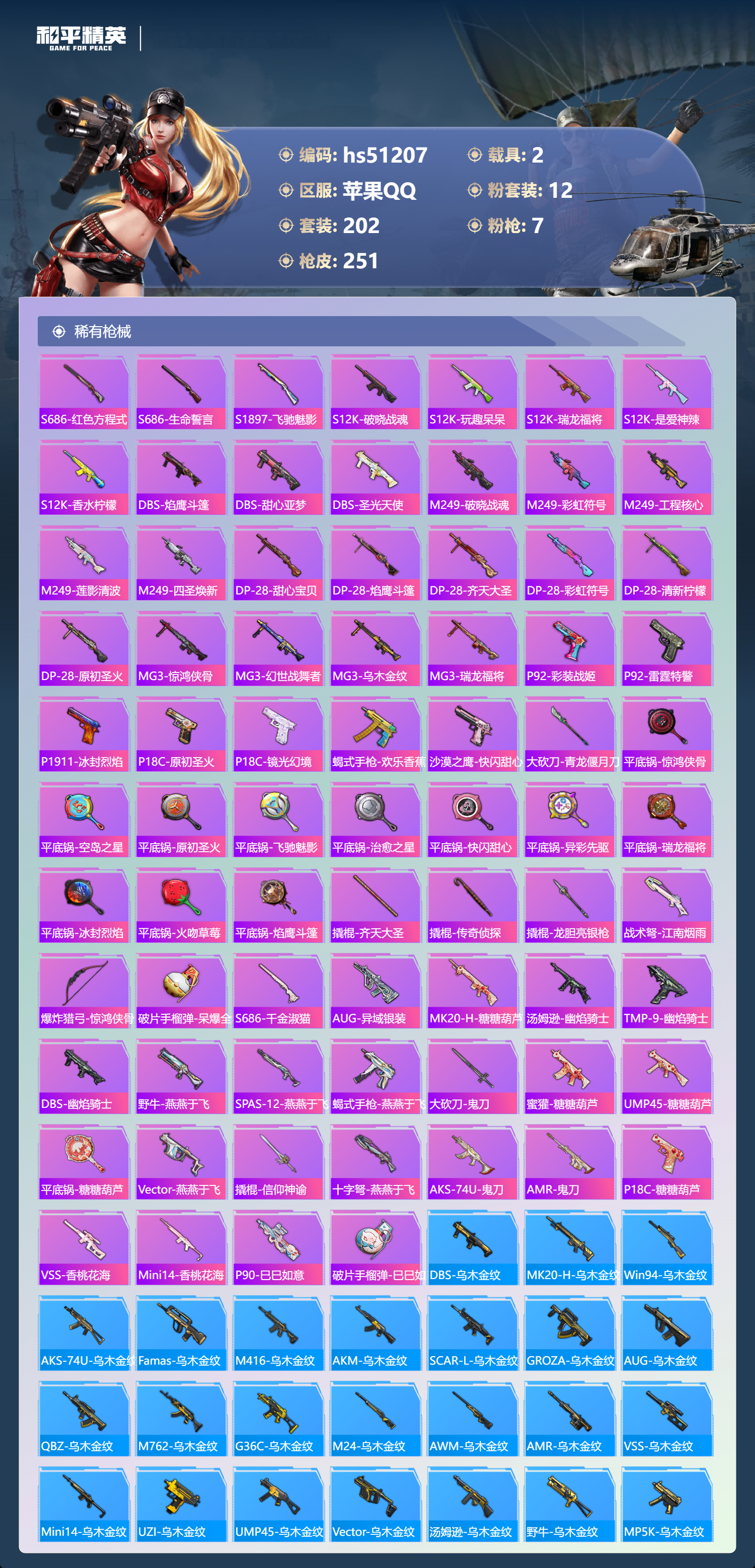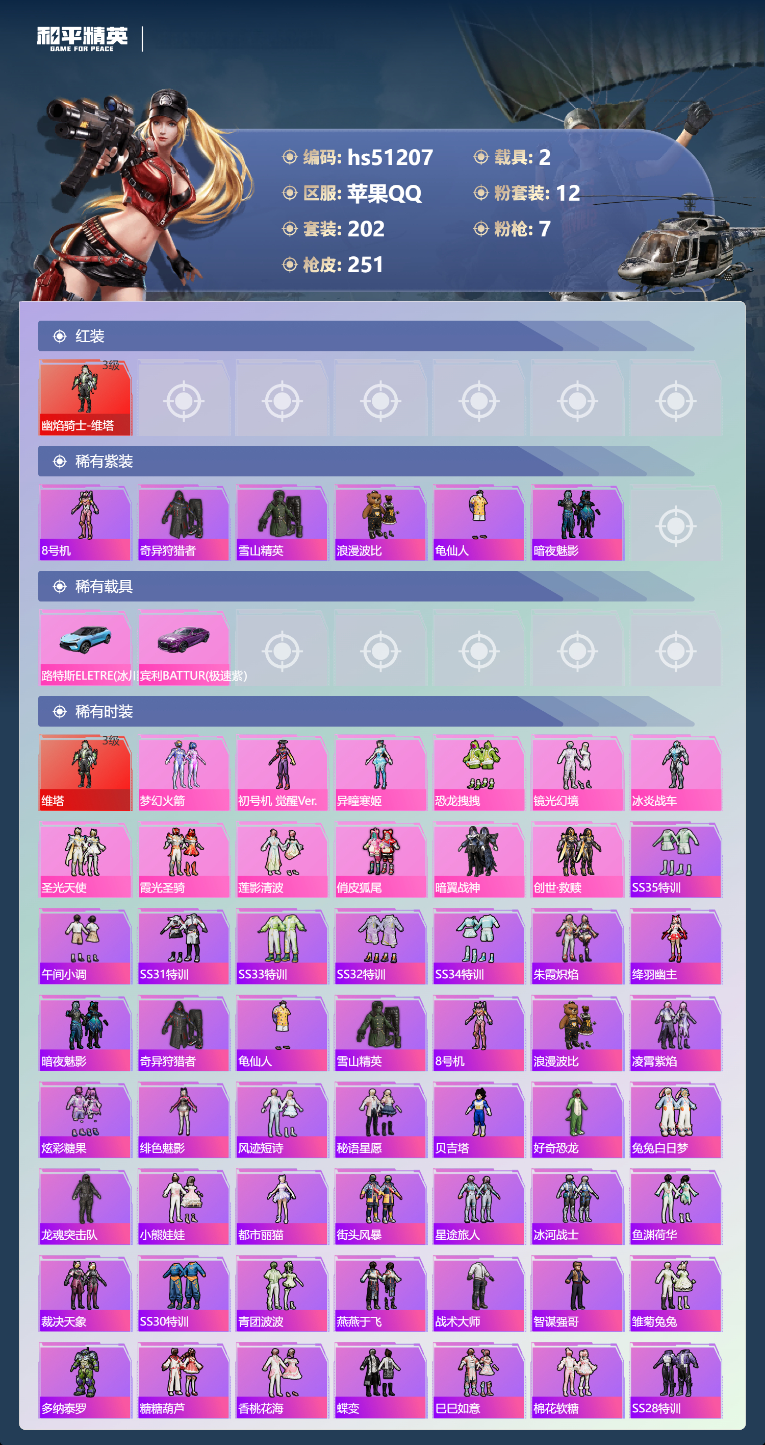 hs51207 苹果手q-11王牌印记-1红装-12粉装-7特效呛-2载具-86137热力值-202套装-251呛皮-2卓越印记【1红装】幽焰骑士-维塔/3级【12粉装】角色-冰炎战车角色-初号机 觉醒ver.套装-镜光幻境套装-莲影清波套装-恐龙拽拽角色-异瞳寒姬套装-暗翼战神套装-创世·救赎套装-梦幻火箭套装-霞光圣骑套装-圣光天使套装-俏皮狐尾【7特效呛】scar
