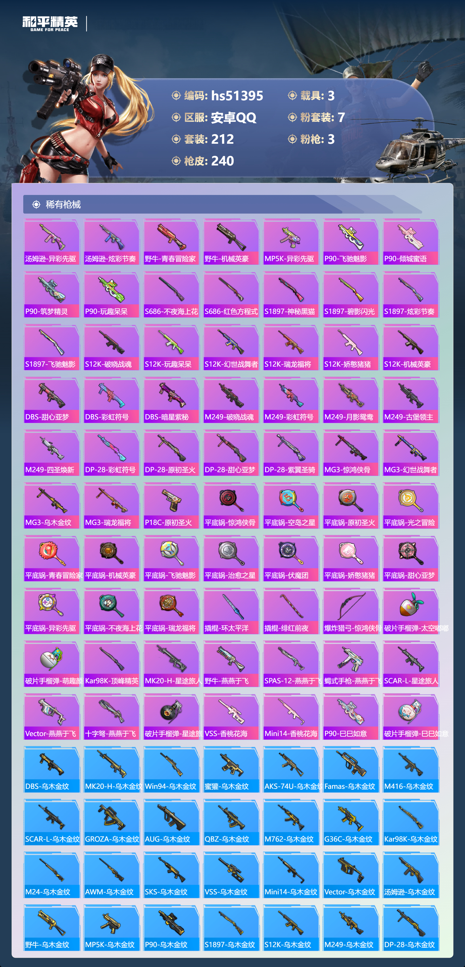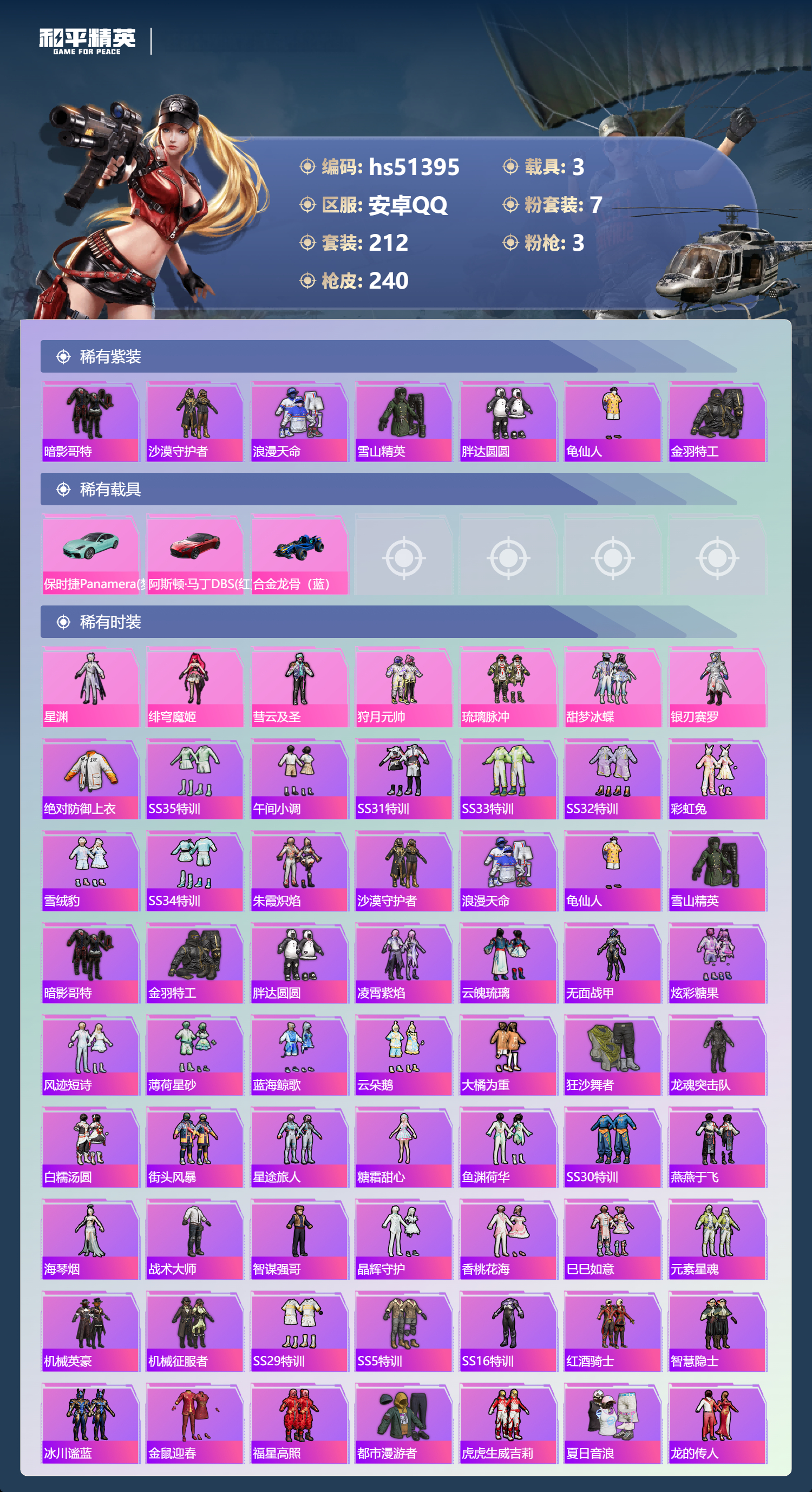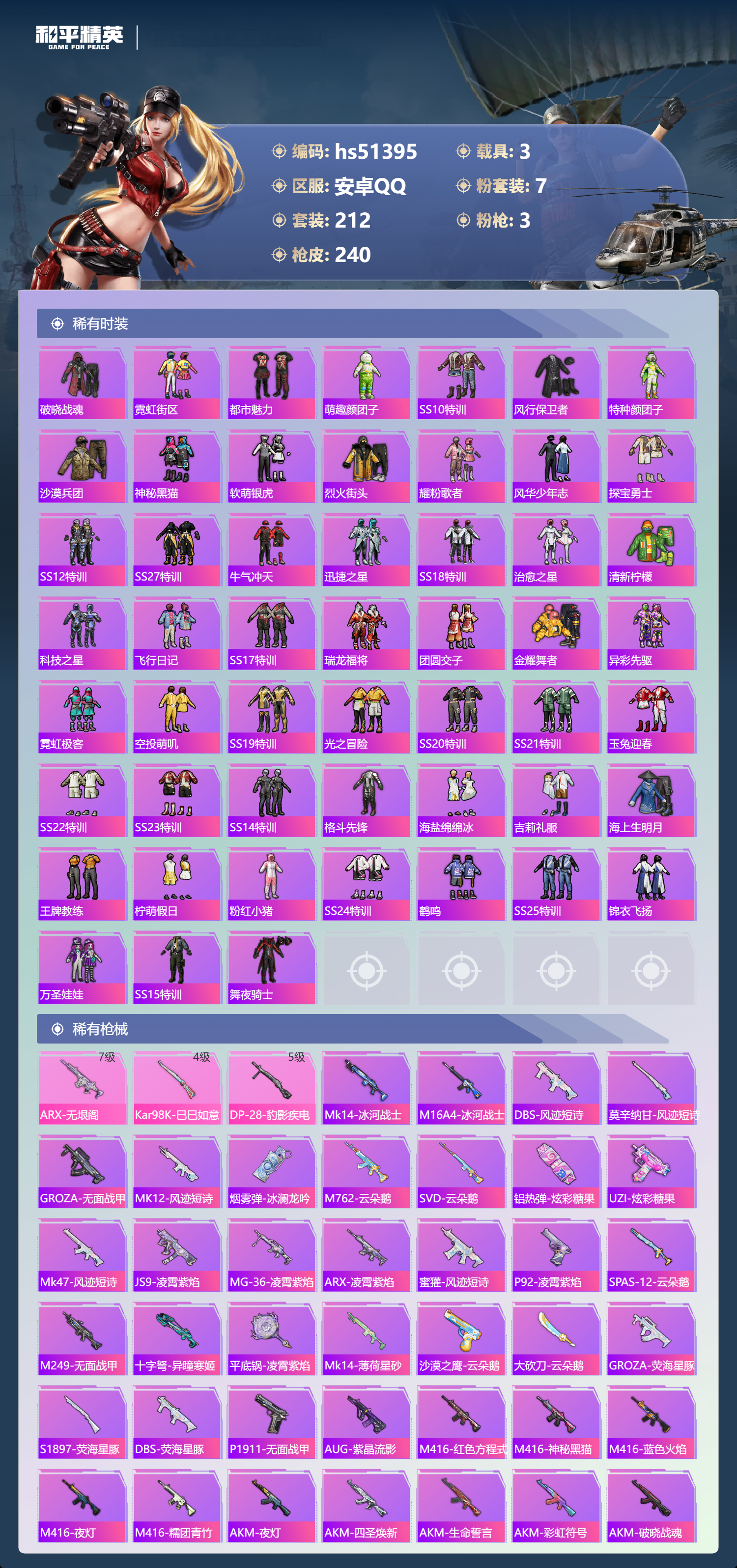 hs51395 安卓手q-13王牌印记-7粉装-3特效呛-3载具-80042热力值-212套装-240呛皮-4卓越印记-3传奇印记【7粉装】套装-甜梦冰蝶套装-彗云及圣角色-绯穹魔姬套装-琉璃脉冲角色-星渊套装-银刃赛罗套装-狩月元帅【3特效呛】dp-28-豹影疾电/5级arx-无垠阁/7级kar98k-巳巳如意/4级【8稀有紫装】巡查衣暗影哥特沙漠守护者浪漫天命雪山