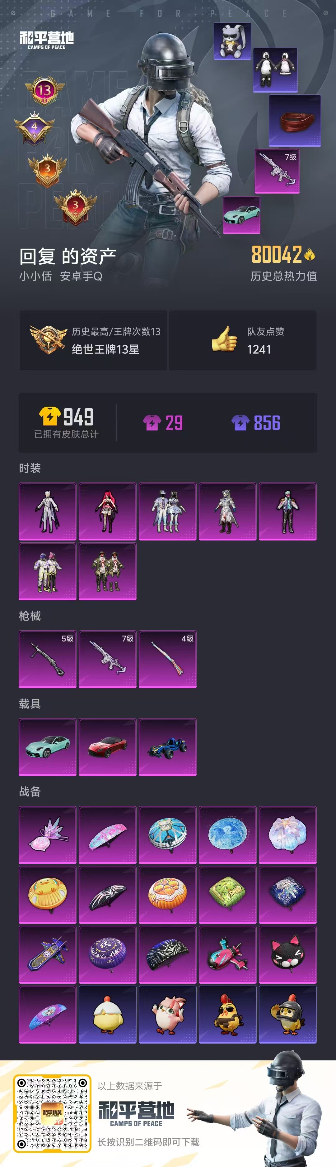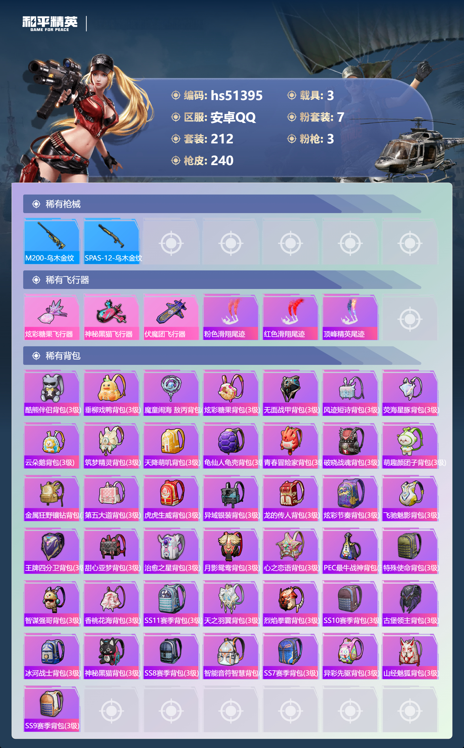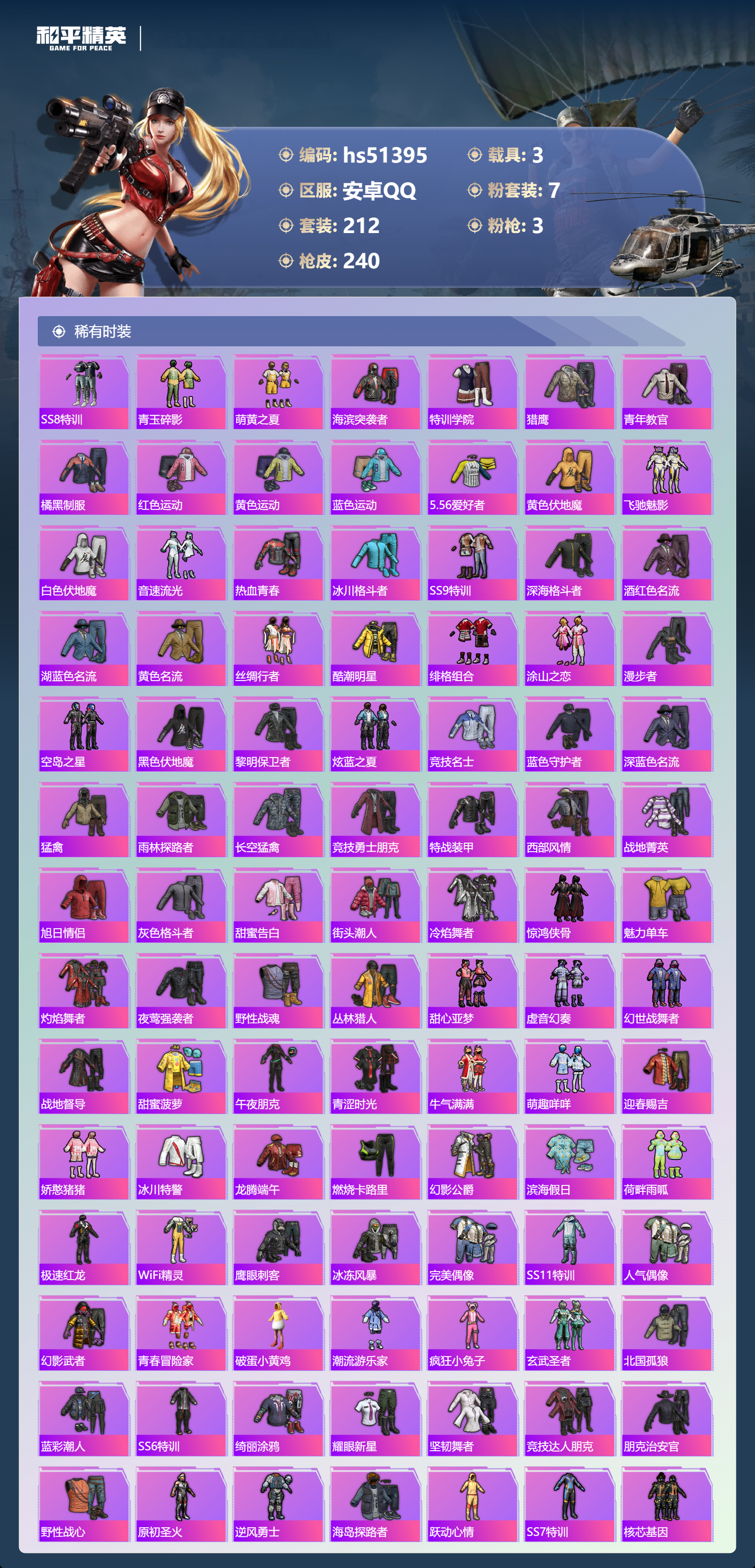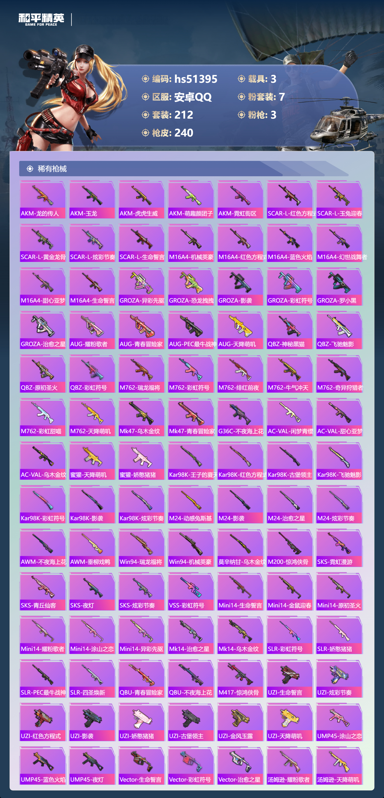 hs51395 安卓手q-13王牌印记-7粉装-3特效呛-3载具-80042热力值-212套装-240呛皮-4卓越印记-3传奇印记【7粉装】套装-甜梦冰蝶套装-彗云及圣角色-绯穹魔姬套装-琉璃脉冲角色-星渊套装-银刃赛罗套装-狩月元帅【3特效呛】dp-28-豹影疾电/5级arx-无垠阁/7级kar98k-巳巳如意/4级【8稀有紫装】巡查衣暗影哥特沙漠守护者浪漫天命雪山
