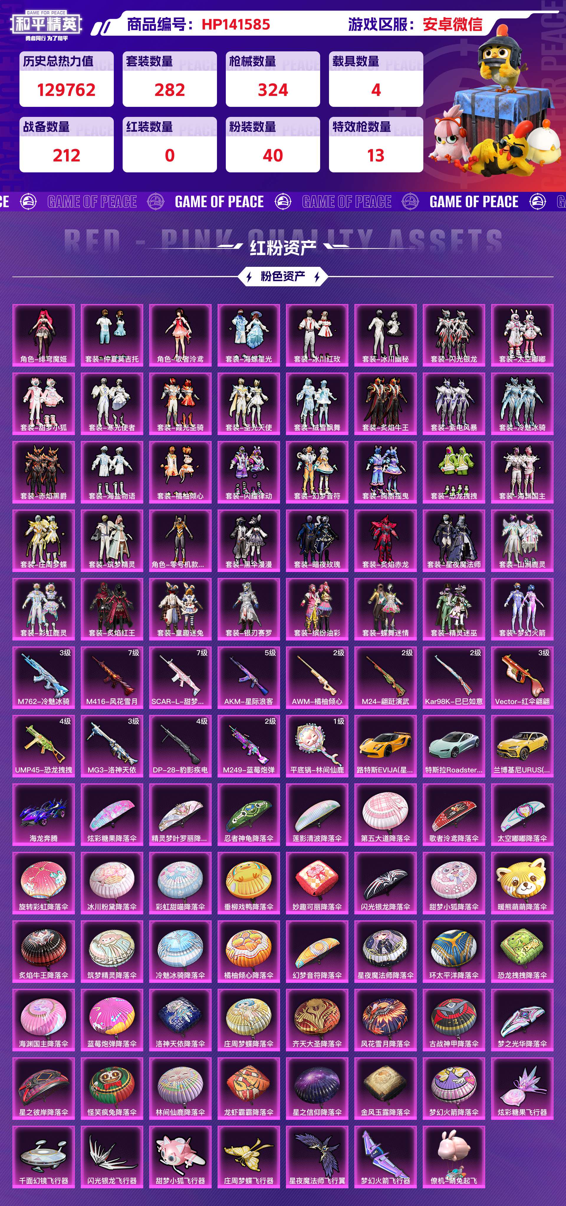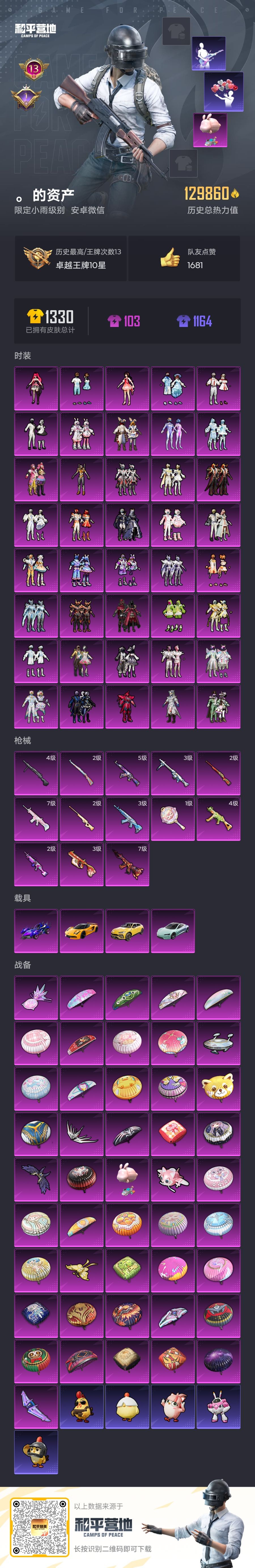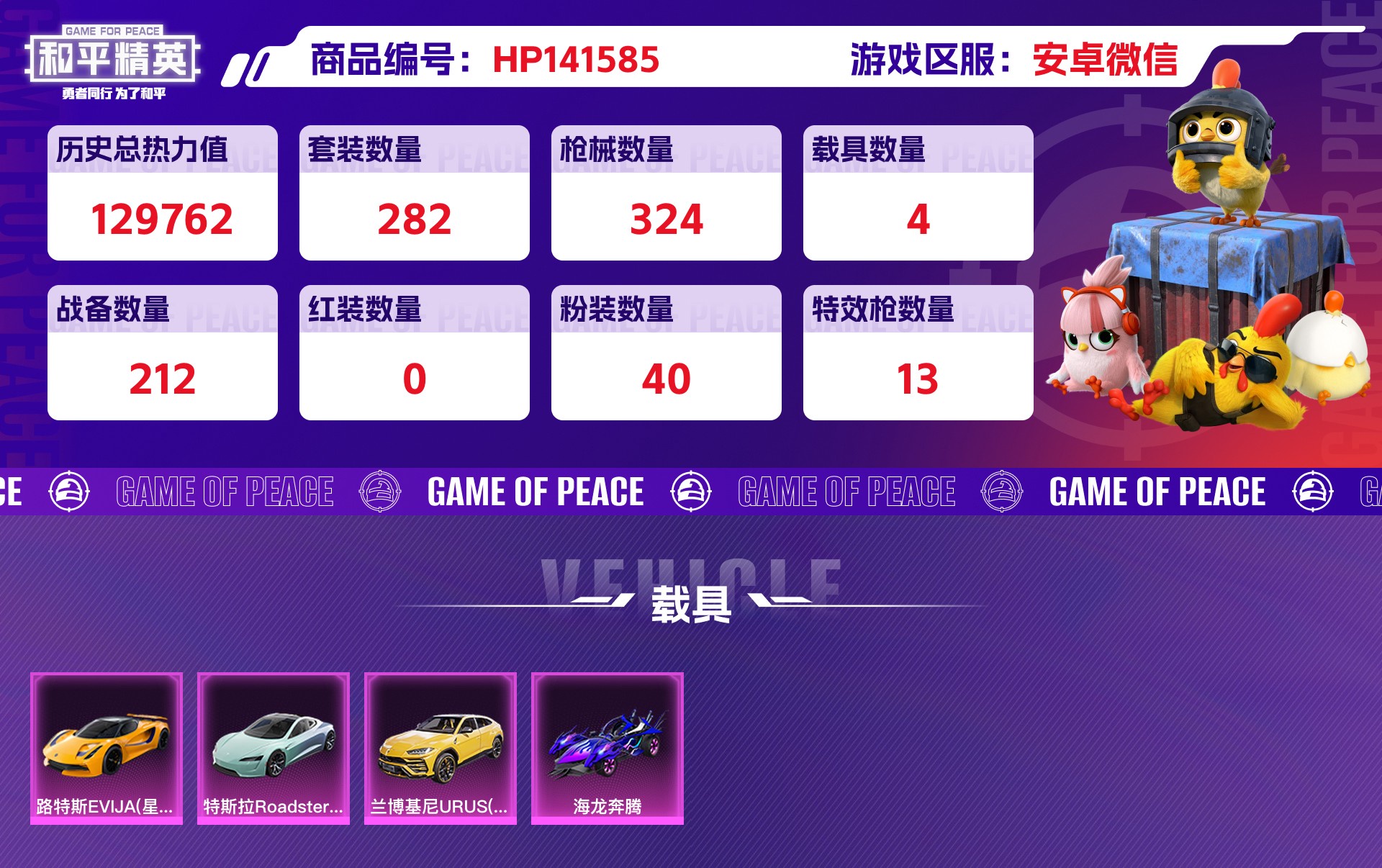 2284087-安卓微信 历史总热力值:129762 粉装数量:40 特效呛数量:13 载具数量:4 王牌印记:12 历史最高段位:卓越王牌10星 套装数量:282 时装数量:1060 呛械数量:324 战备数量:212 装备数量:504 载具:兰博基尼urus明艳黄特斯拉roadster水滴蓝海龙奔腾路特斯evija星际黄 时装:套装-仲夏莫吉托套装-冰川幽秘套装-冰
