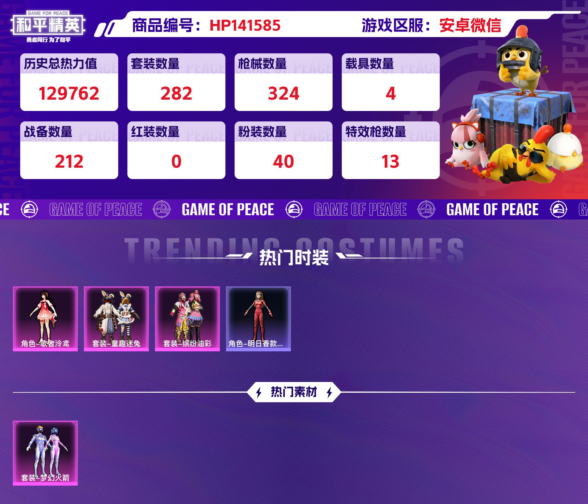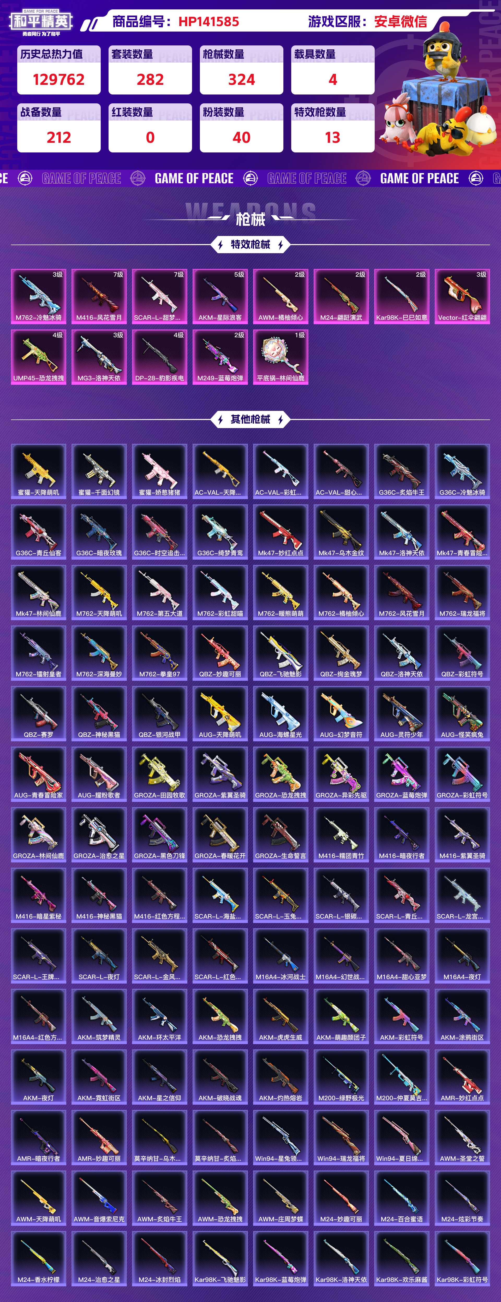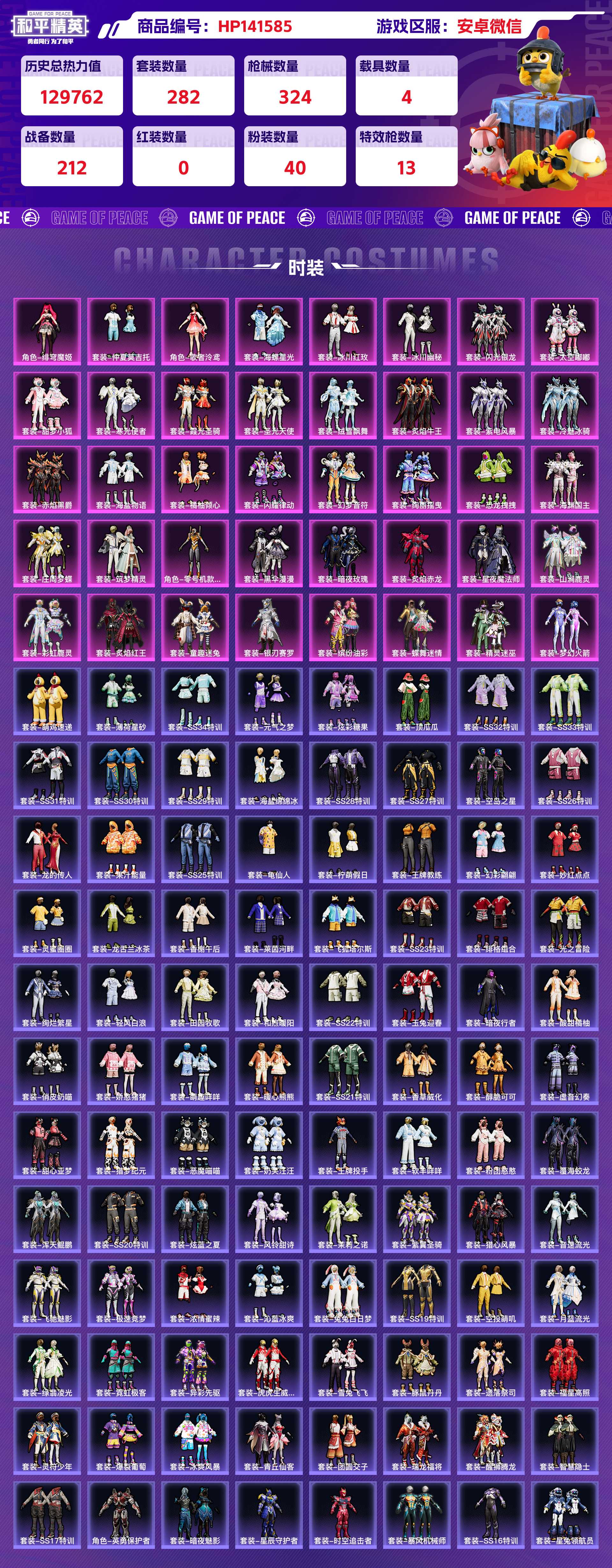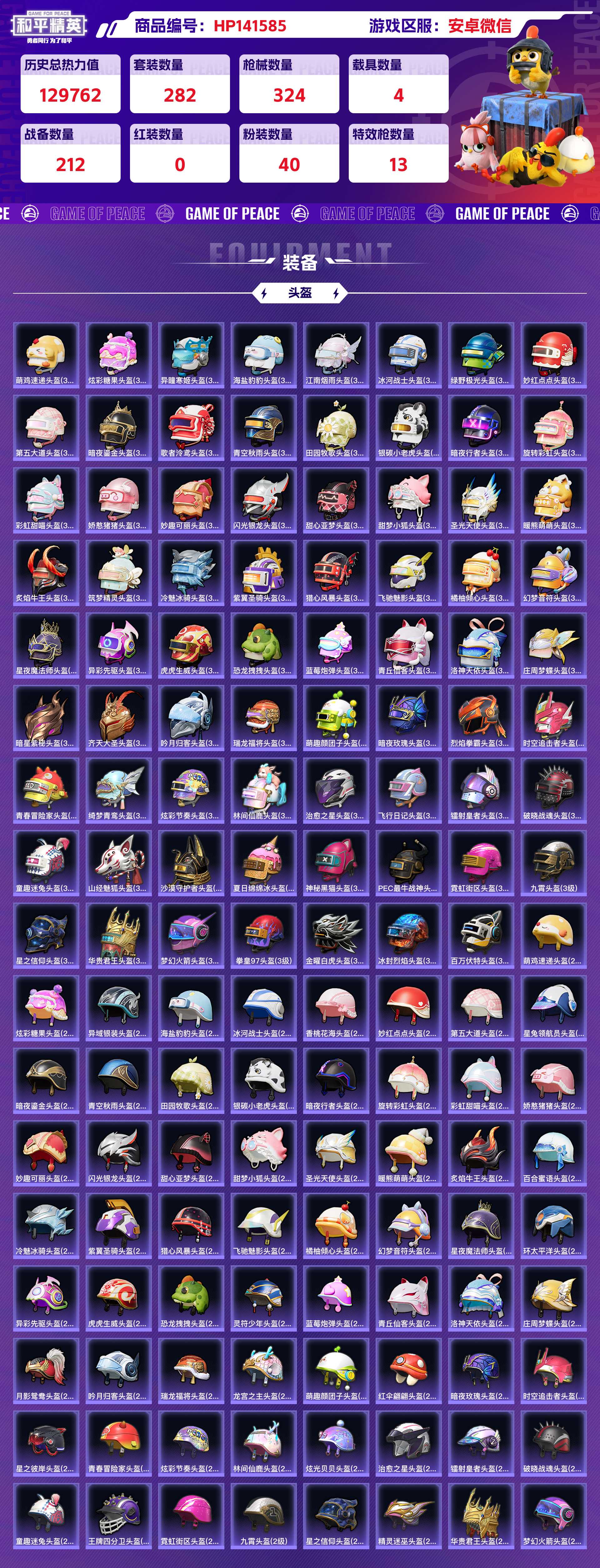 2284087-安卓微信 历史总热力值:129762 粉装数量:40 特效呛数量:13 载具数量:4 王牌印记:12 历史最高段位:卓越王牌10星 套装数量:282 时装数量:1060 呛械数量:324 战备数量:212 装备数量:504 载具:兰博基尼urus明艳黄特斯拉roadster水滴蓝海龙奔腾路特斯evija星际黄 时装:套装-仲夏莫吉托套装-冰川幽秘套装-冰