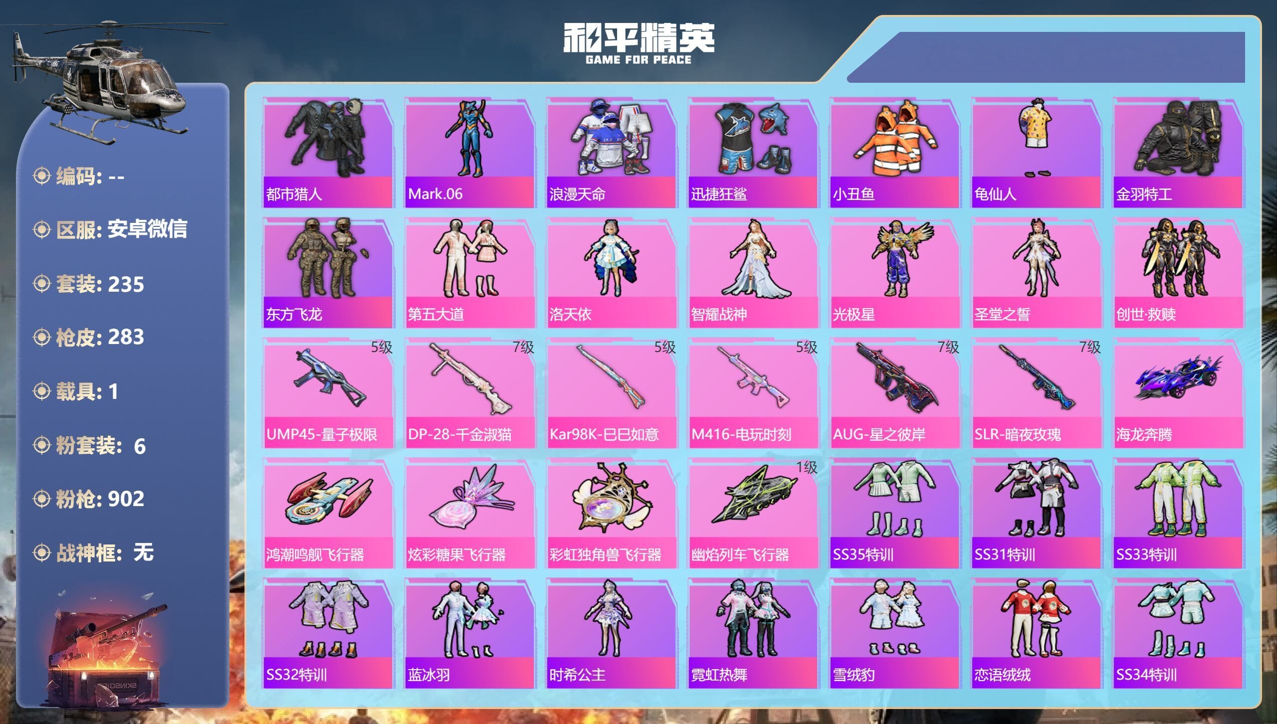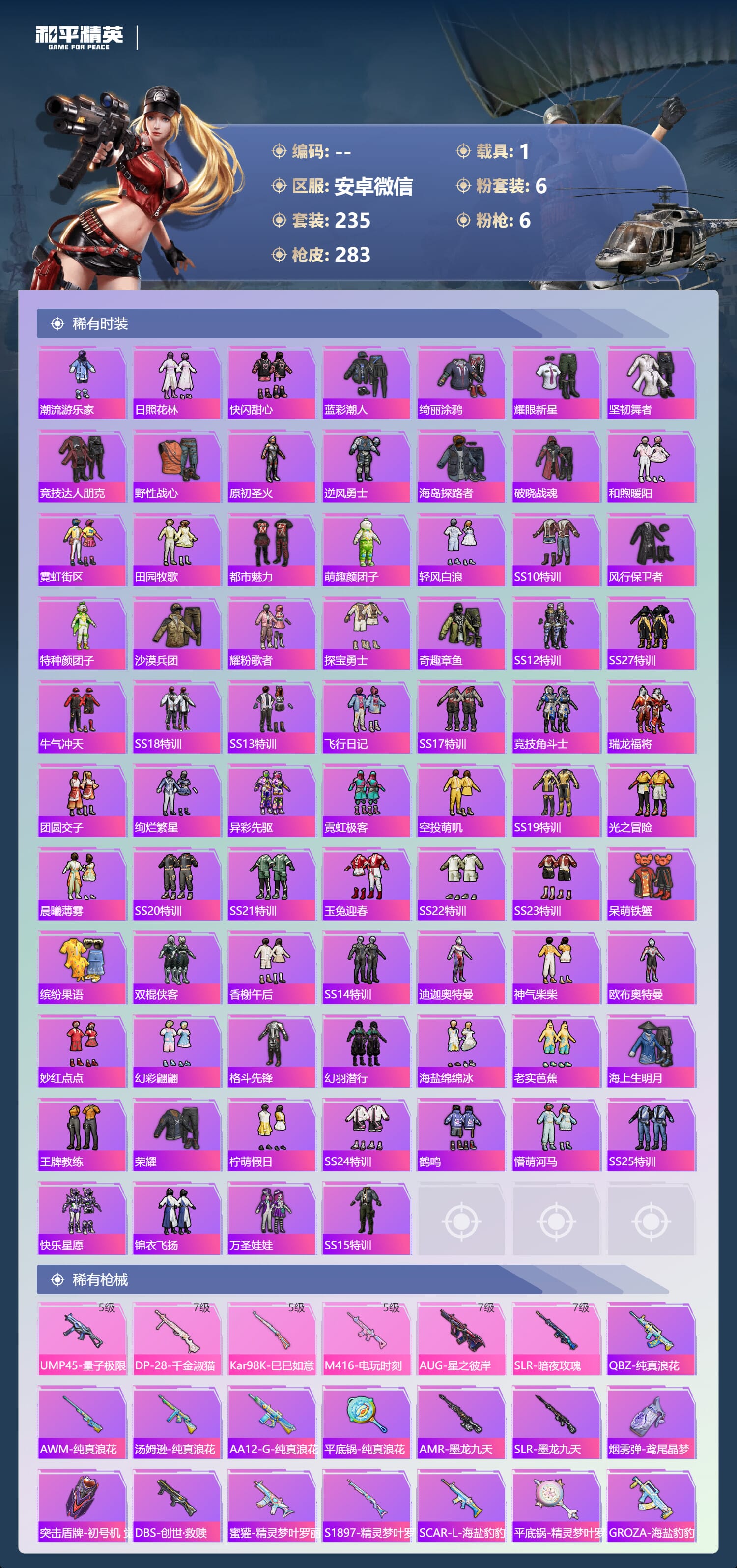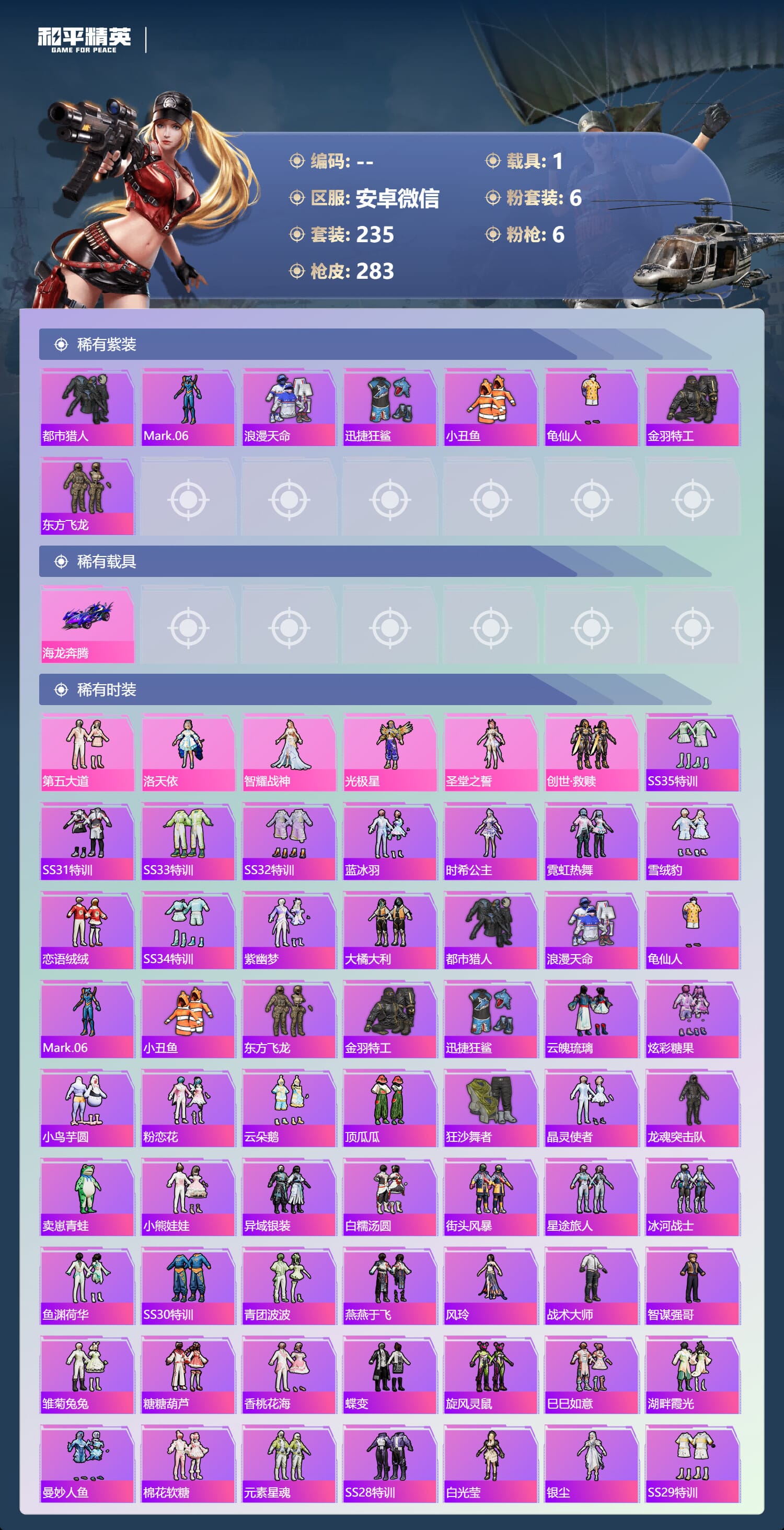 [14198029]实名: 不可修改 时装数: 902 载具数: 1 呛械数: 283 战备数: 237 热门装扮: 呆萌铁蟹万圣娃娃迅捷狂鲨鹰眼刺客都市猎人东方飞龙洛天依第五大道圣堂之誓光极星创世·救赎智耀战神 载具: 海龙奔腾 稀有呛皮: aug星之彼岸slr暗夜玫瑰m416电玩时刻ump45量子极限dp-28-千金淑猫kar98k-巳巳如意