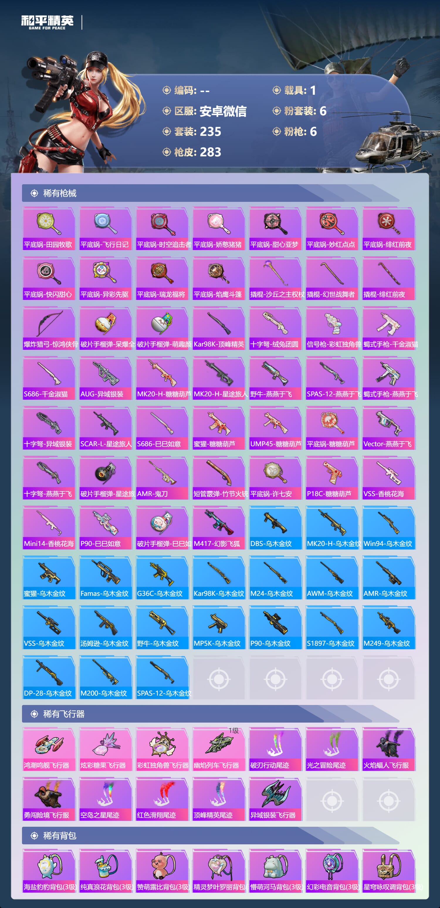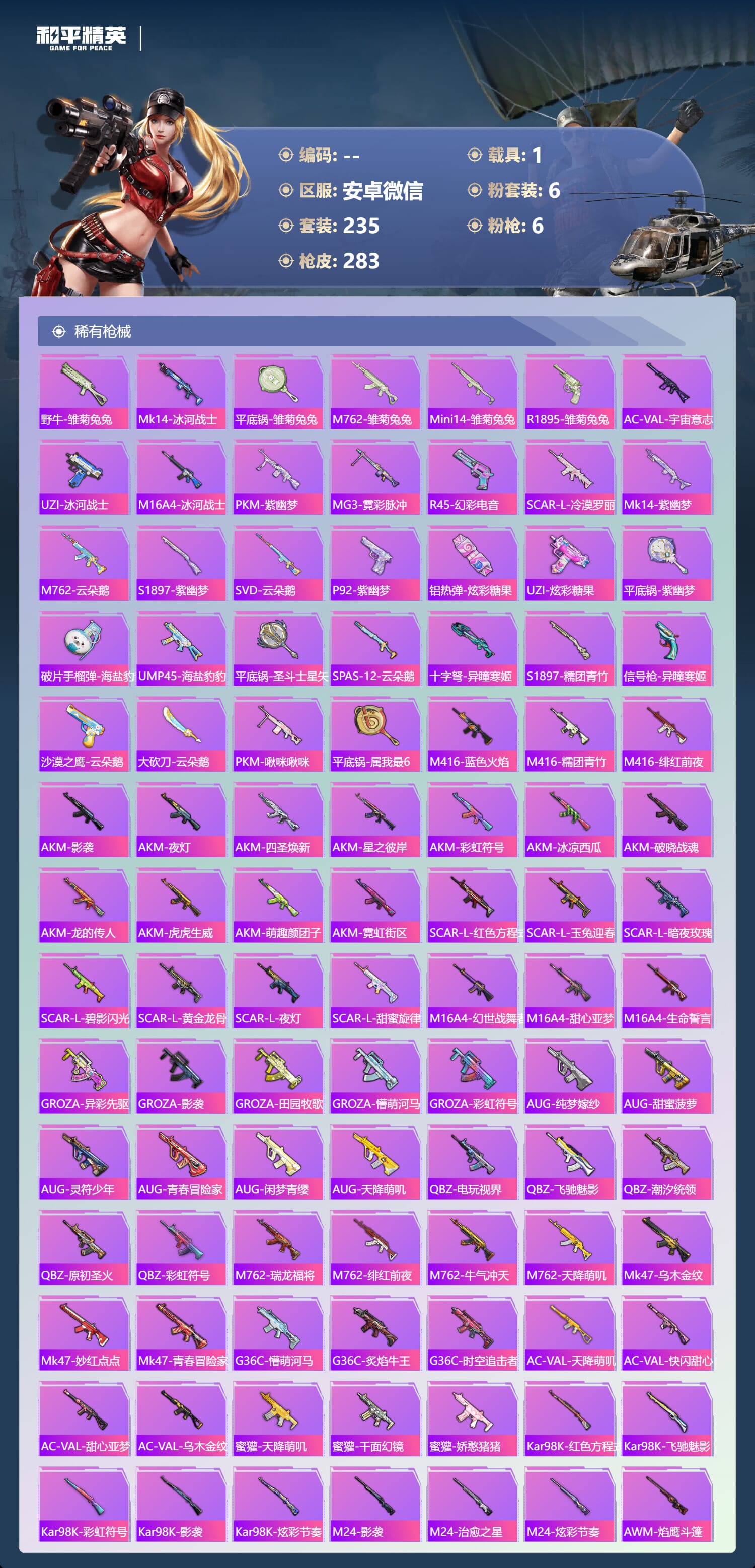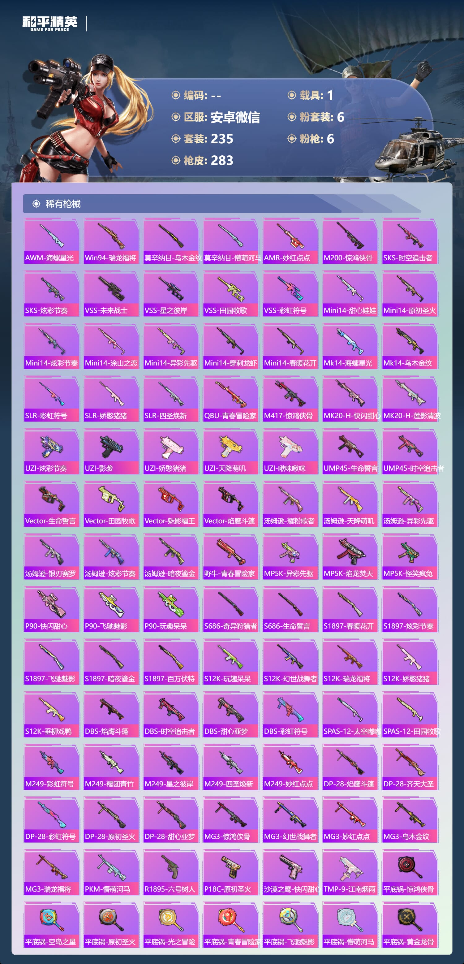 [14198029]实名: 不可修改 时装数: 902 载具数: 1 呛械数: 283 战备数: 237 热门装扮: 呆萌铁蟹万圣娃娃迅捷狂鲨鹰眼刺客都市猎人东方飞龙洛天依第五大道圣堂之誓光极星创世·救赎智耀战神 载具: 海龙奔腾 稀有呛皮: aug星之彼岸slr暗夜玫瑰m416电玩时刻ump45量子极限dp-28-千金淑猫kar98k-巳巳如意