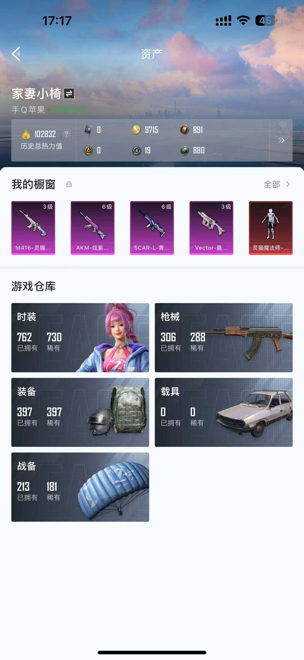 苹果 手q【无敌战神 3级塞维尔 新101都市满级m4风花雪月】-无敌战神框-1神装-8粉装-14特效呛-0载具-3粉色飞行器-102832热力值-19王牌印记-208套装-306呛皮 【红色神装等级】:灵猫魔法师-塞维尔三级 【红色角色神装】:灵猫魔法师-塞维尔 【热门品类】:粉装-梦幻火箭,套装-浪漫天命,套装-都市猎人,套装-奇异狩猎者,套装-金羽特工,套装-龟仙人,套装-粉红小猪,